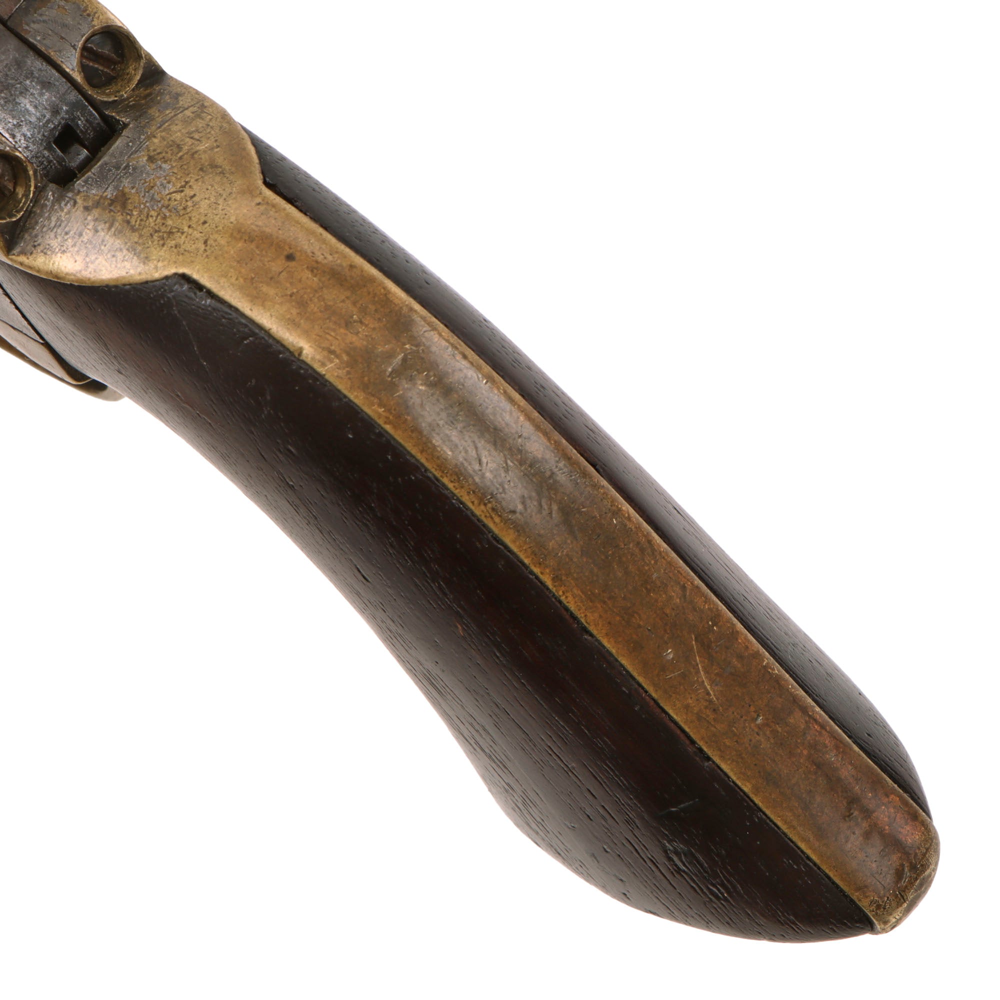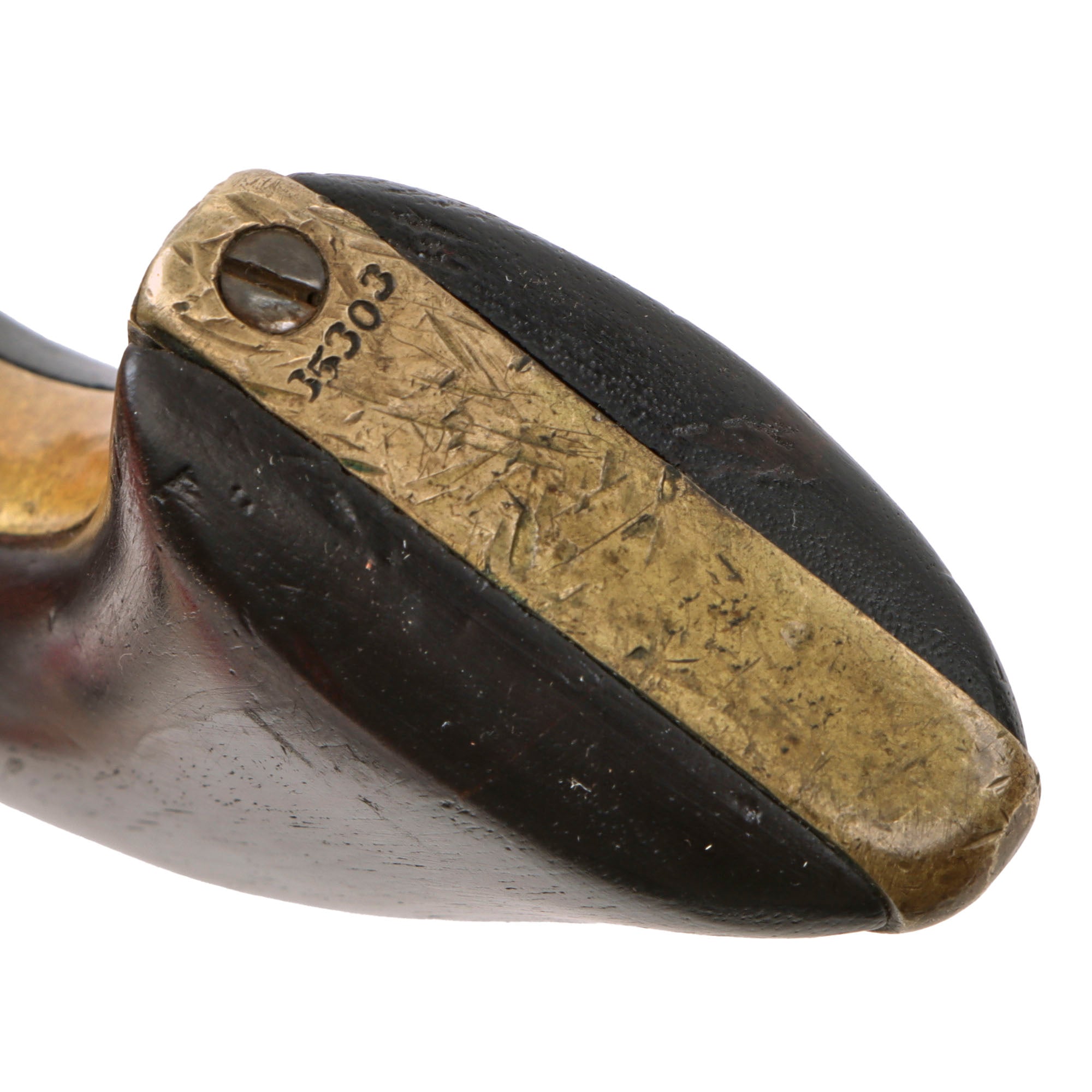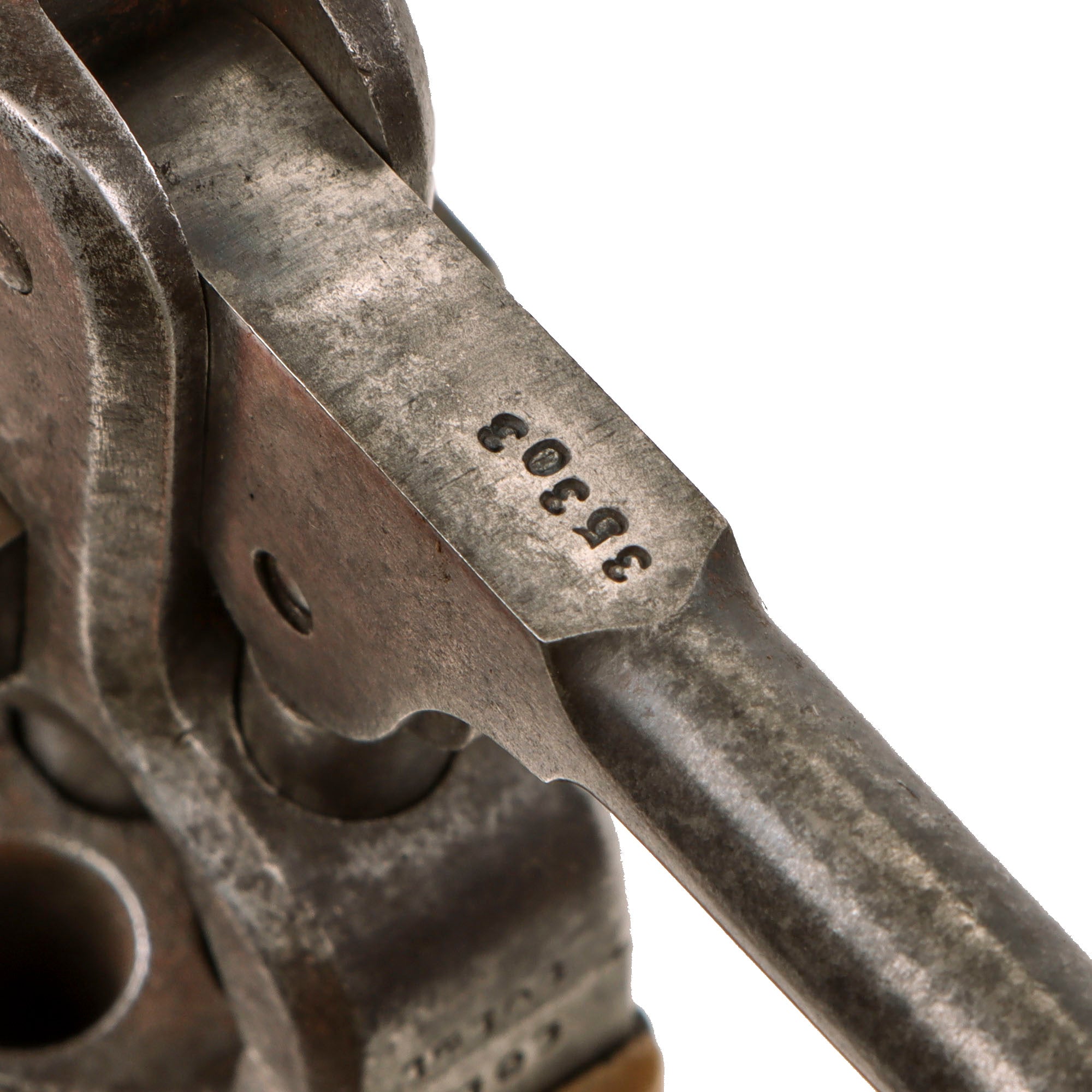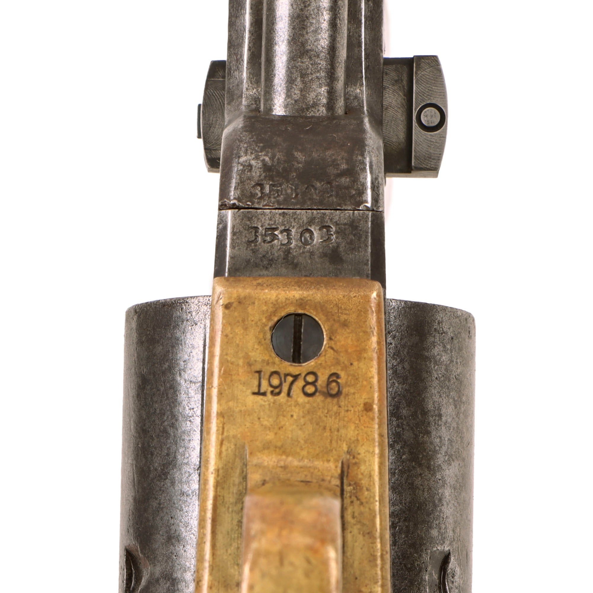This lovely lightly patinated service used example features a standard 7 1/2" barrel, and is marked with serial number 19786 on the trigger guard, which indicates production during 1852, VERY early in production. The other components are marked 35303, with the arbor pin marked with a shortened 5 3 0 3, and the barrel wedge is unmarked. Unlike the trigger guard number, these are not in the correct font used by Colt for serial numbers. However, they definitely do not look to be remarked, and do not see evidence of prior marks being removed, which would definitely have left some type of depression in the metal. At present we are not able to explain this, except maybe that parts were remarked at some point, or maybe were never marked in the first place. We assume this revolver is Civil War production, and would have seen action during the conflict.