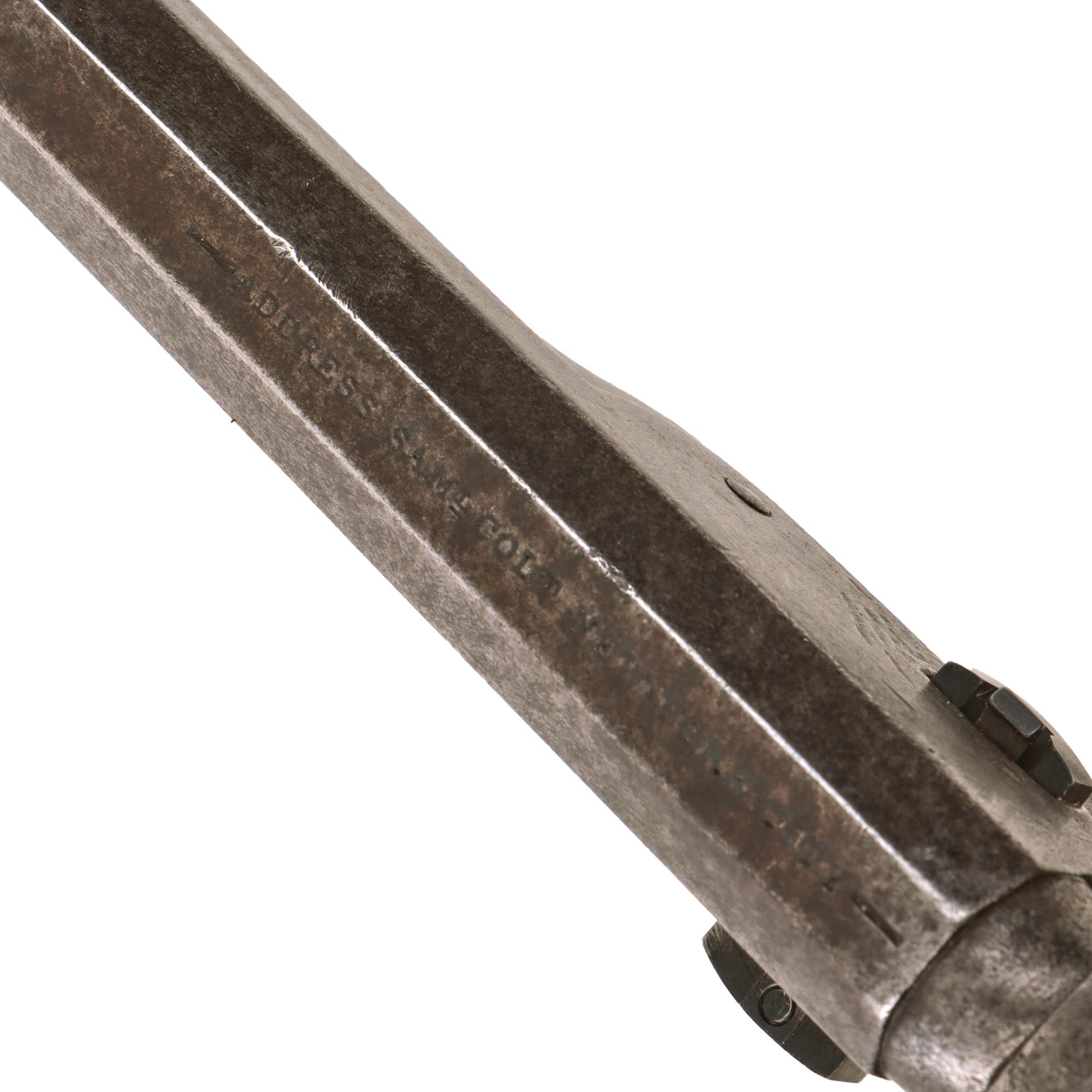 Like most Civil War Era Colt percussion revolvers we see, the cylinder "Naval Engagement Scene" is almost completely worn away, though there is still a relatively clear COLTS PATENT № marking present next to the serial number. The top of the barrel still has the Colt Early Pattern "New York" address marking fully intact: