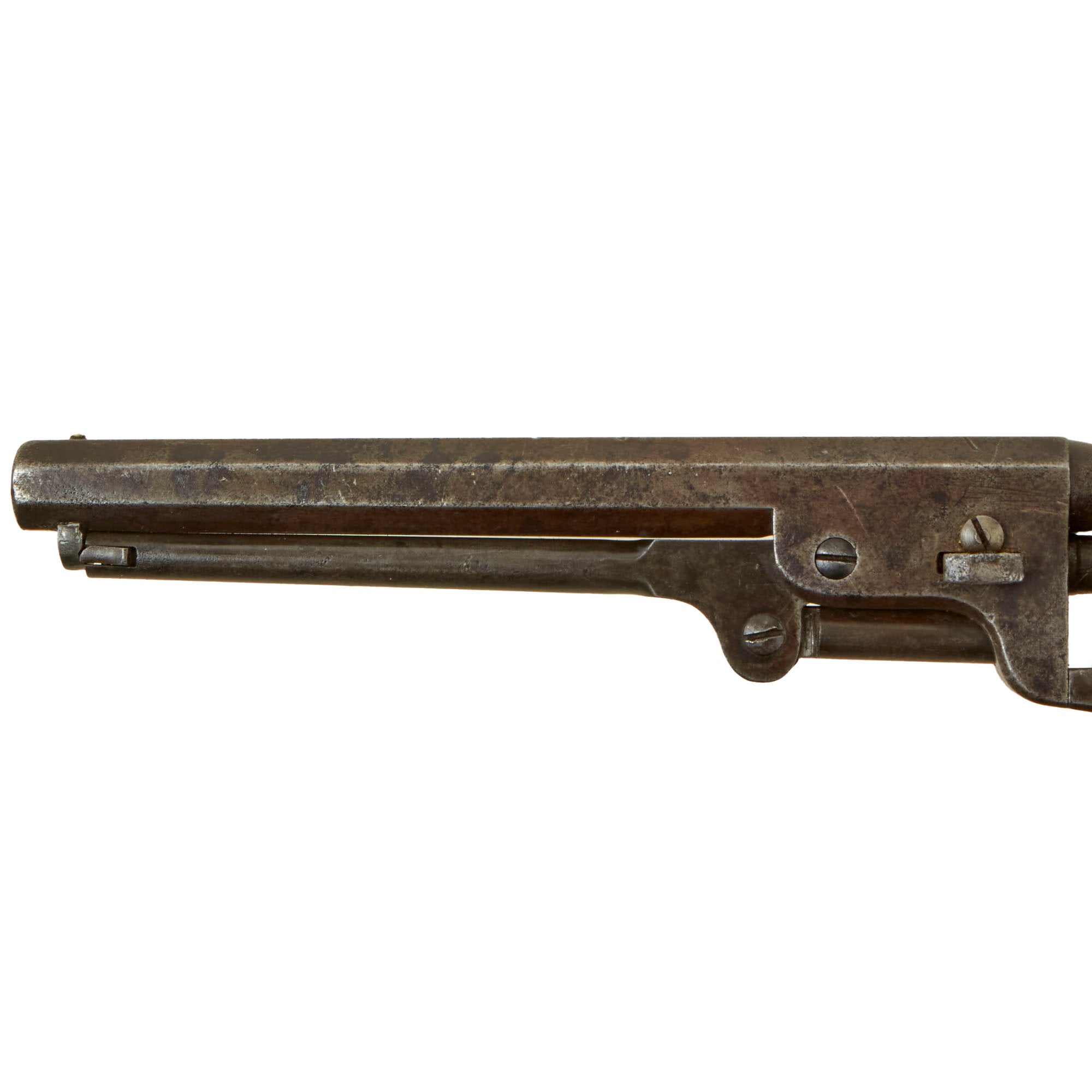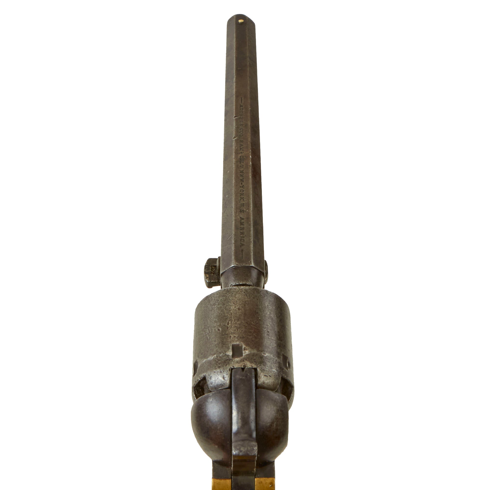 Unlike most that we see, there is still about 50% of the "Naval Engagement Scene" on the cylinder is still present, and the COLT'S PATENT No. next to the cylinder serial is still clear. We often see these markings completely worn away, so this is definitely a rare treat! The top of the barrel still has the Colt "New York" address marking fully intact and crisp:-
