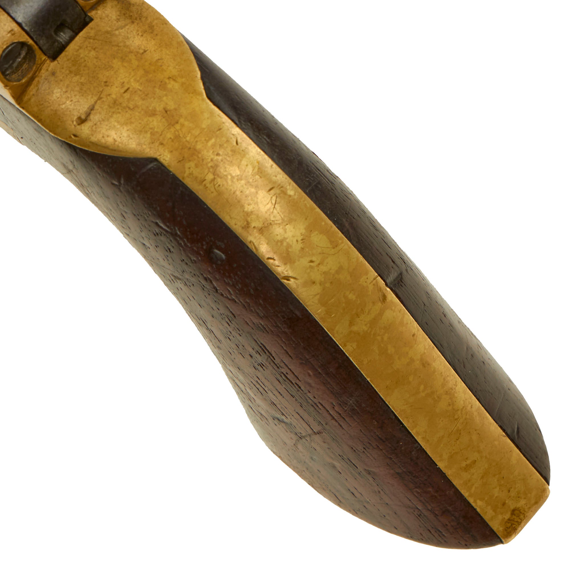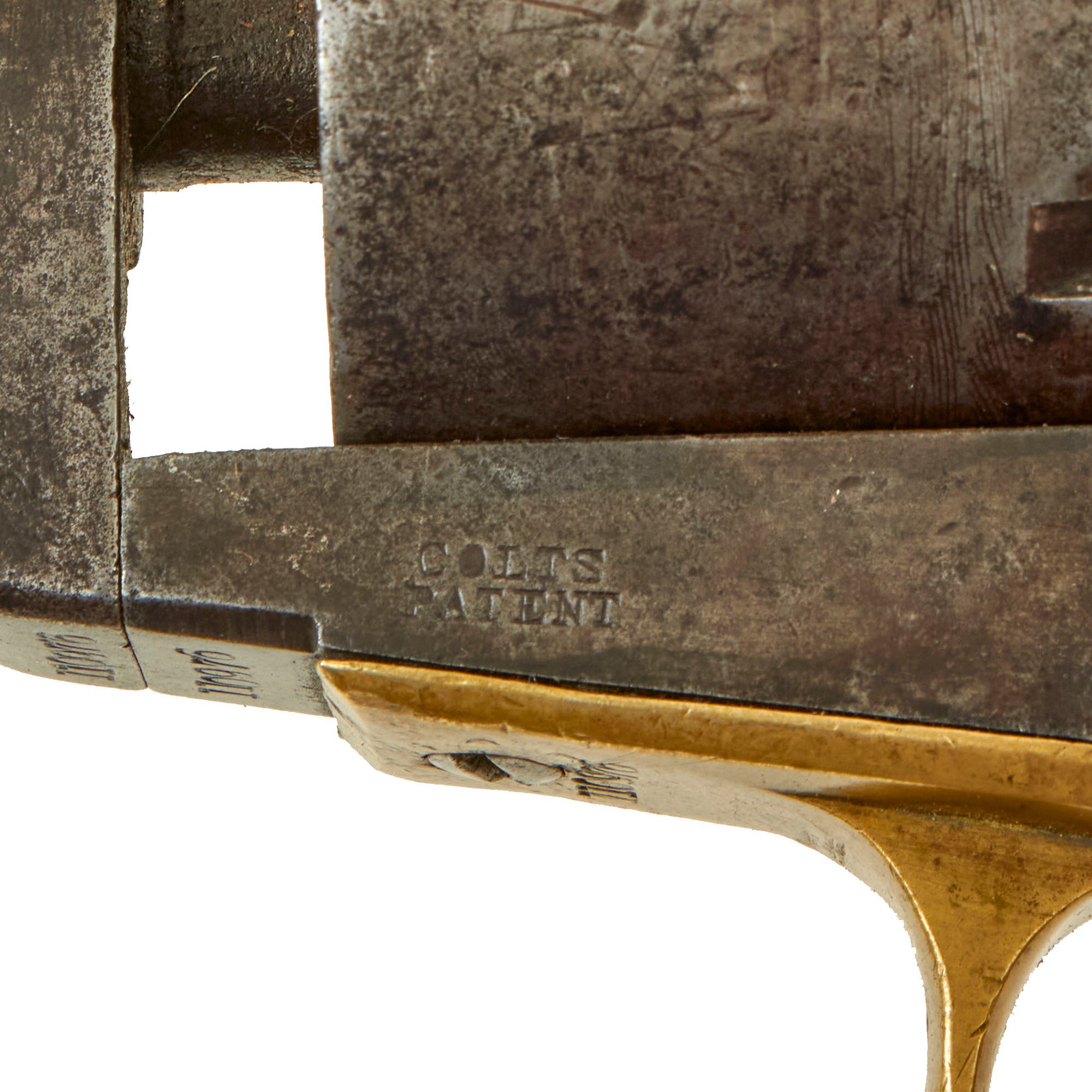The revolver looks to have seen light moderate service during the war, and displays a lovely patina of age, with no signs of having been refinished at any point. The plating on the trigger guard and grip are completely missing, with the brass showing a lovely mustard patina. The COLTS PATENT marking on the left side of the frame is still crisp, though there is no "36CAL" marking on the trigger guard, but this is not uncommon. The walnut grip is in is in good shape, showing a lovely color, though there is definitely overall wear, especially to the front toe area on the left side. We cannot see any trace of the original cartouches.