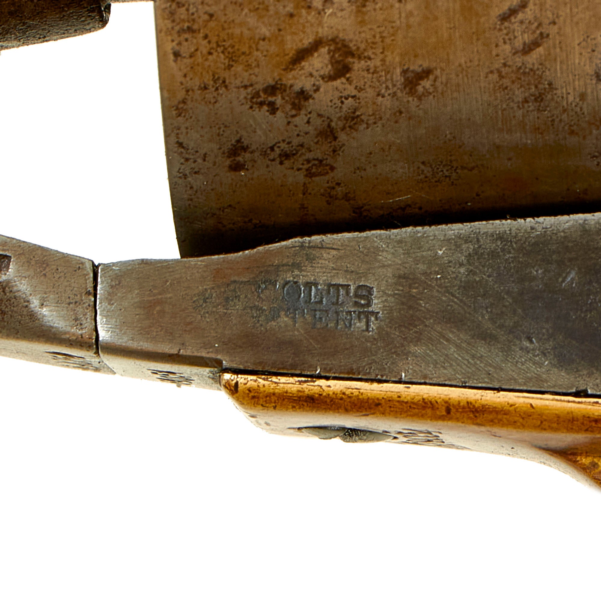 The COLTS PATENT marking is still visible on the left side of the frame, and unlike most we see, it still has a faint COLT'S PATENT No. over a clear PAT. SEPT 10th 1850 marking on the cylinder. These early Colt revolvers did not have the additional patent dates listed on the frame. The "Naval Engagement Scene" is completely worn away, as we often see on revolvers of this age. There are proof marks stamped on various components as well, though there is not a "44CAL" stamping on the trigger guard, which is not uncommon, as many were not marked.