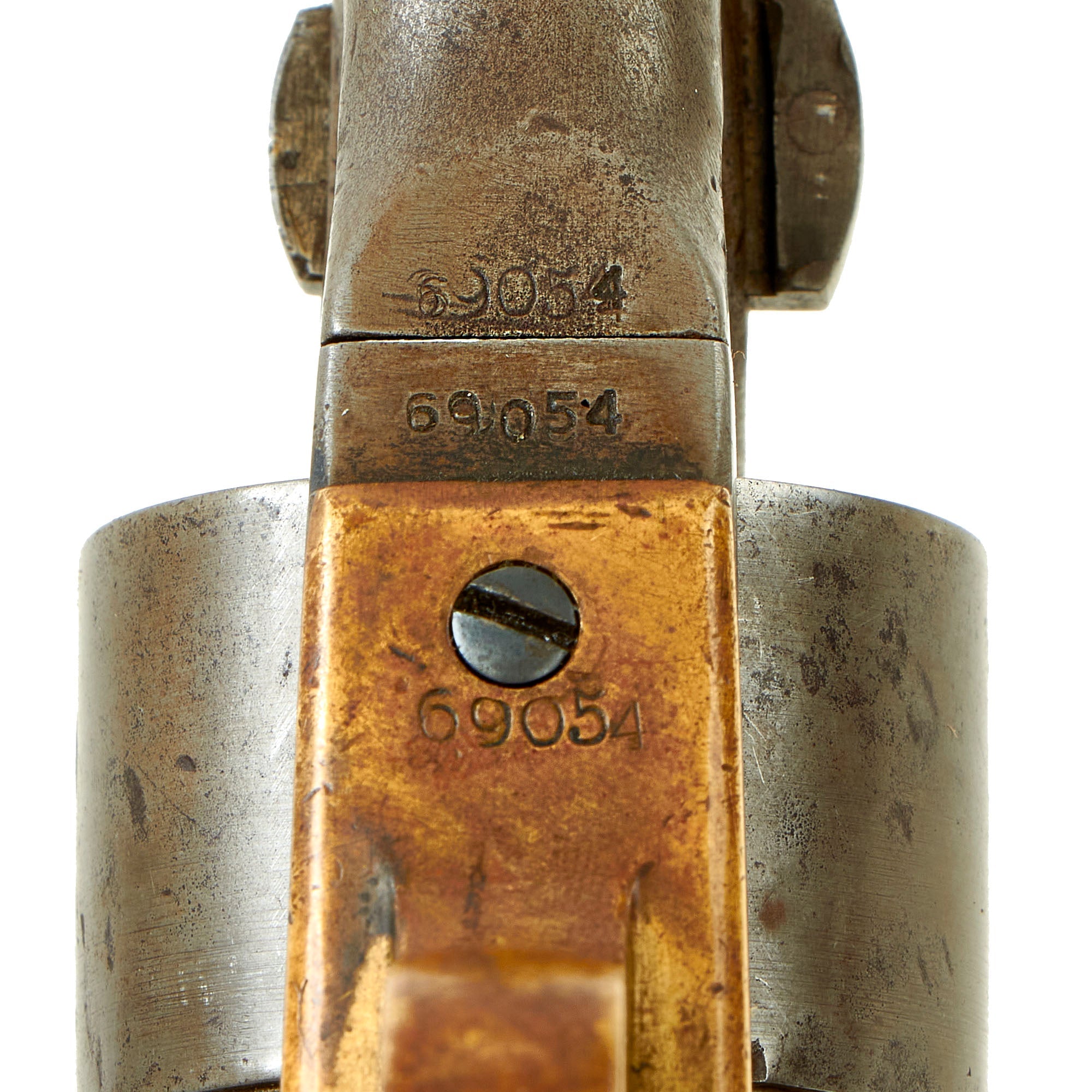 The barrel, frame, trigger guard, and grip frame all bear matching serial number 69054. This means that it was produced during Colt’s 1862 production, which ran from approximately #25,000 to #85,000. The cylinder bears shortened number 9054, while the arbor pin is unmarked, while the barrel wedge is marked 6491, probably swapped at arsenal long ago. That makes this a very nice "MOSTLY MATCHING" example, with no major parts swapped out over the years.