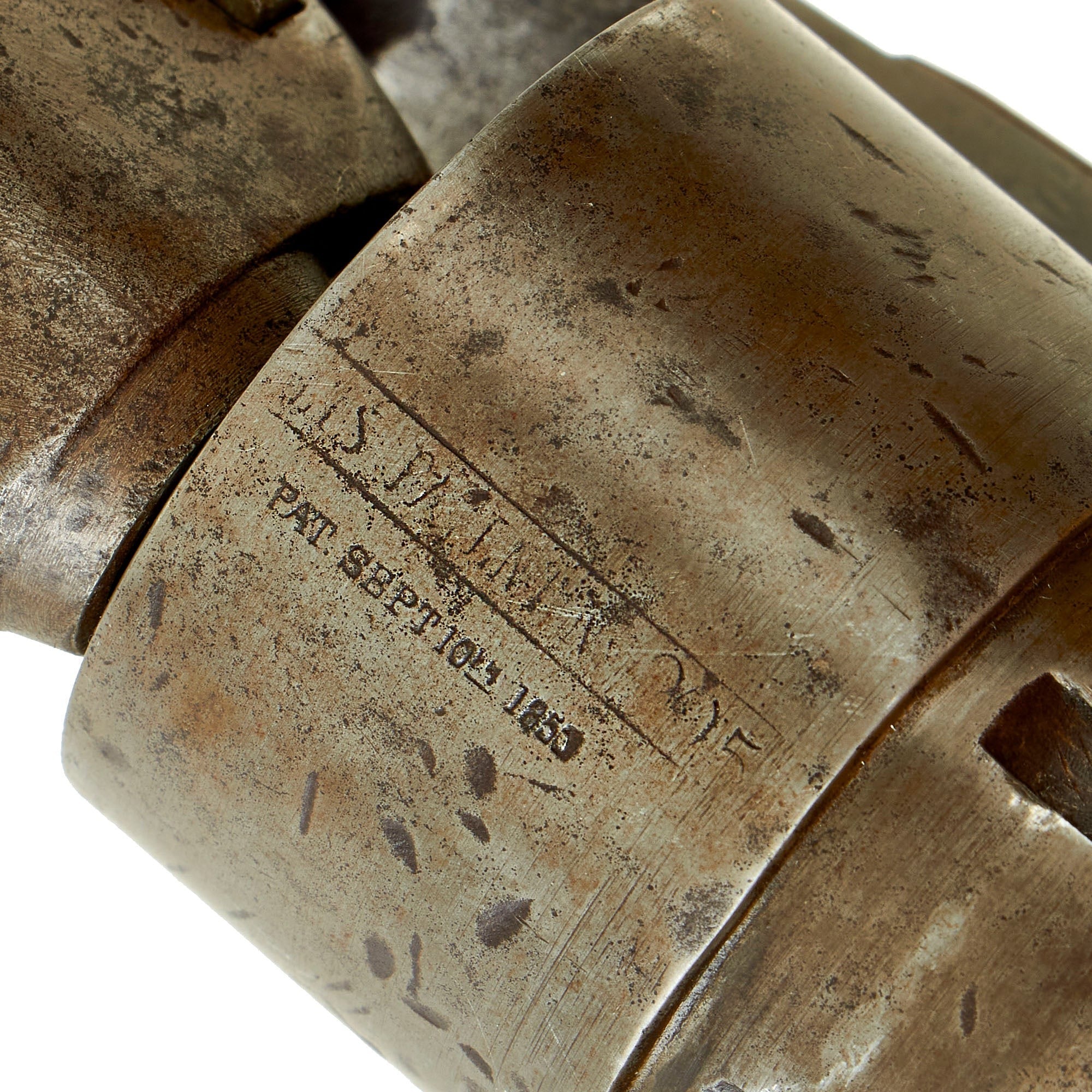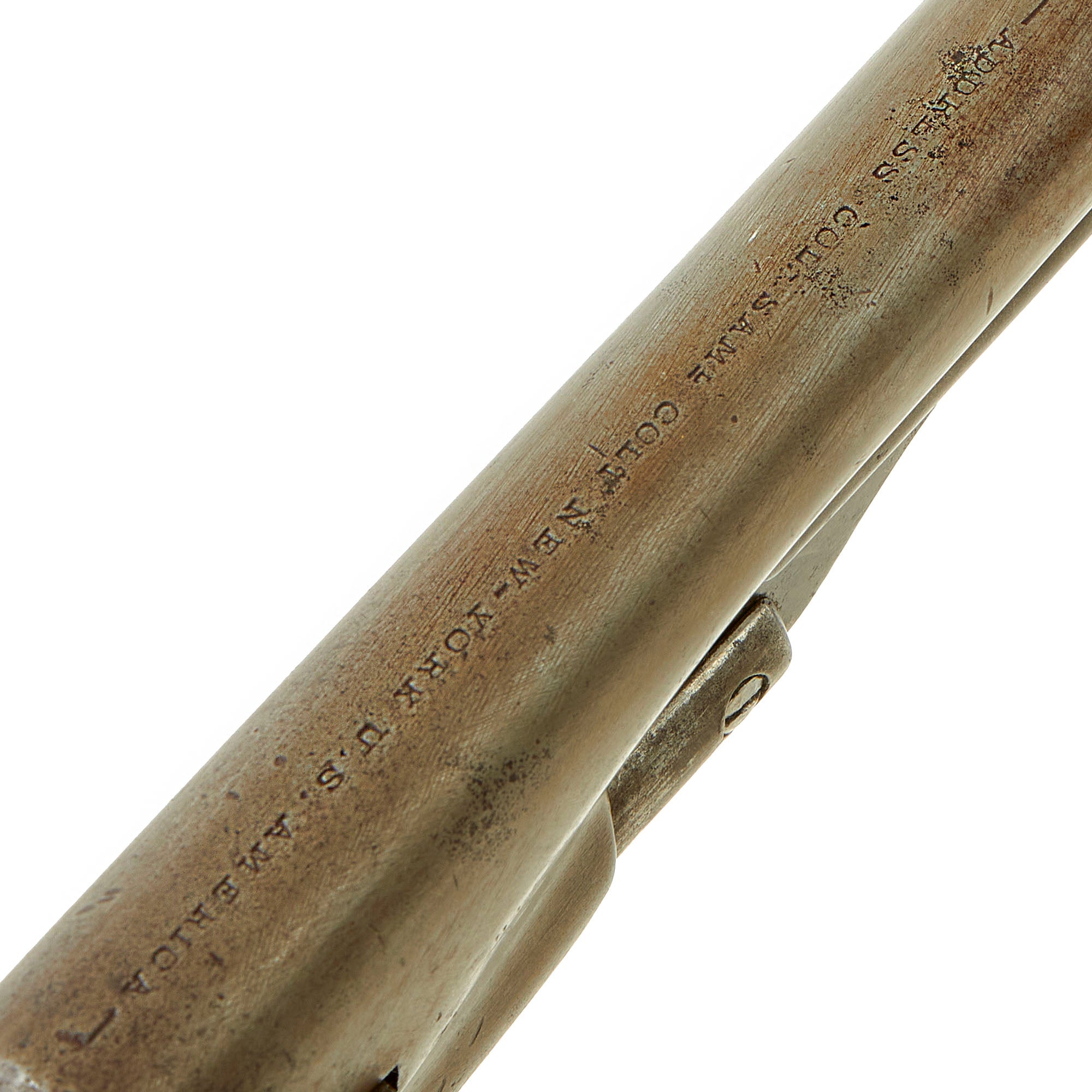 The pistol is complete, and actually functions well with good indexing and a solid cylinder lockup. We did not notice any of the usual finicky behavior we see on revolvers of this vintage. The revolver still breaks down properly with removal of the barrel wedge. The barrel - frame connection is solid, with no wobble, and does not appear to have been adjusted in the past. The bore is in very good condition, showing clear lands and grooves with a partly bright finish. There is some wear and past oxidation and fouling, as to be expected from a black powder percussion revolver, however compared to most this is definitely a great bore. All 6 cap nipple cones are intact and look to possibly be replacements, as the apertures are smaller than the usual Colt size, and 5 of 6 are clear.