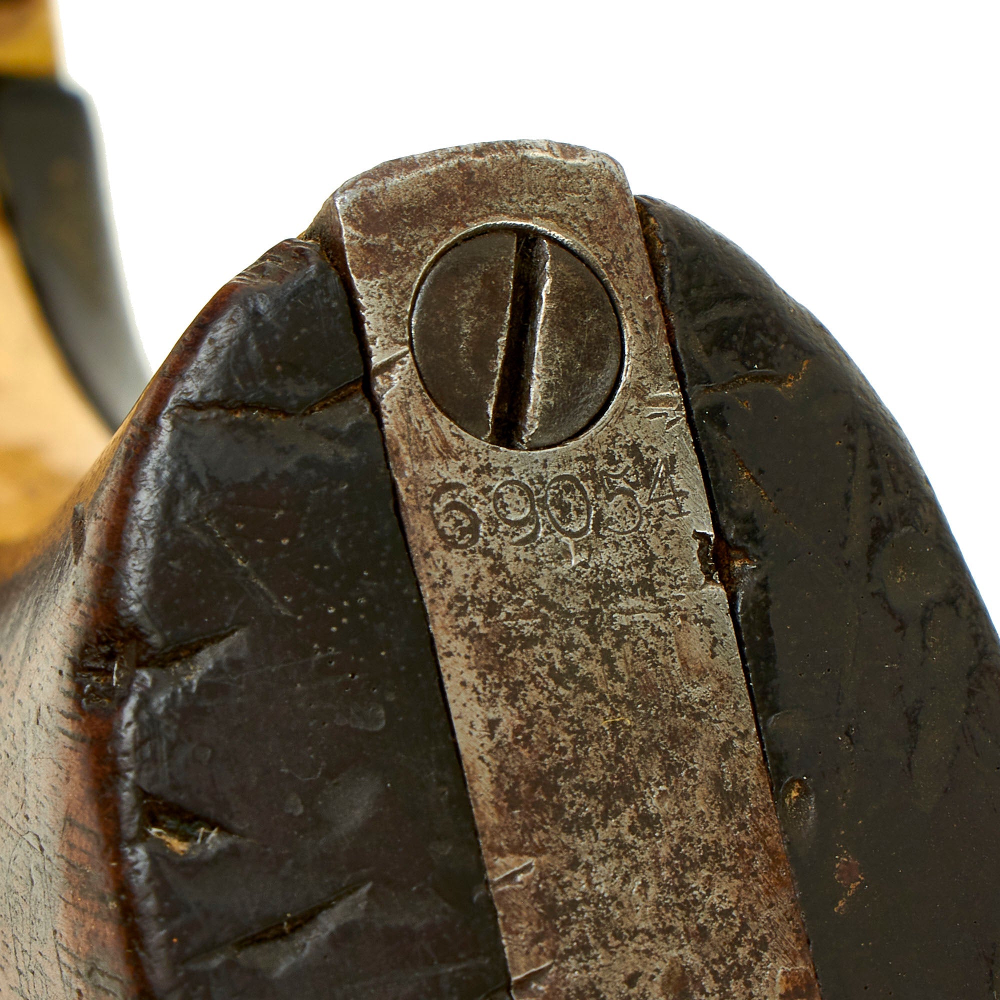 The original walnut grip is in very good condition, showing wear from use, and some minor chipping on the front toe and wear around the bottom, as is common. It has a lovely color, showing the wood grain well, with no cracks or other major damage, and there are faint inspection cartouches on both sides of the grip, which a trained eye may be able to read.