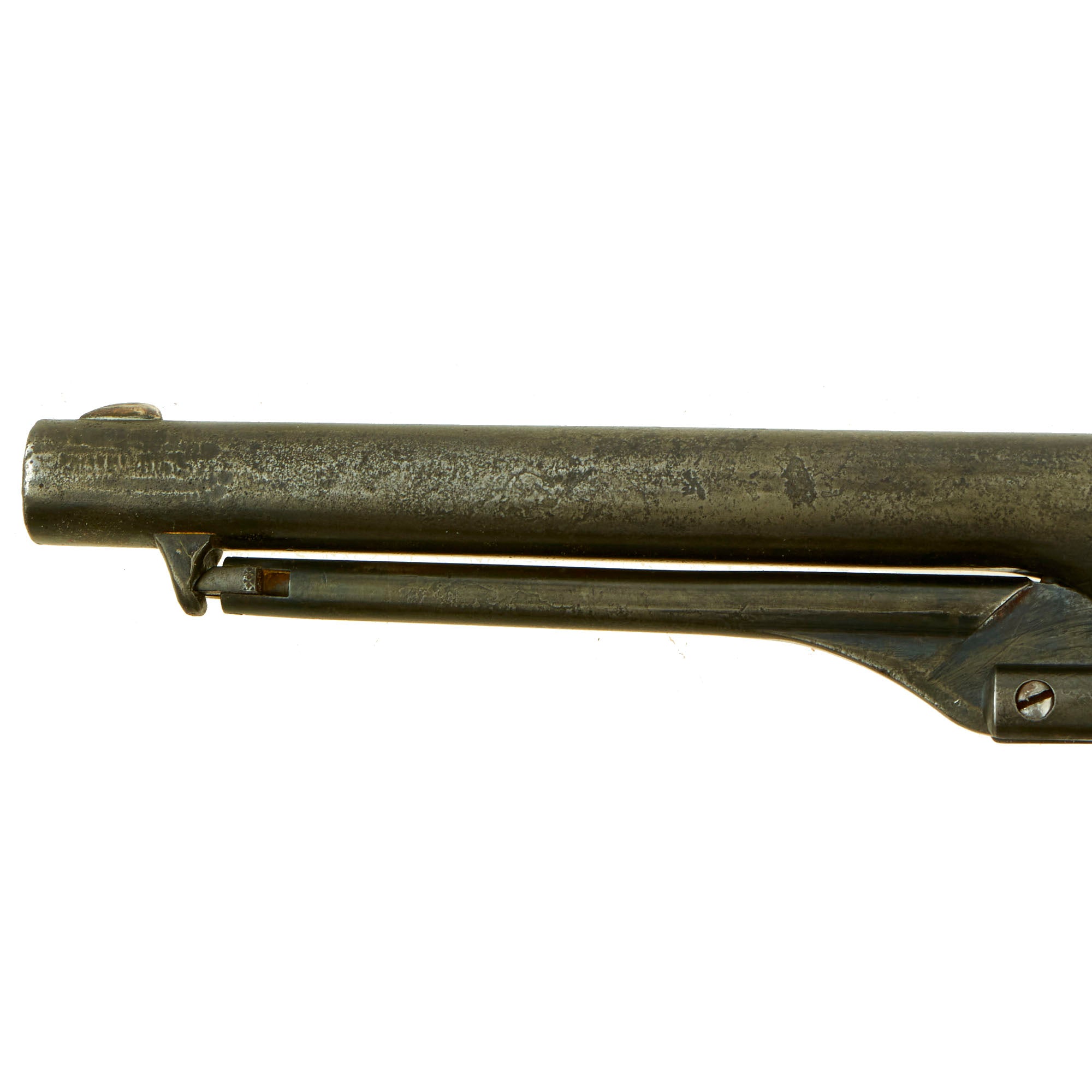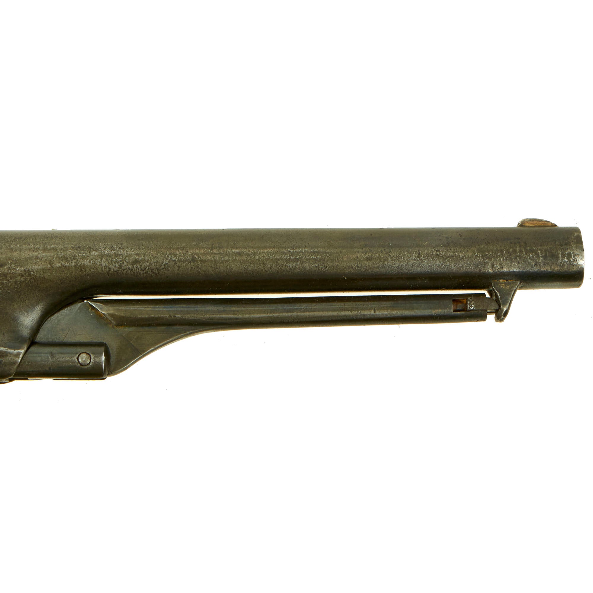 Original Item: Only One Available. This is a very nice patinated .44 caliber percussion, 6 shot round cylinder, 8" barrel Model 1860 Colt Army revolver. Gun is in very good service used condition and fully functional, with a lovely worn gray patina overall. It looks to have had some arsenal level repairs done to the arbor pin, and was most likely in service for long after the civil war. The address marking is still partly legible on the top of the barrel: