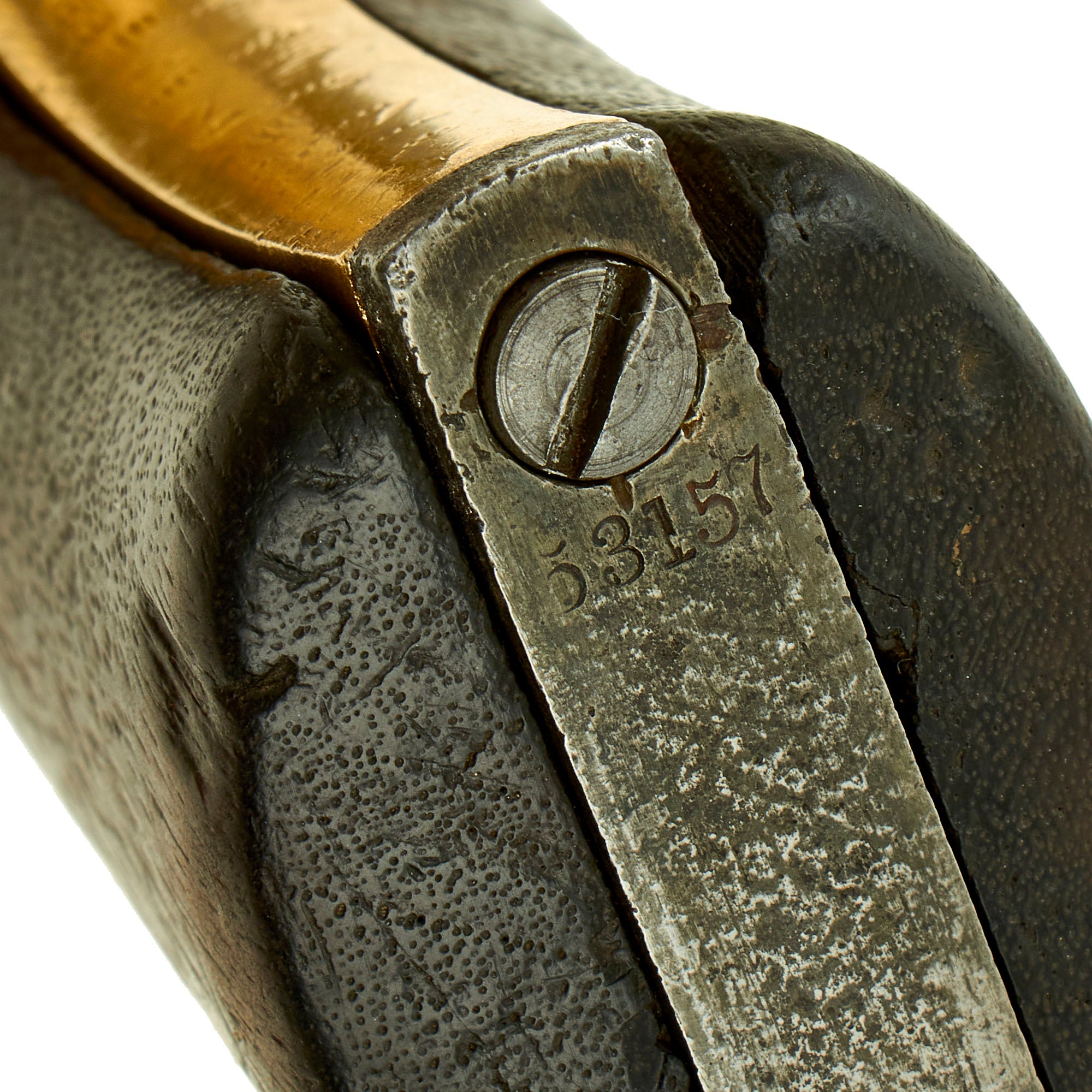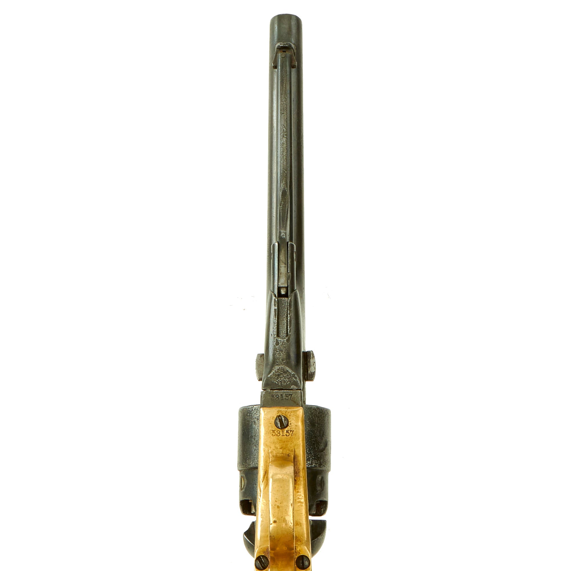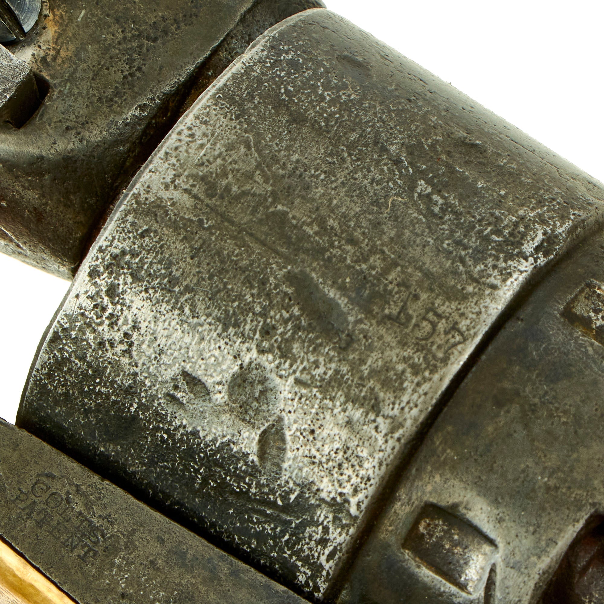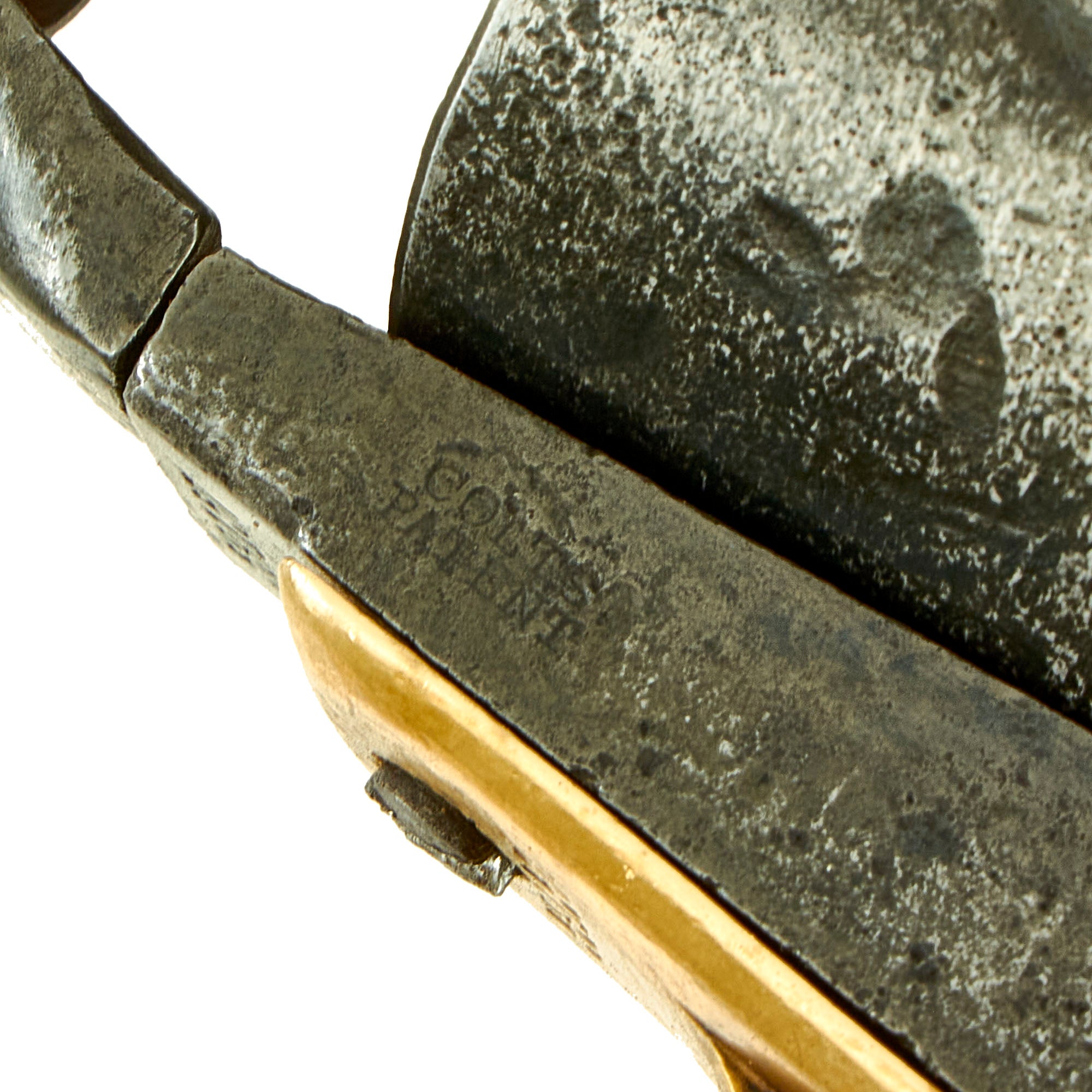 The COLT'S PATENT marking is still fully visible on the left side of the frame, however the markings on the cylinder are almost completely removed due to wear. The pistol has a nice worn oxidized finish, and does not look to have been refurbished at any time. The barrel, frame, trigger guard, grip frame all bear matching serial number 53157, denoting year of manufacture as 1862, during the height of the U.S. Civil War. The cylinder and barrel wedge are both marked with shortened number 157. Only the replaced/repaired cylinder arbor pin unmarked, which makes this a very nice "Mostly Matching" example.