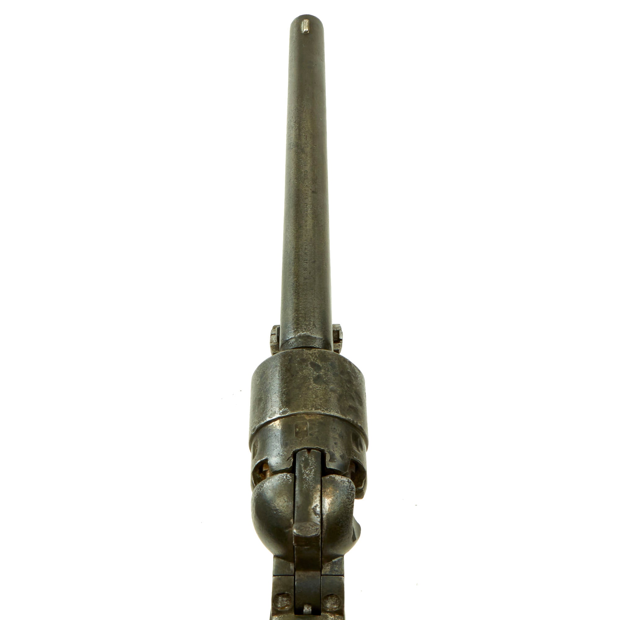 The pistol is complete, and does cycle well, with good indexing and strong dry fire. However mechanical slop around the replaced arbor pin sometimes causes it to hang up while cycling. The cylinder stop is functional, however it does not hold securely due to how much the cylinder can move. The bore shows clear lands and groove, however there is also past fouling and oxidation, common for percussion arms due the corrosive black powder. All 6 cap nipple cones are intact and clear, however some have definitely been replaced, and others show significant deformation due to wear.
