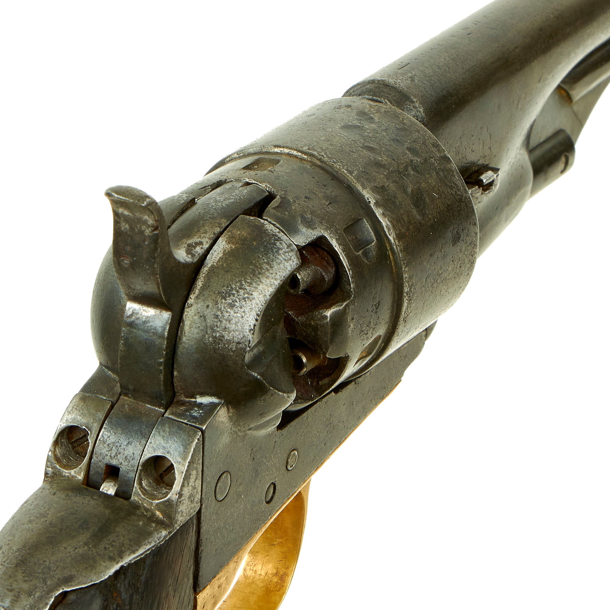 The unfluted cylinder was 'rebated,' meaning that the rear of the cylinder was turned to a smaller diameter than the front. The barrel was rounded and smoothed into the frame, as was the Navy Model. The frame, hammer, and rammer lever were case-hardened, the remainder blued; grips were of one-piece walnut; and the trigger guard and front grip strap were of brass while the backstrap was blued."