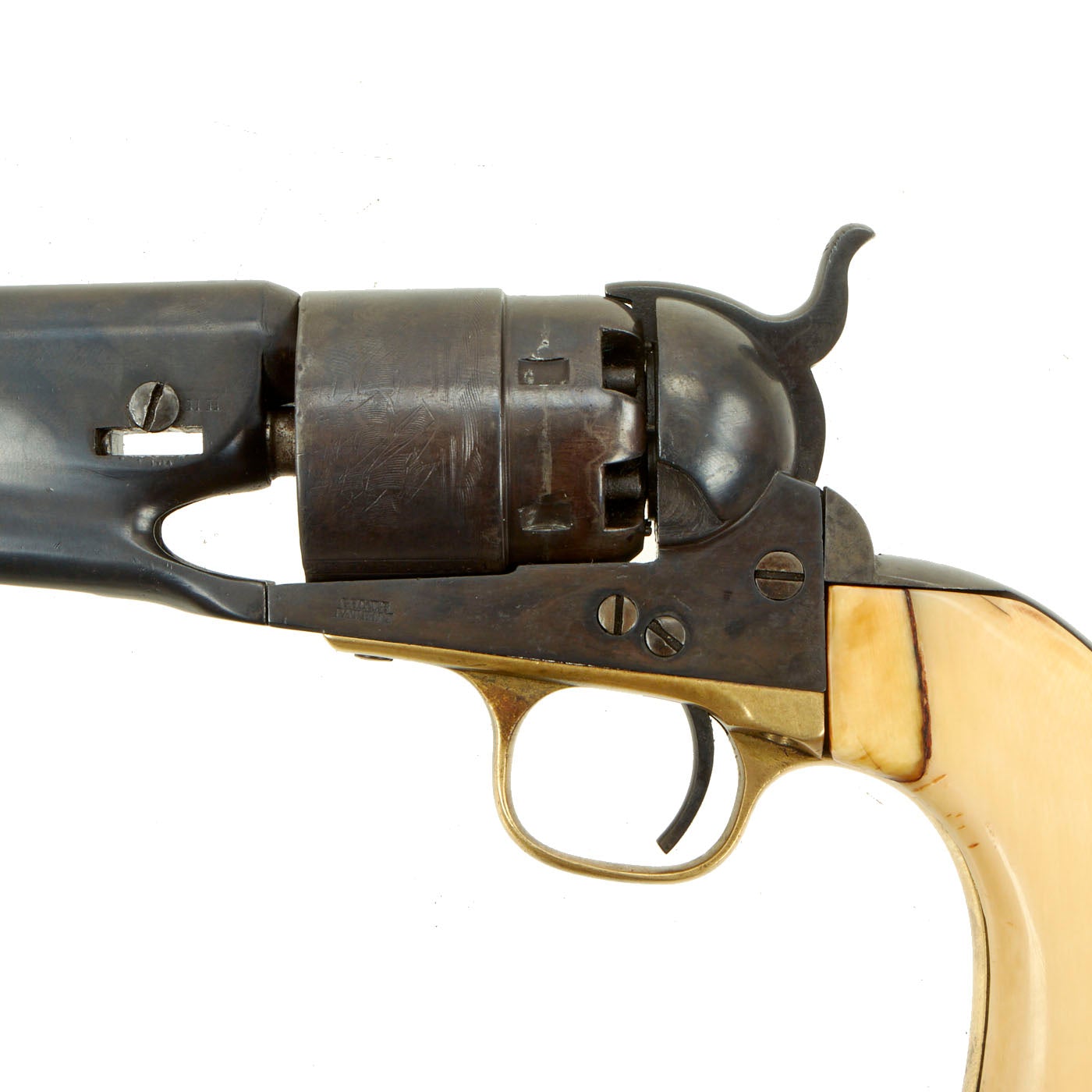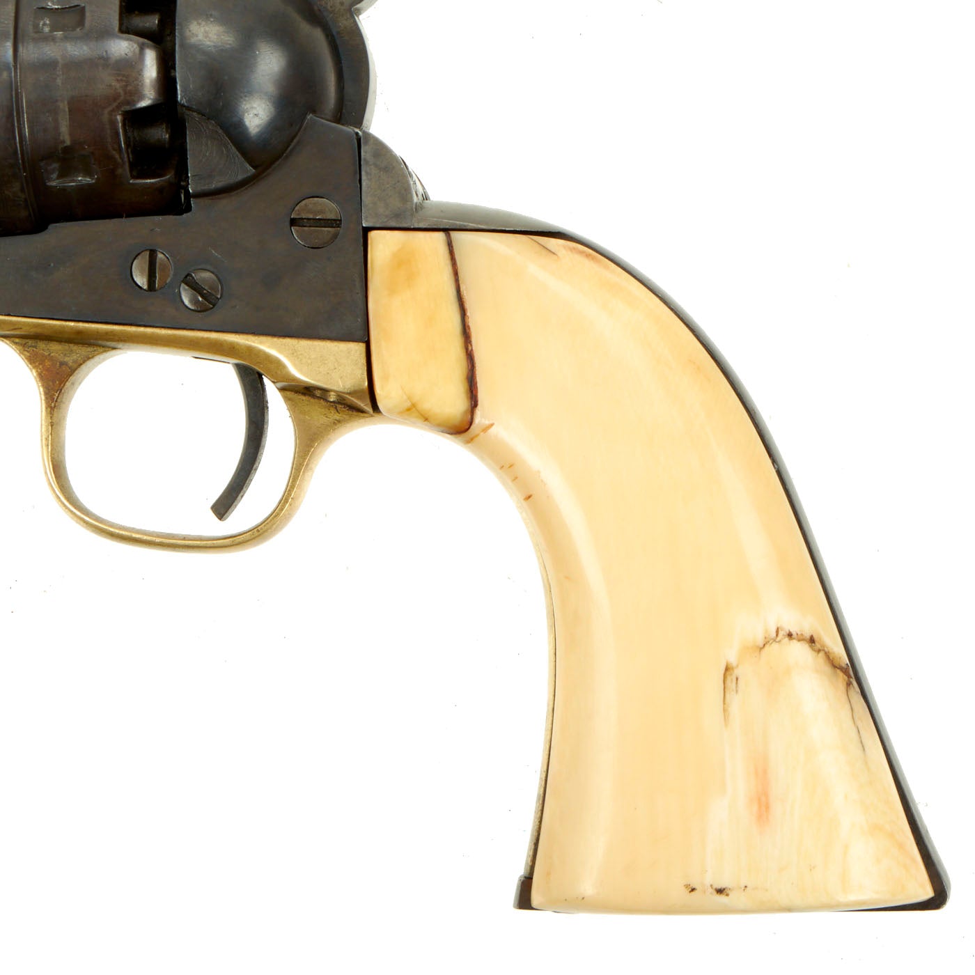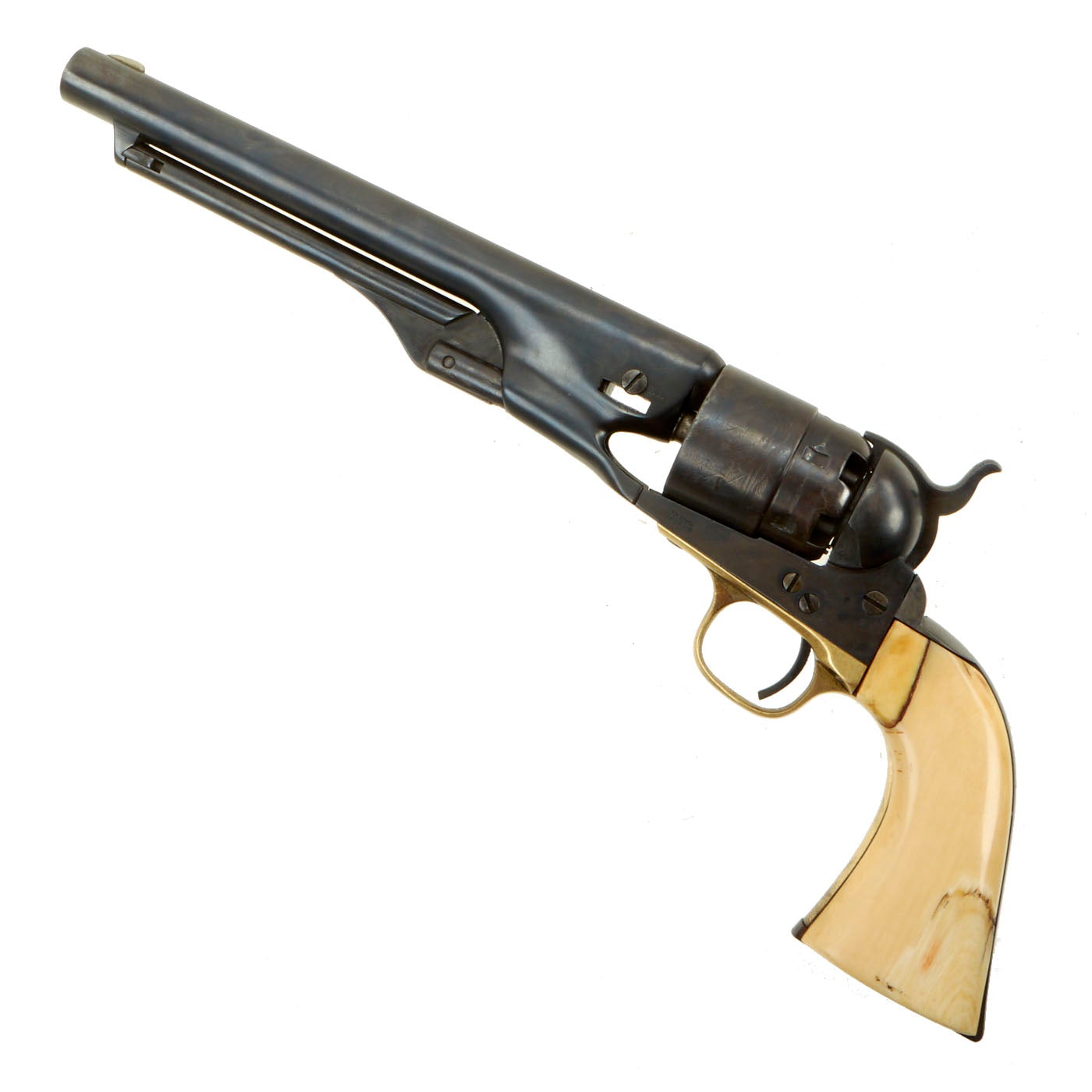 Original Item: Only One Available. This is a lovely .44 caliber percussion, 6 shot round cylinder, 8" barrel Model 1860 Colt Army revolver. Gun is in very good used condition and fully functional, with a lovely patina. Action and barrel frame lock up are tight. It was definitely reconditioned sometime during or after the war, and it was refinished at this point, and the cylinder replaced. It also had the grip frame replaced, and a great set of ivory grips, probably made from walrus ivory. They have aged and cracked wonderfully, giving this revolver fantastic eye appeal!