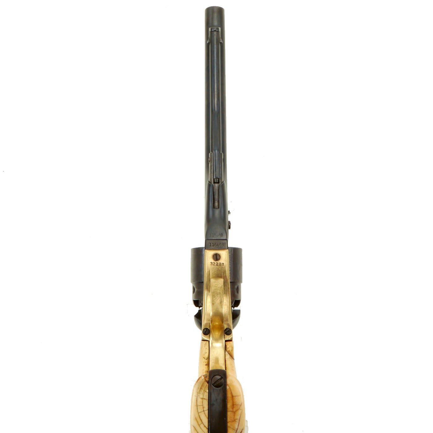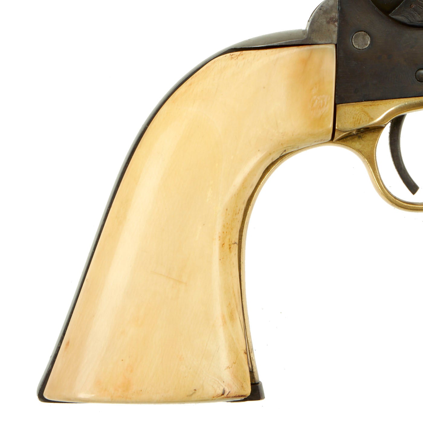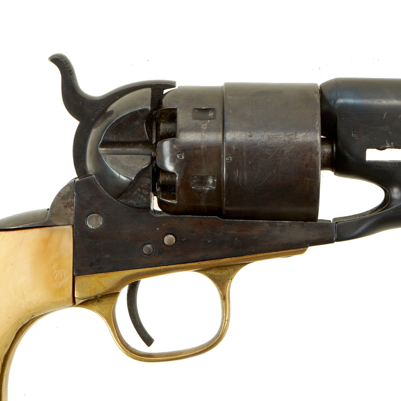 Original Item: Only One Available. This is a lovely .44 caliber percussion, 6 shot round cylinder, 8" barrel Model 1860 Colt Army revolver. Gun is in very good used condition and fully functional, with a lovely patina. Action and barrel frame lock up are tight. It was definitely reconditioned sometime during or after the war, and it was refinished at this point, and the cylinder replaced. It also had the grip frame replaced, and a great set of ivory grips, probably made from walrus ivory. They have aged and cracked wonderfully, giving this revolver fantastic eye appeal!