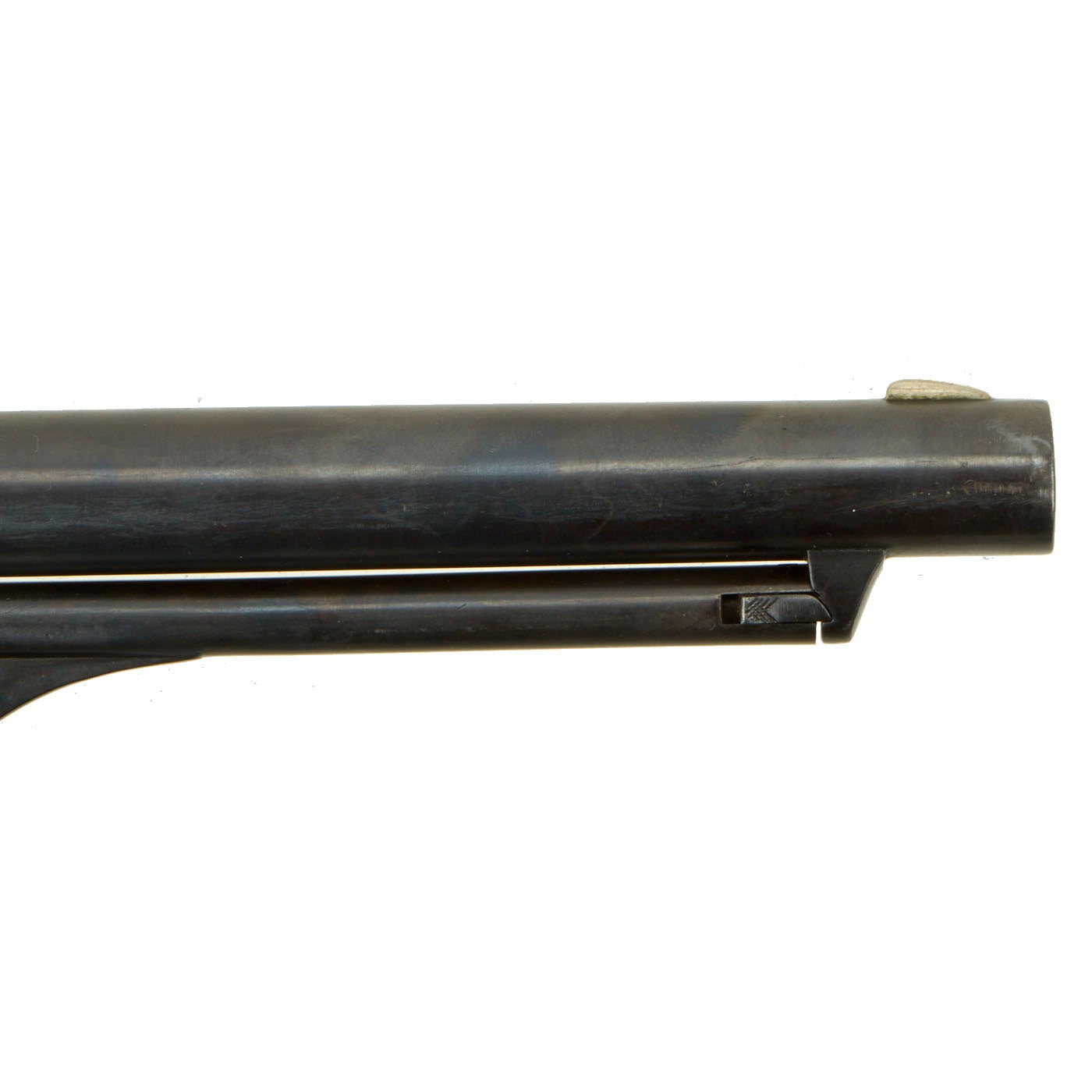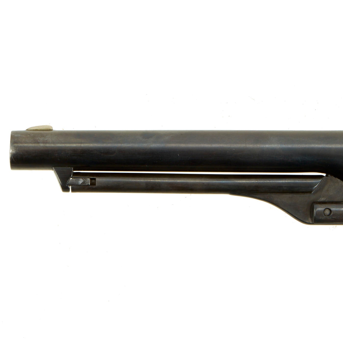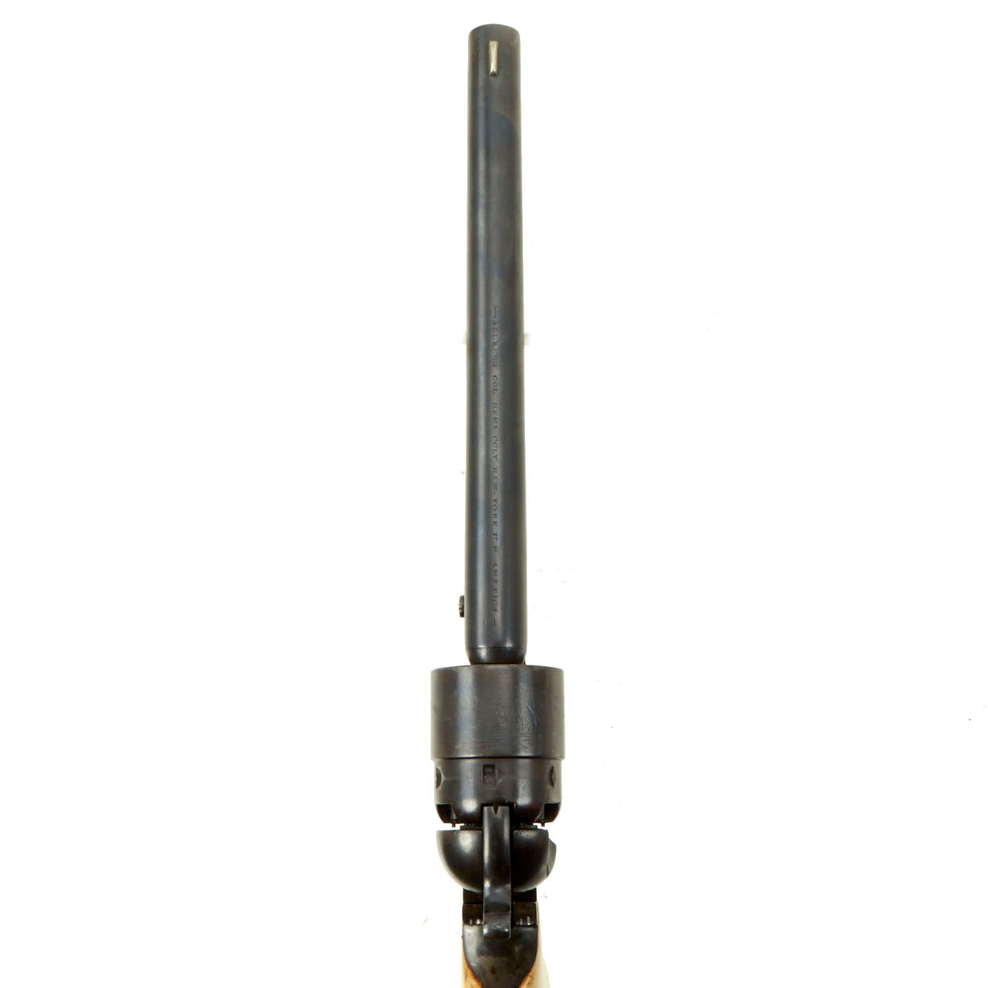 The unfluted cylinder was 'rebated,' meaning that the rear of the cylinder was turned to a smaller diameter than the front. The barrel was rounded and smoothed into the frame, as was the Navy Model. The frame, hammer, and rammer lever were case-hardened, the remainder blued; grips were of one-piece walnut; and the trigger guard and front grip strap were of brass while the backstrap was blued."