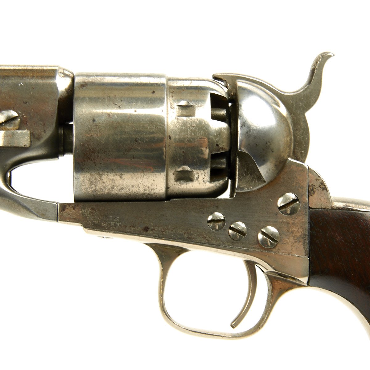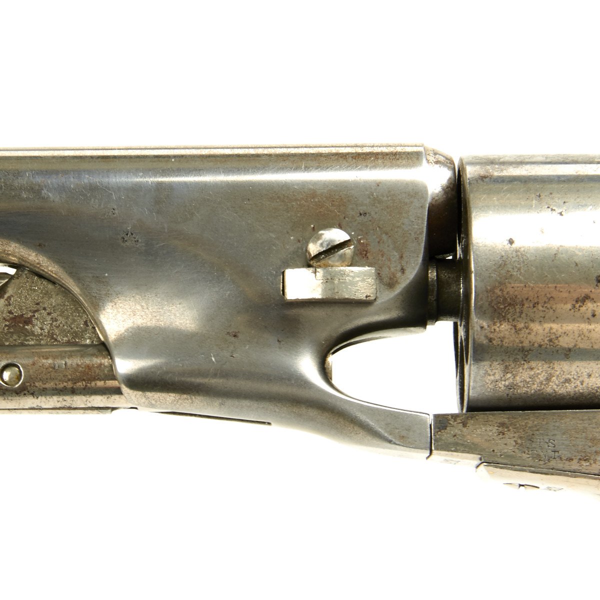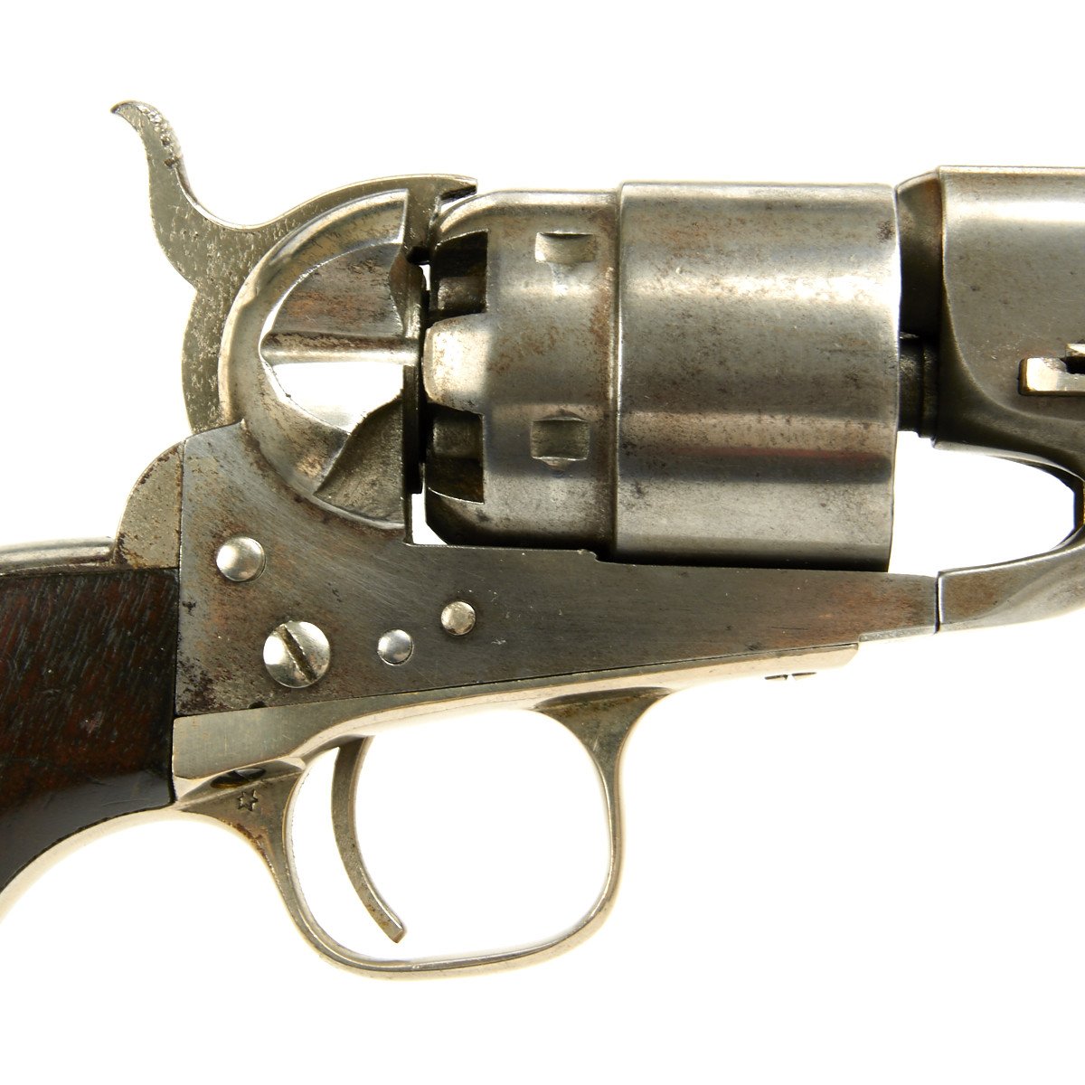 This particular handgun is a tight .44 caliber, early production four-screw frame model with a 6-shot rebated cylinder and an 8 round barrel. Barrel address is missing. All gun metal appears to have been nickel plated at the factory, with the exception of the barrel that may have been refinished long ago. Solid, one-piece dark walnut grips are varnished and exhibit normal hand wear from use. No inspector’s cartouches visible on either side.