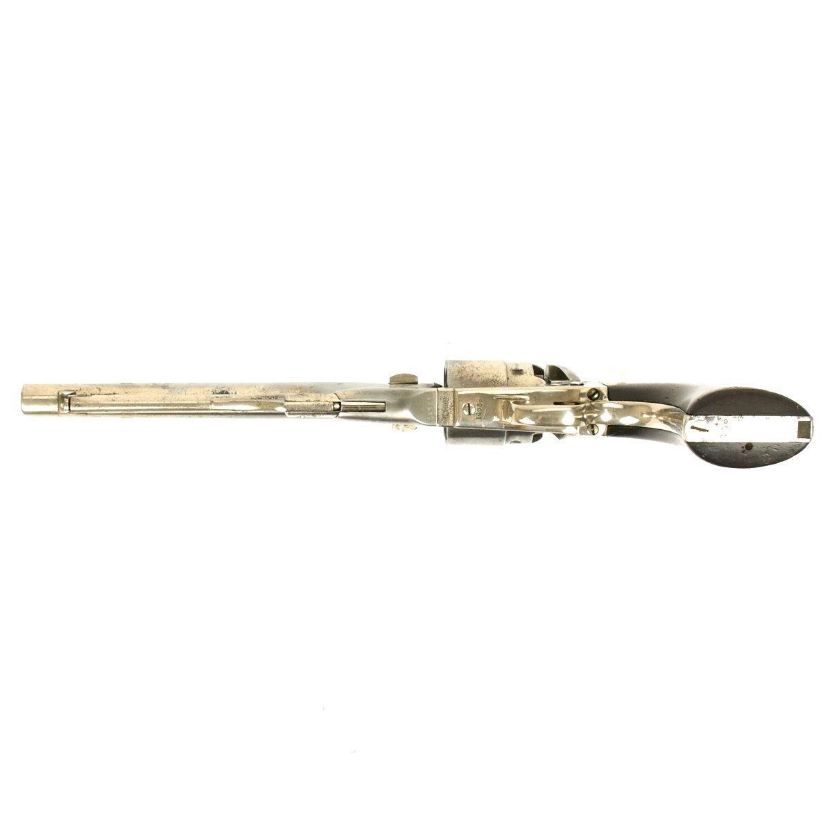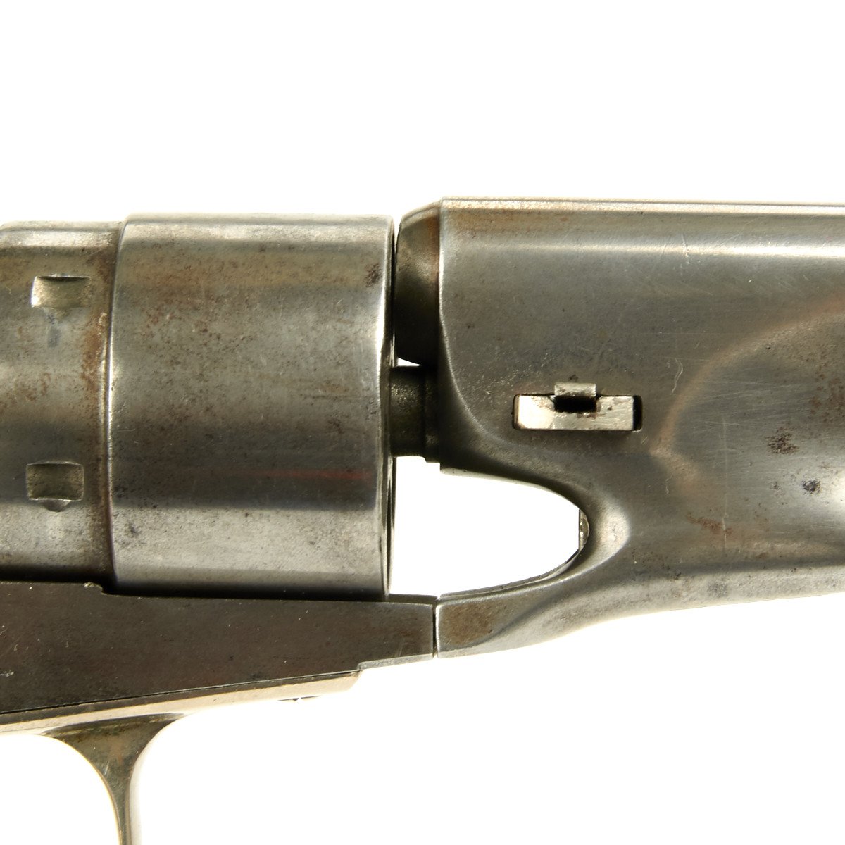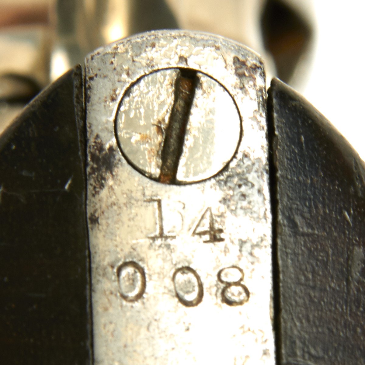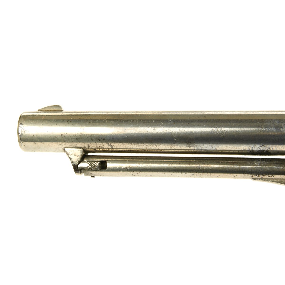 This particular handgun is a tight .44 caliber, early production four-screw frame model with a 6-shot rebated cylinder and an 8 round barrel. Barrel address is missing. All gun metal appears to have been nickel plated at the factory, with the exception of the barrel that may have been refinished long ago. Solid, one-piece dark walnut grips are varnished and exhibit normal hand wear from use. No inspector’s cartouches visible on either side.
