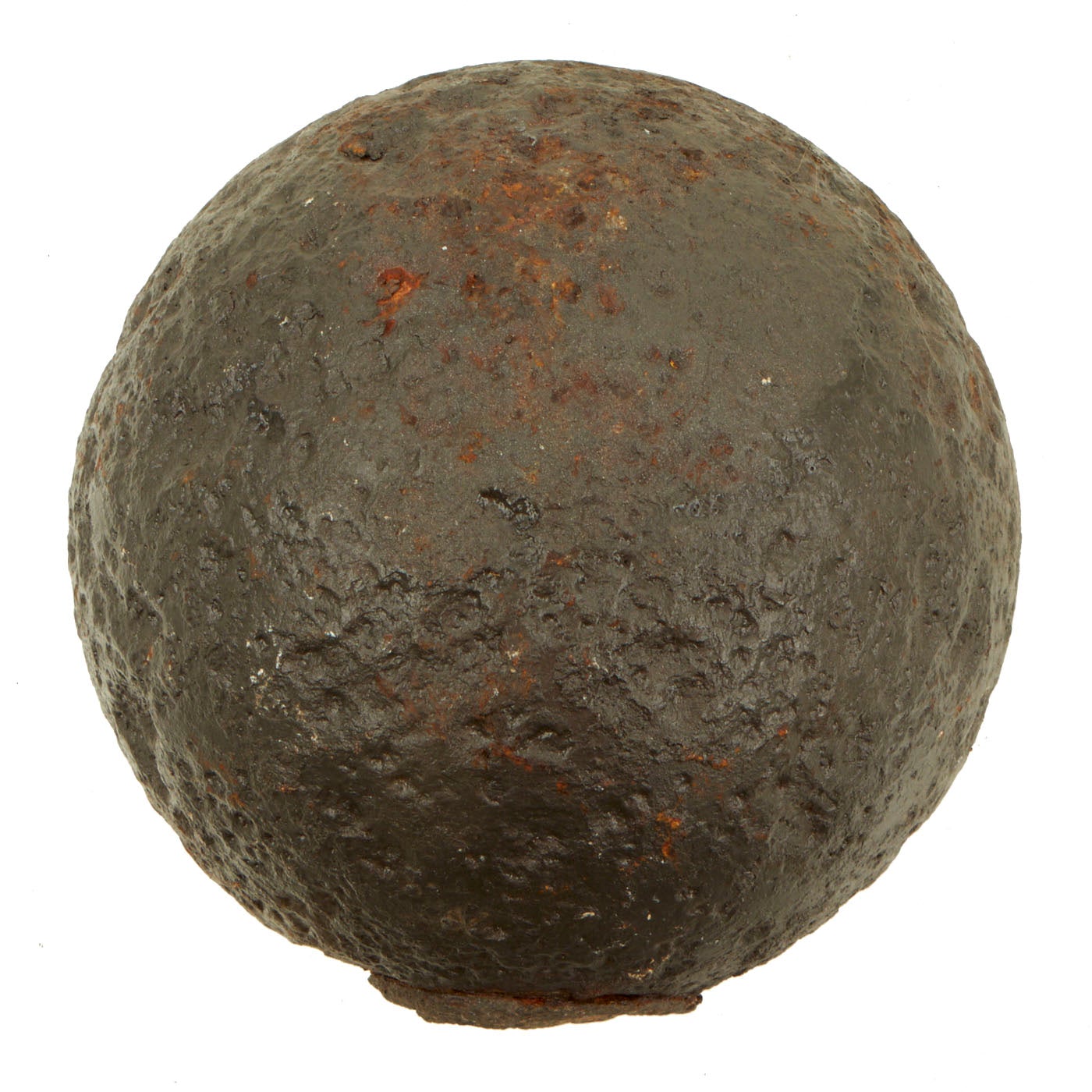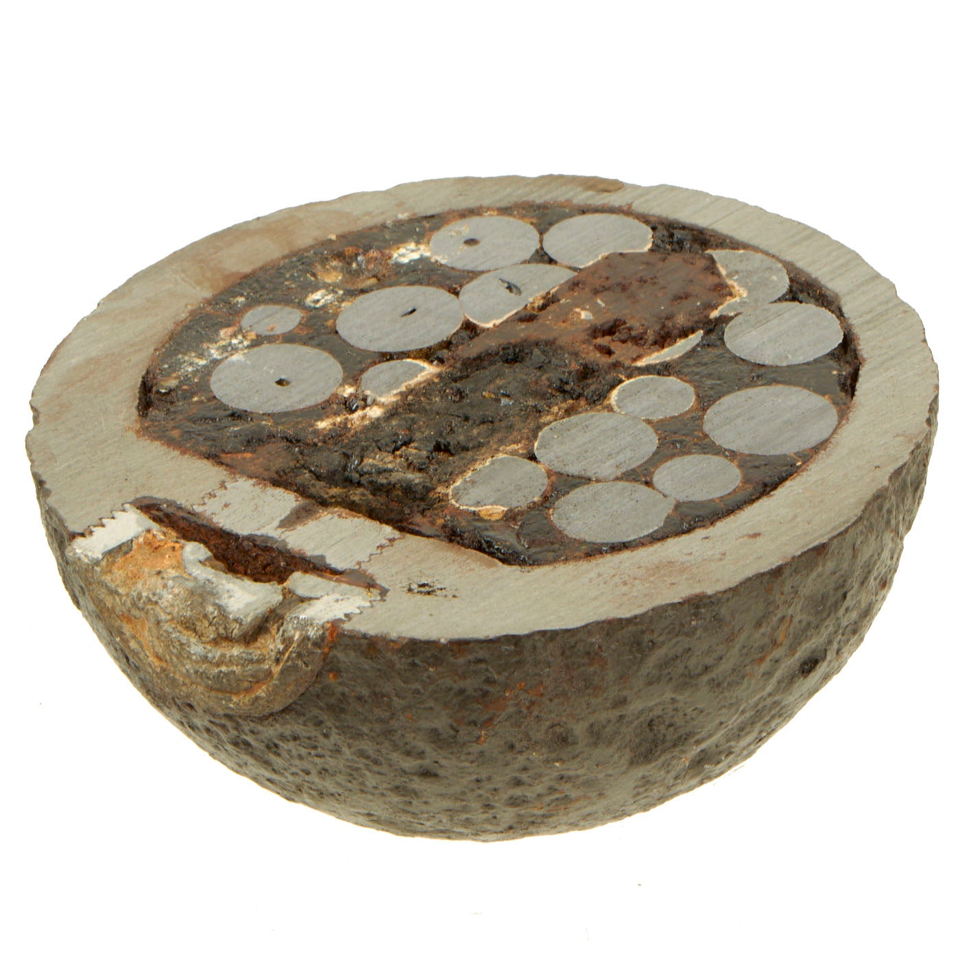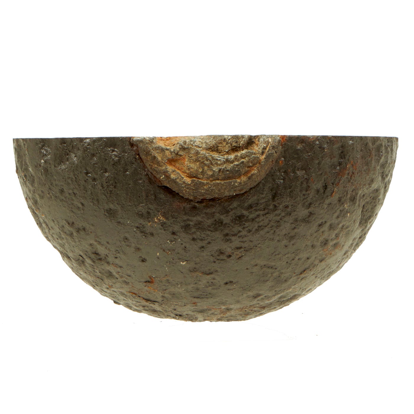 This item was excavated, so the iron surface is pitted from being underground for well over a century. Lead/zinc fuse band shows ground action on exterior, so no numbers remain visible. However, the embedded powder train within the band remains evident in the cross-section. The hole that leads to the inner charge from the fuse is also visible on this specimen.