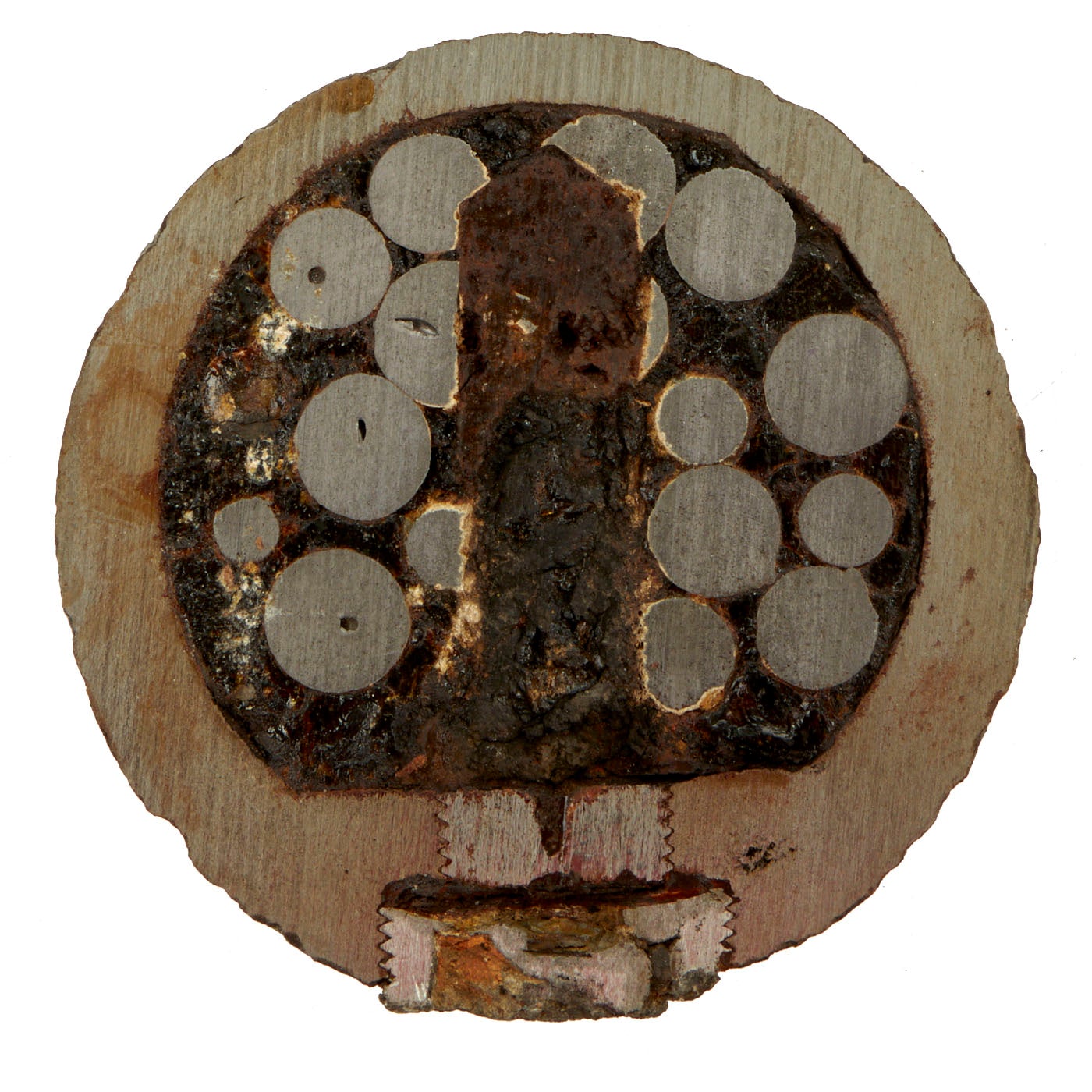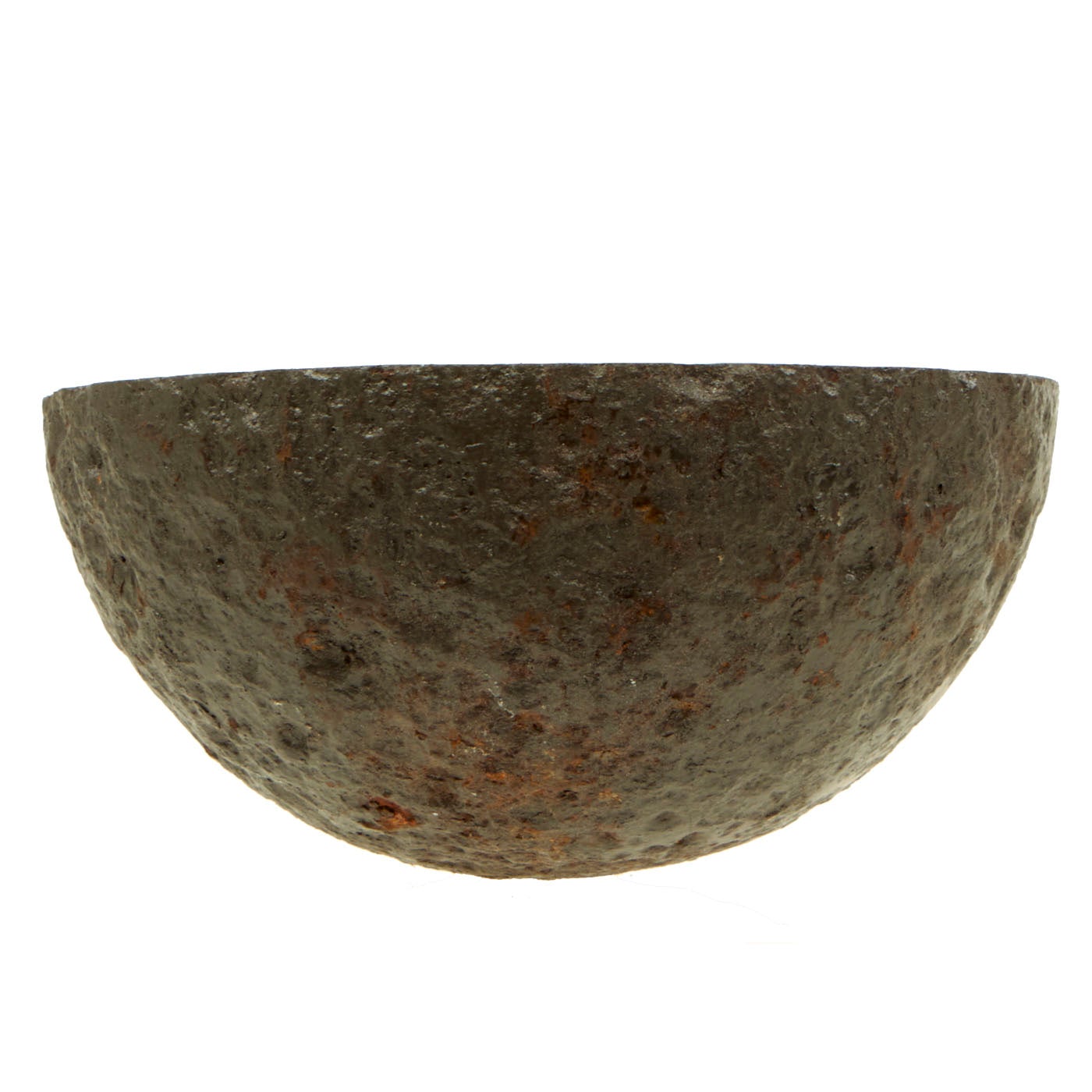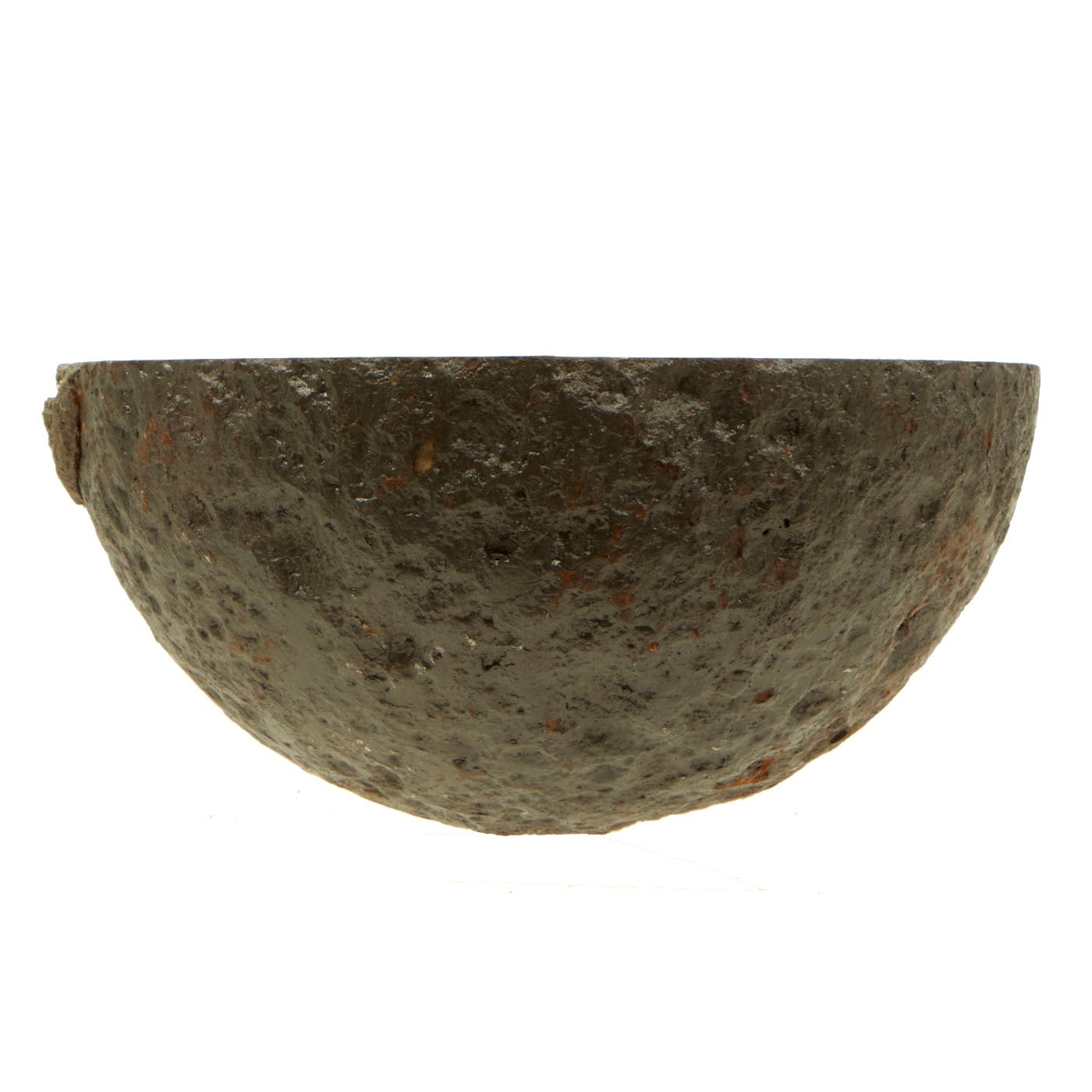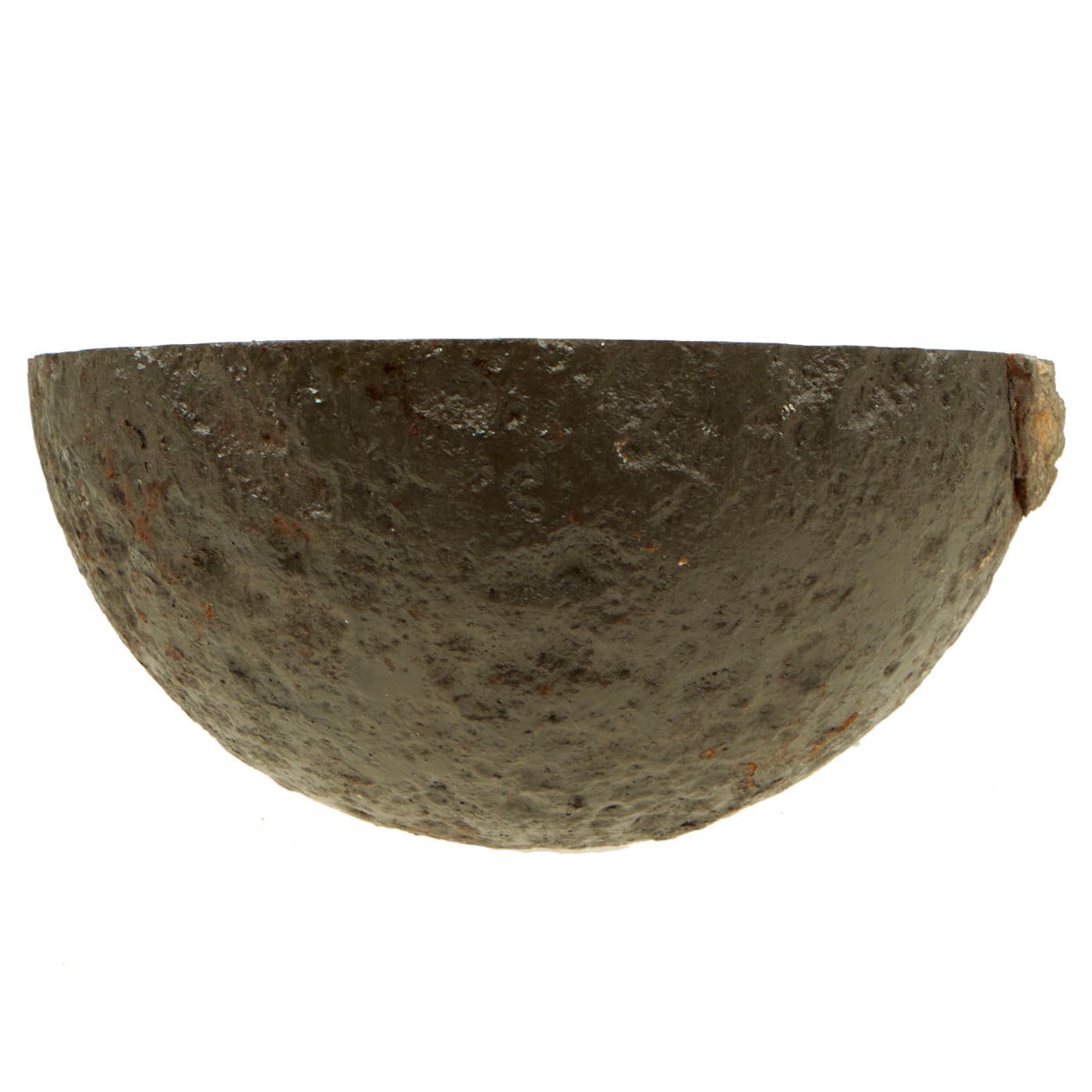 This item was excavated, so the iron surface is pitted from being underground for well over a century. Lead/zinc fuse band shows ground action on exterior, so no numbers remain visible. However, the embedded powder train within the band remains evident in the cross-section. The hole that leads to the inner charge from the fuse is also visible on this specimen.