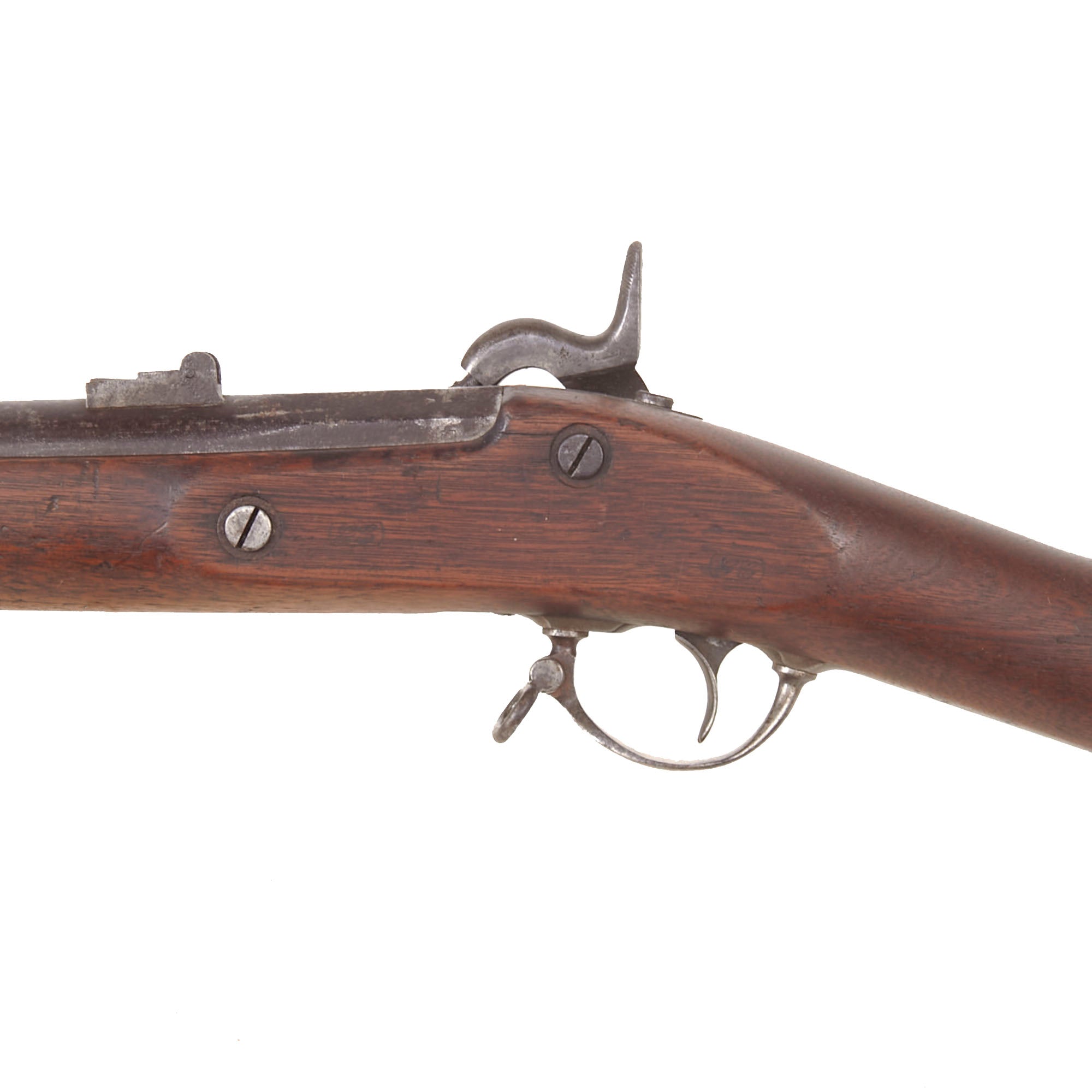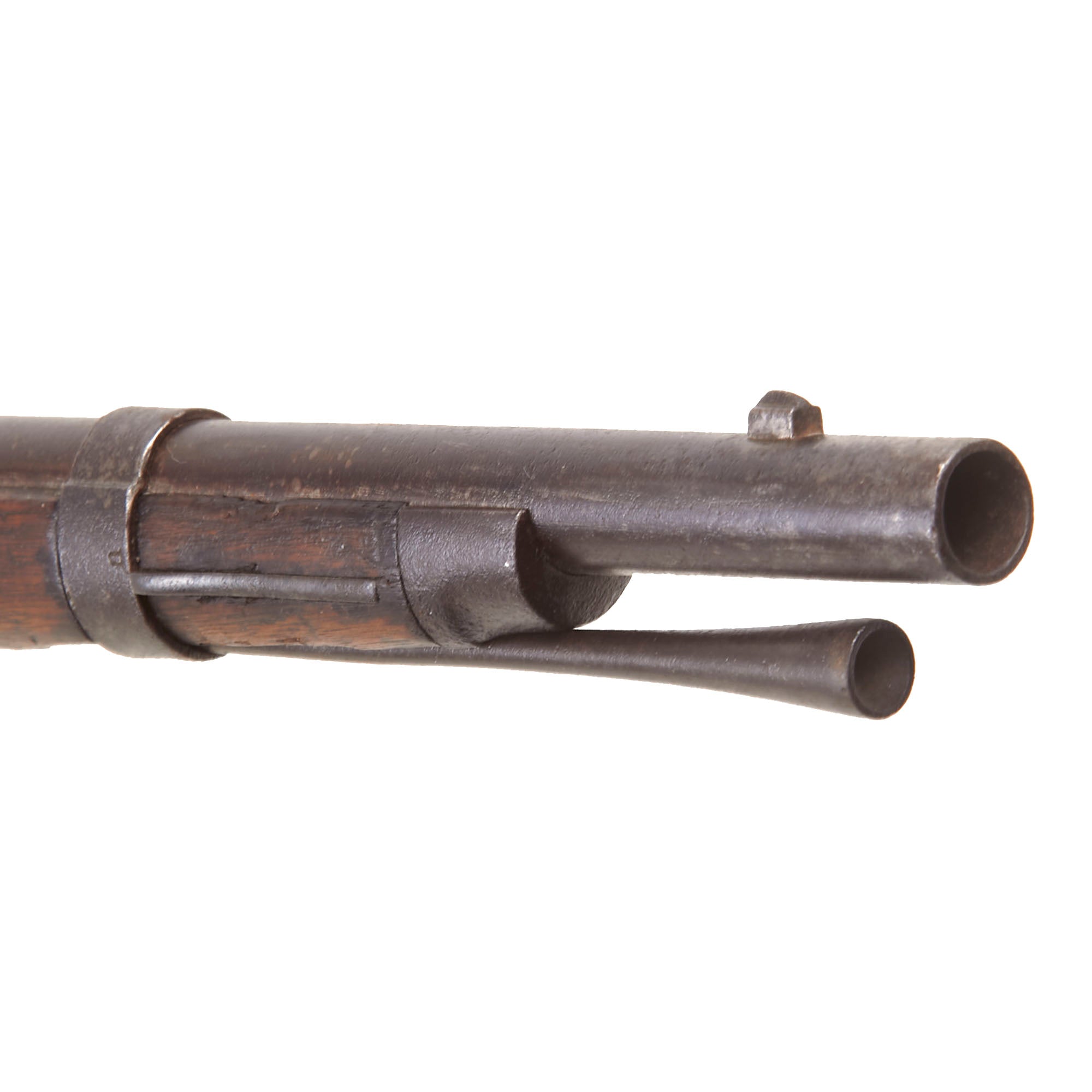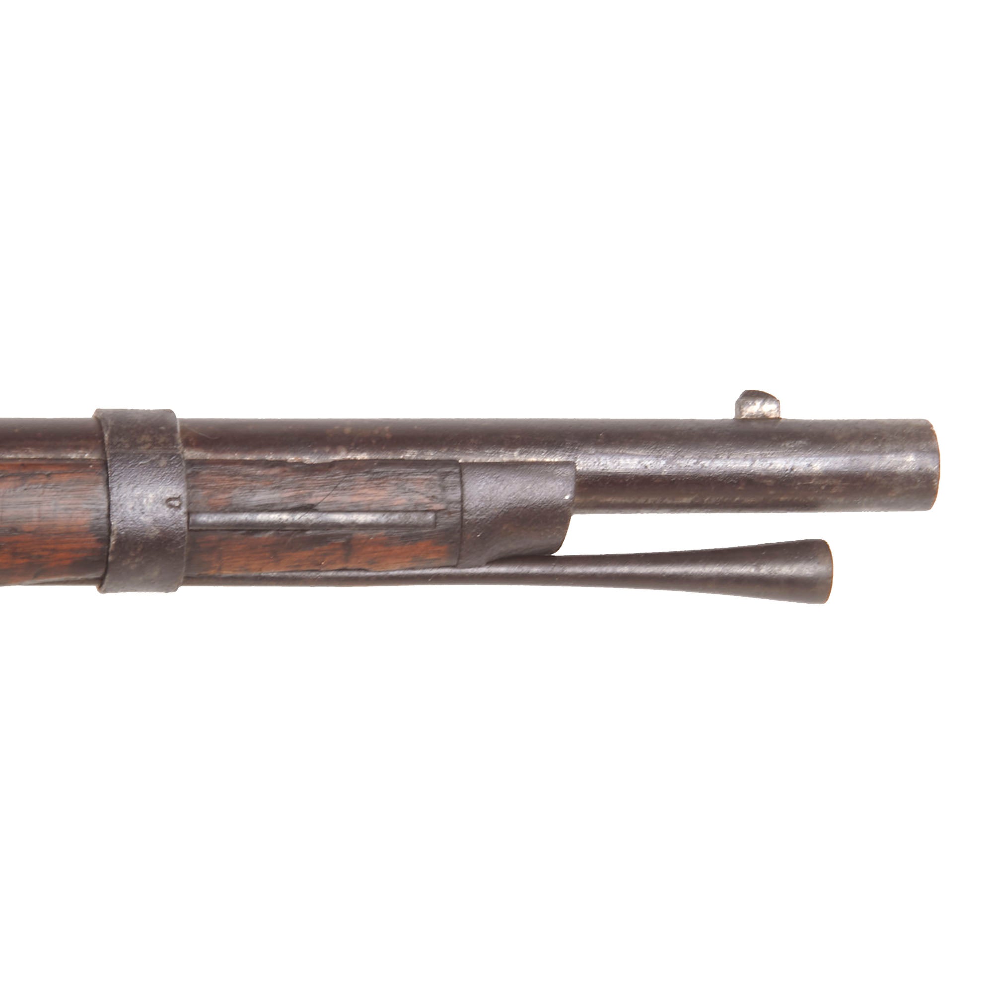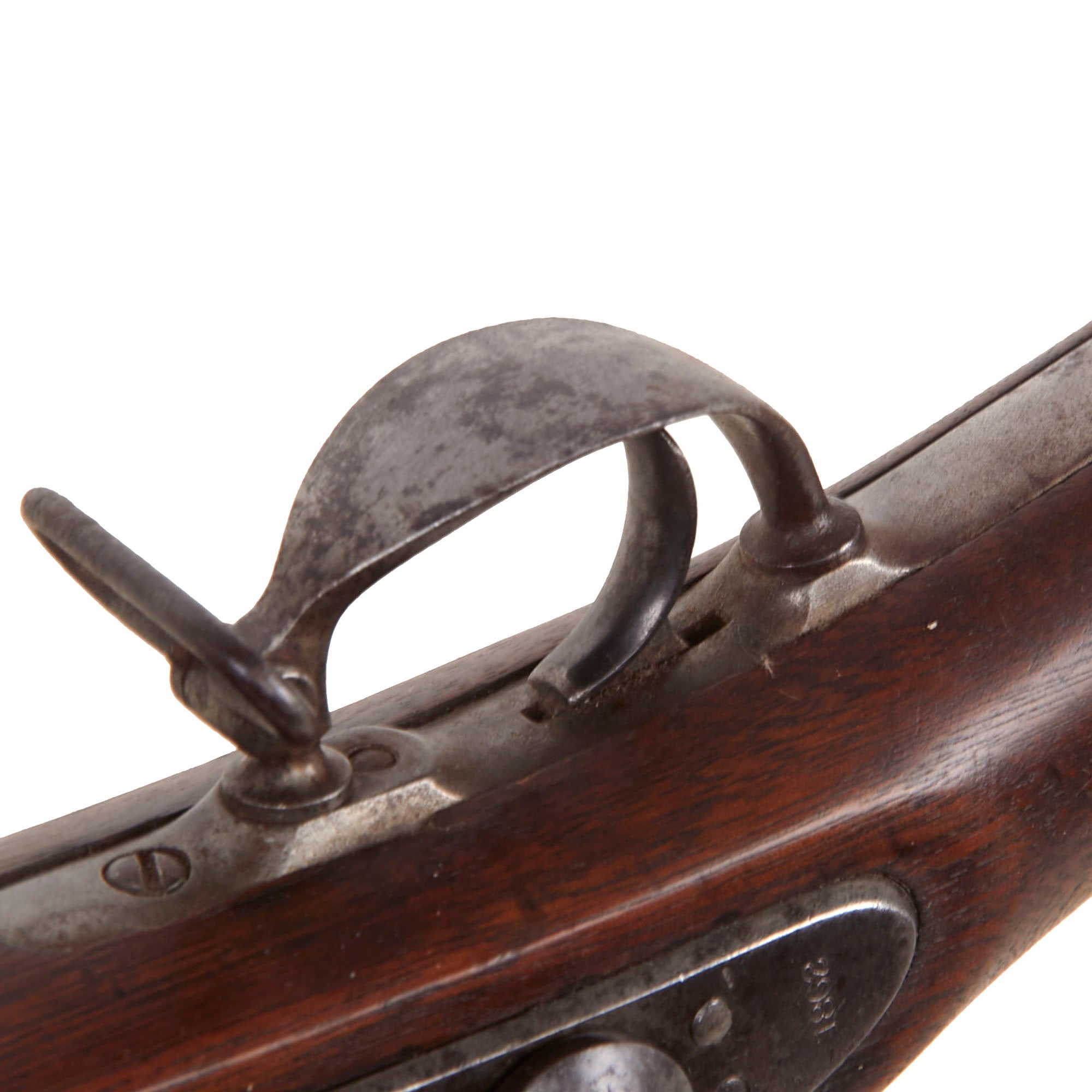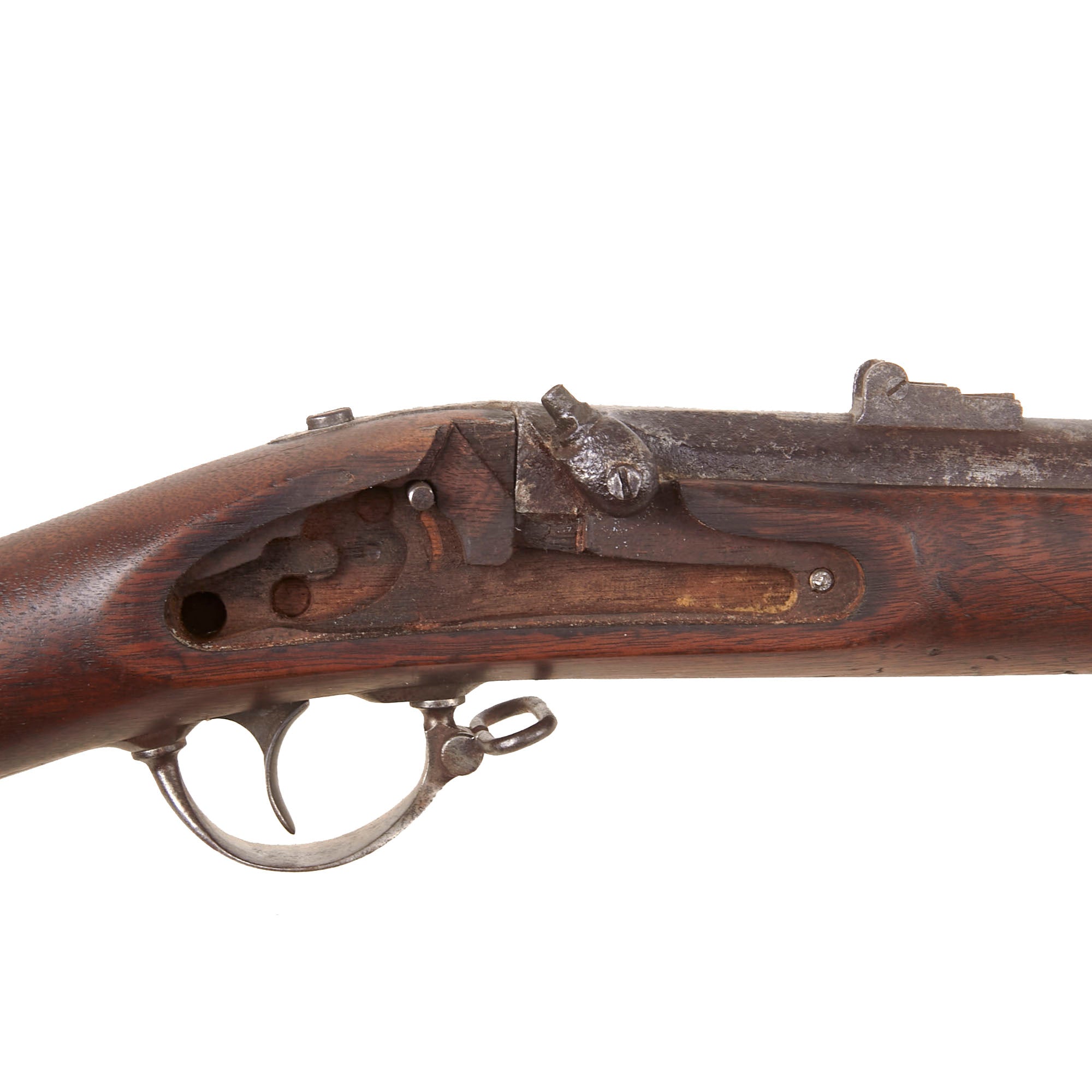 The musket also looks to have led a somewhat interesting life, as close examination shows that the stock was replaced at some point, we believe during wartime. The left side of the stock has two oval CG cartouches, which indicate inspection by George Curtis, a Union Inspector who worked early in the war. The stocks for the Union and Confederate muskets were virtually identical except for the lock inlet, so this would not have been a major undertaking. At this point the rear sight was also replaced with a Model 1863 two leaf type with a sight hole for 300 yards. This musket has definitely existed in its present form for quite some time, with a matching oxidized patina.