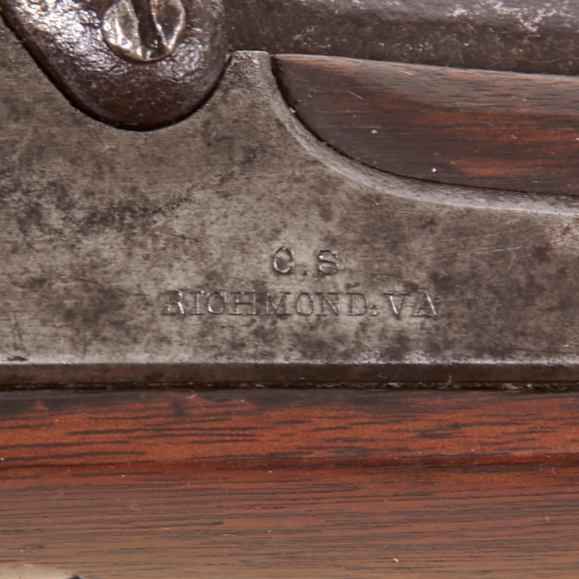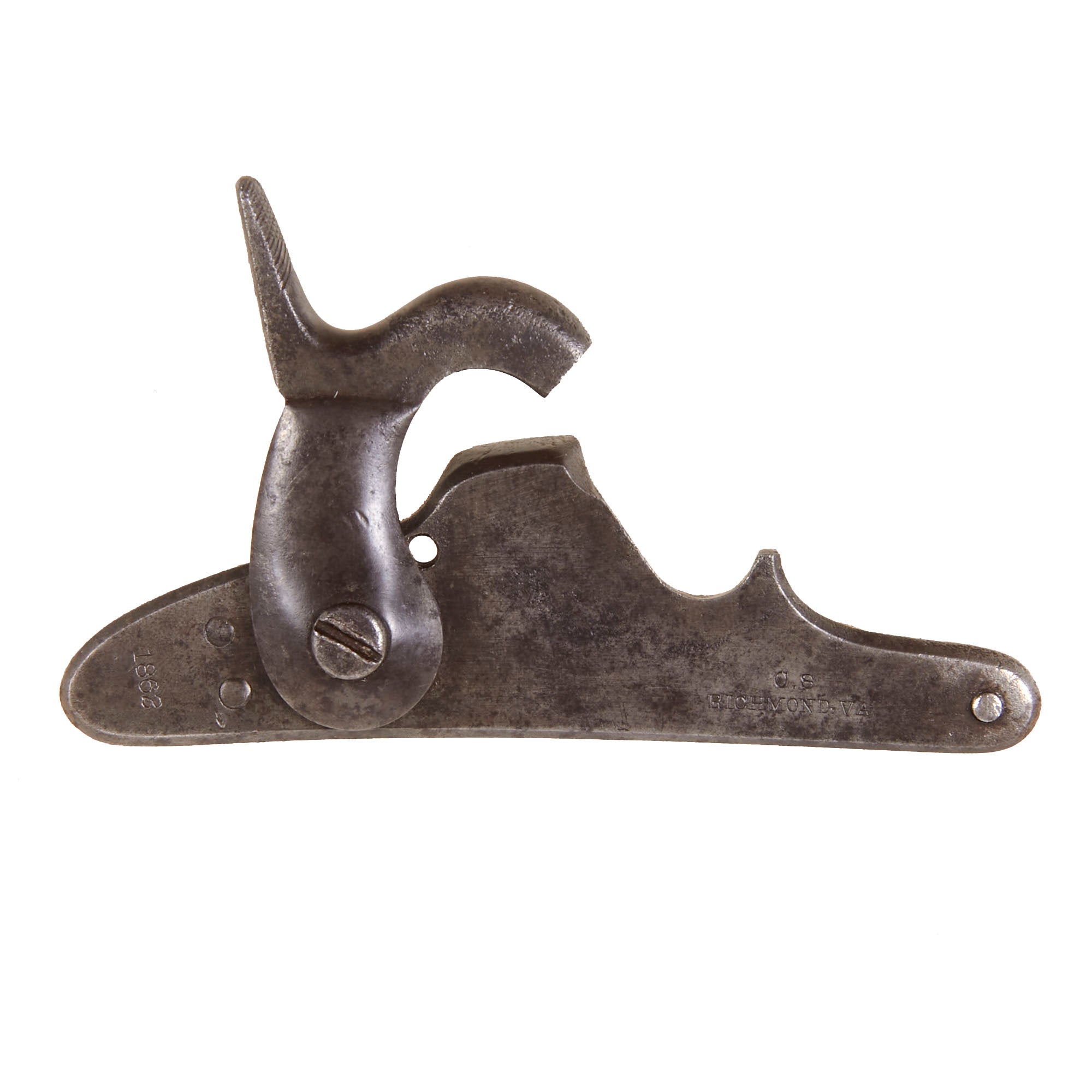 Our example has the Classic TYPE 4 LOW HUMP lock plate, NOT incorporating the Maynard tape primer system used on the M-1855 Muskets from Harper's Ferry. It is not ground off, but originally molded as a "low hump", and we have removed the lock to check to make sure everything is in order. The lock is marked C.S. / RICHMOND, VA on the front, with 1862 on the lock plate tail, as per the pattern. The font is correct and identical to other known examples, and the interior of the lock is also completely correct. We checked the lock action, and it holds correctly at half cock, firing at full. We did note that the upper lock screw is broken off, with the end stuck in the lock, which looks to have happened a long ago.