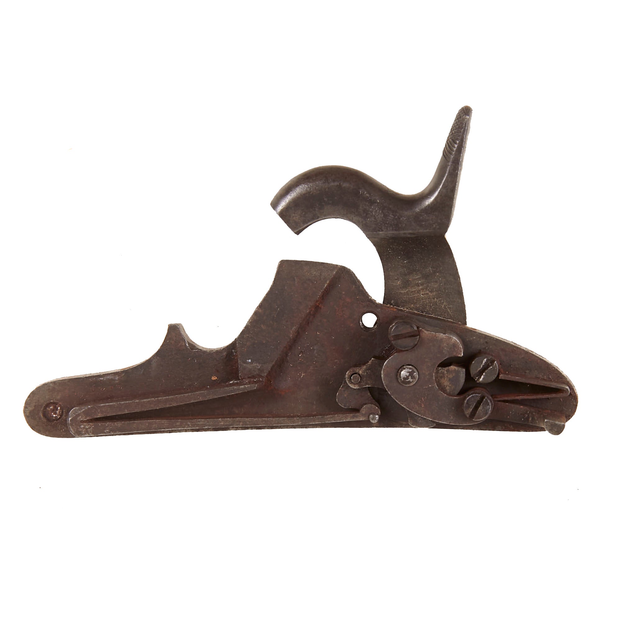 Overall condition is very nice, showing a lovely aged patina on the metalwork, showing some wear and past peppering, which gives the musket a great service used look. There is no major pit rusting, except some around the cap nipple cone, where powder burn has corroded the surface. We can also see what look to be vise marks, so the breech plug may have been pulled at some point to clean out the breech. The cleanout on the cap bolster still has a good slot, but it is completely seized.
