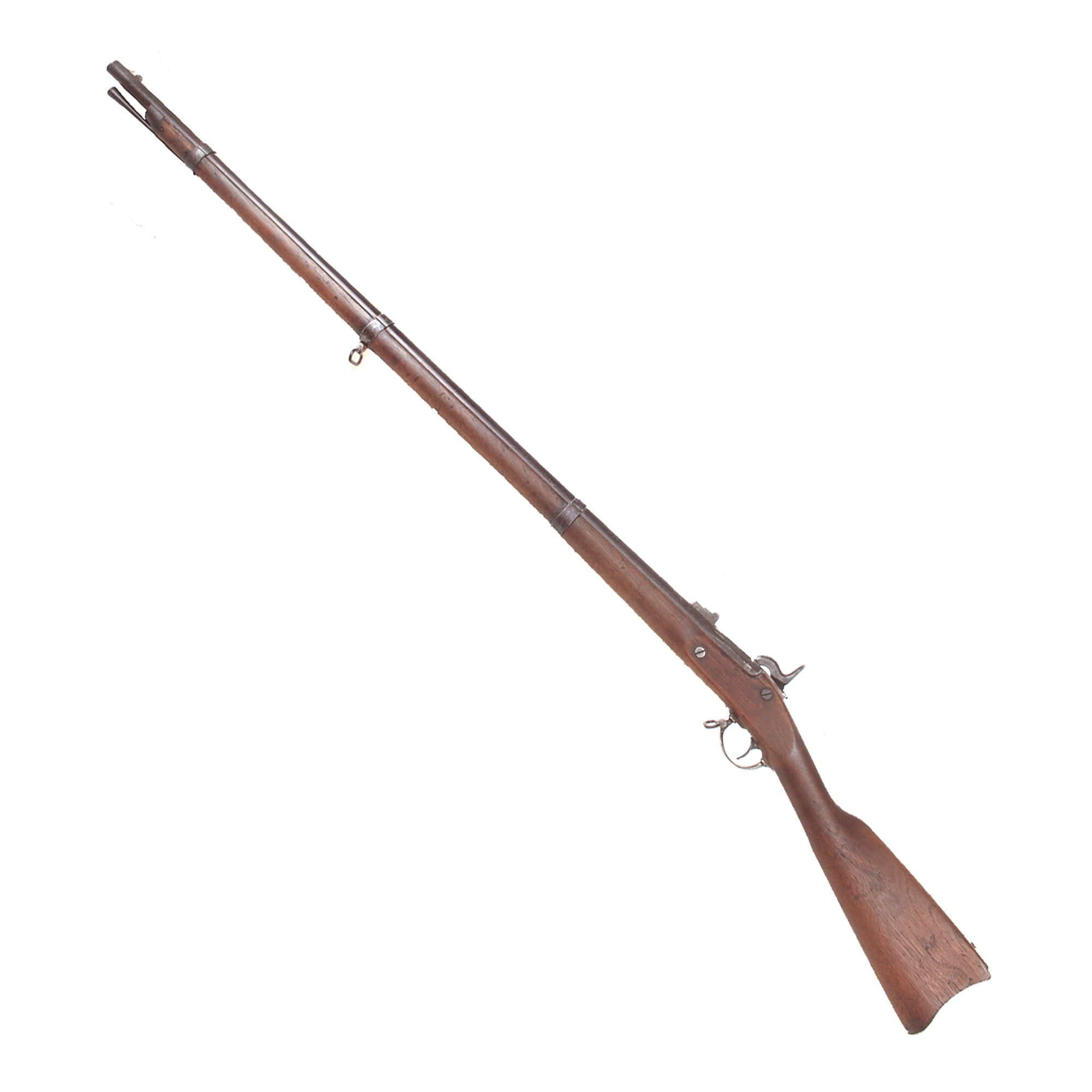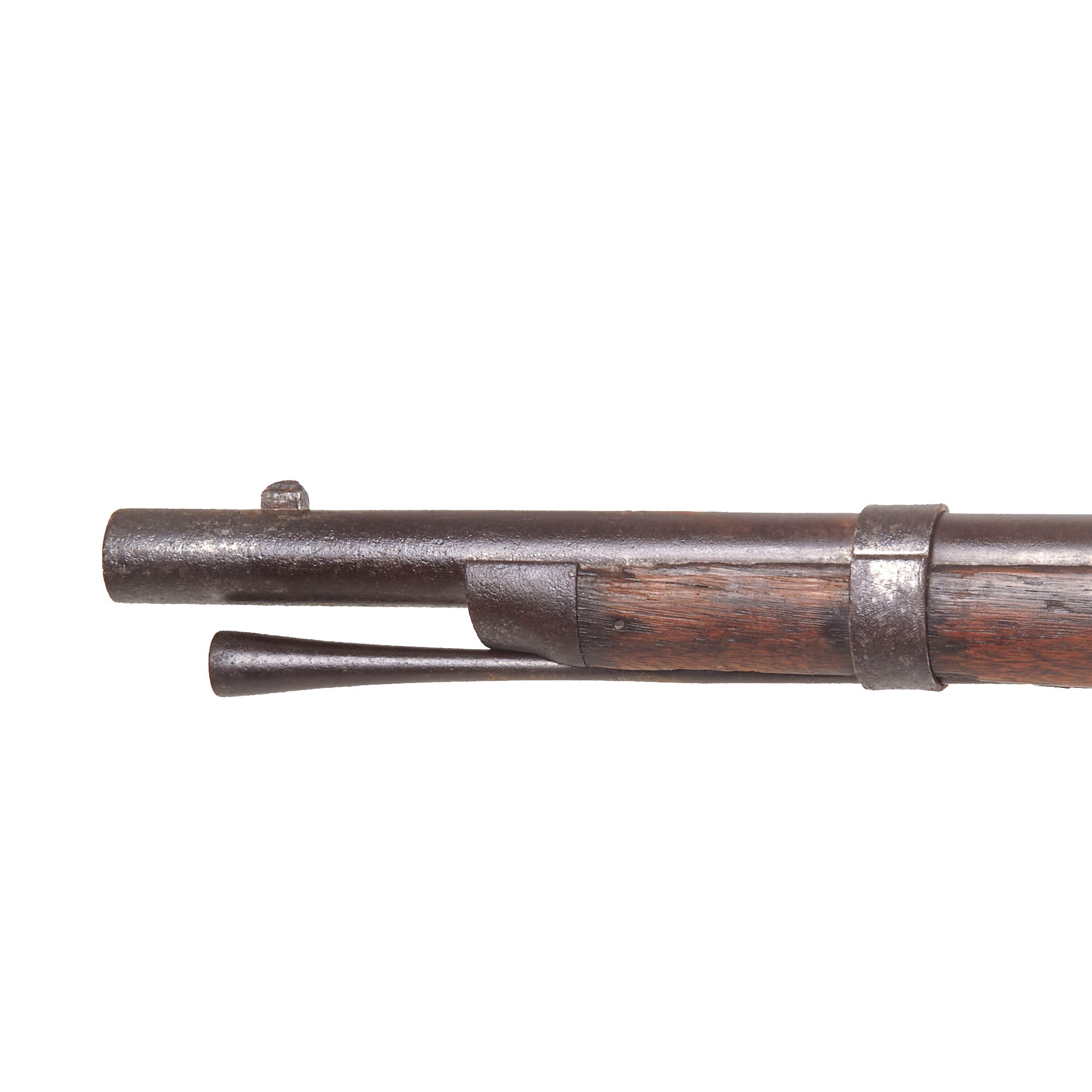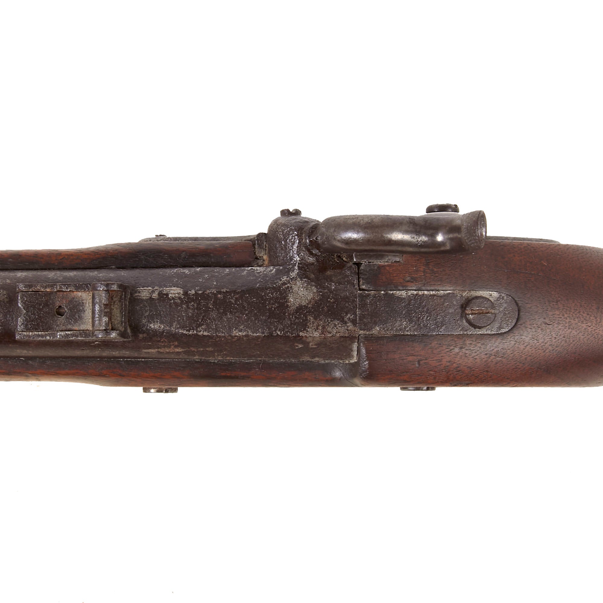 The stock is also in very nice shape, with a lovely color showing the expected wear from long use and having been through a war. We do not see any major repairs or damage, however there is definitely a lot of chipping and some slivers missing on the bottom of the fore stock along the edge of the ramrod channel. There is also a crack running from the lower lock screw to the barrel breech area, a very common place to see these. Both sling swivels are present and move easily, and the original tulip head iron ramrod without an enlarged shank is still present under the barrel, and in good shape.