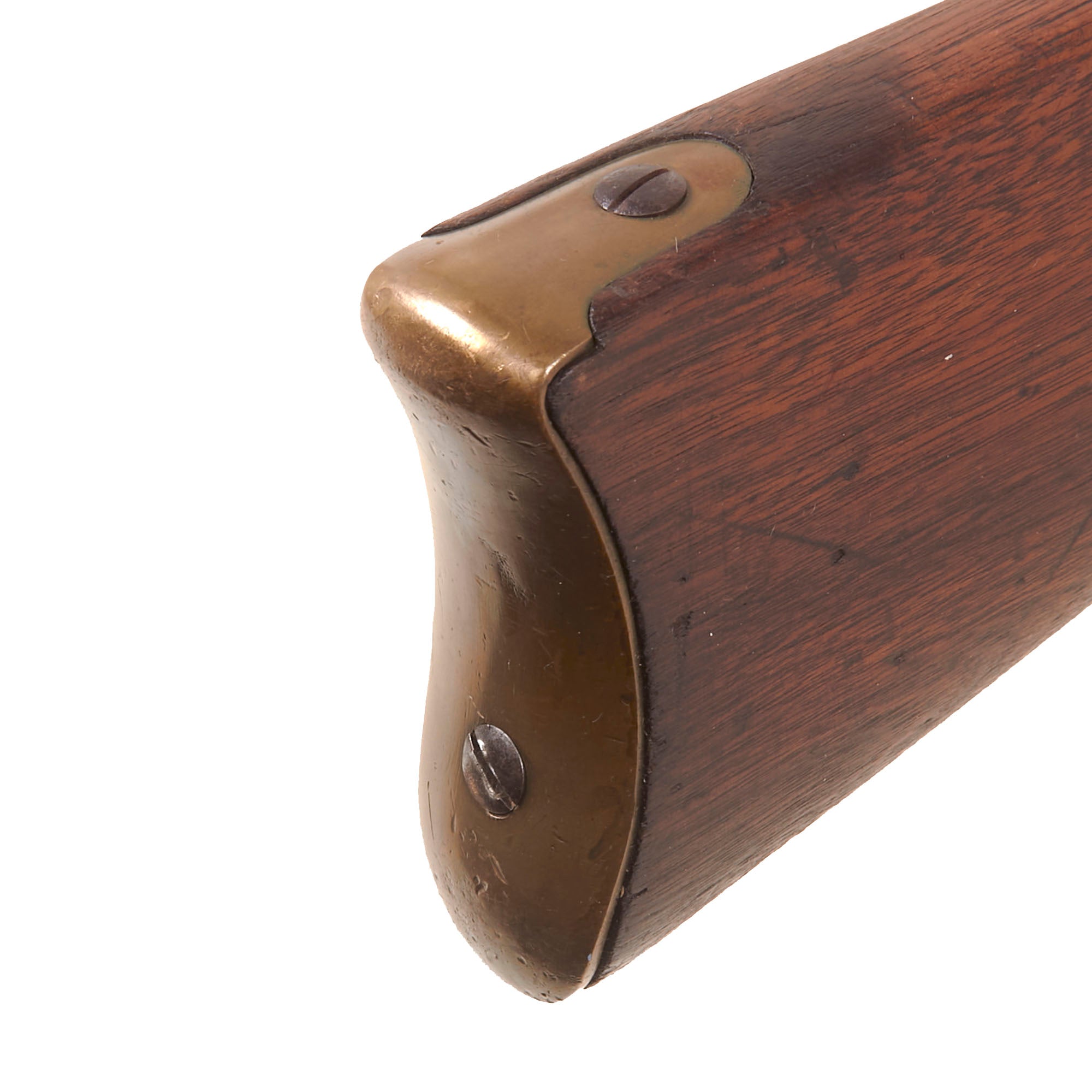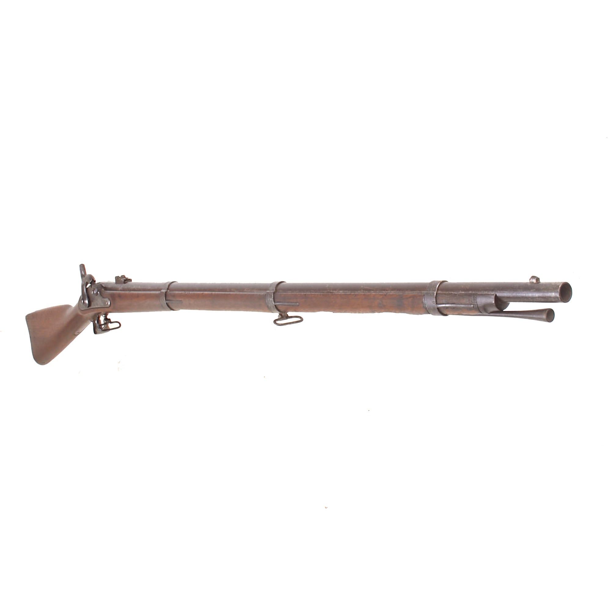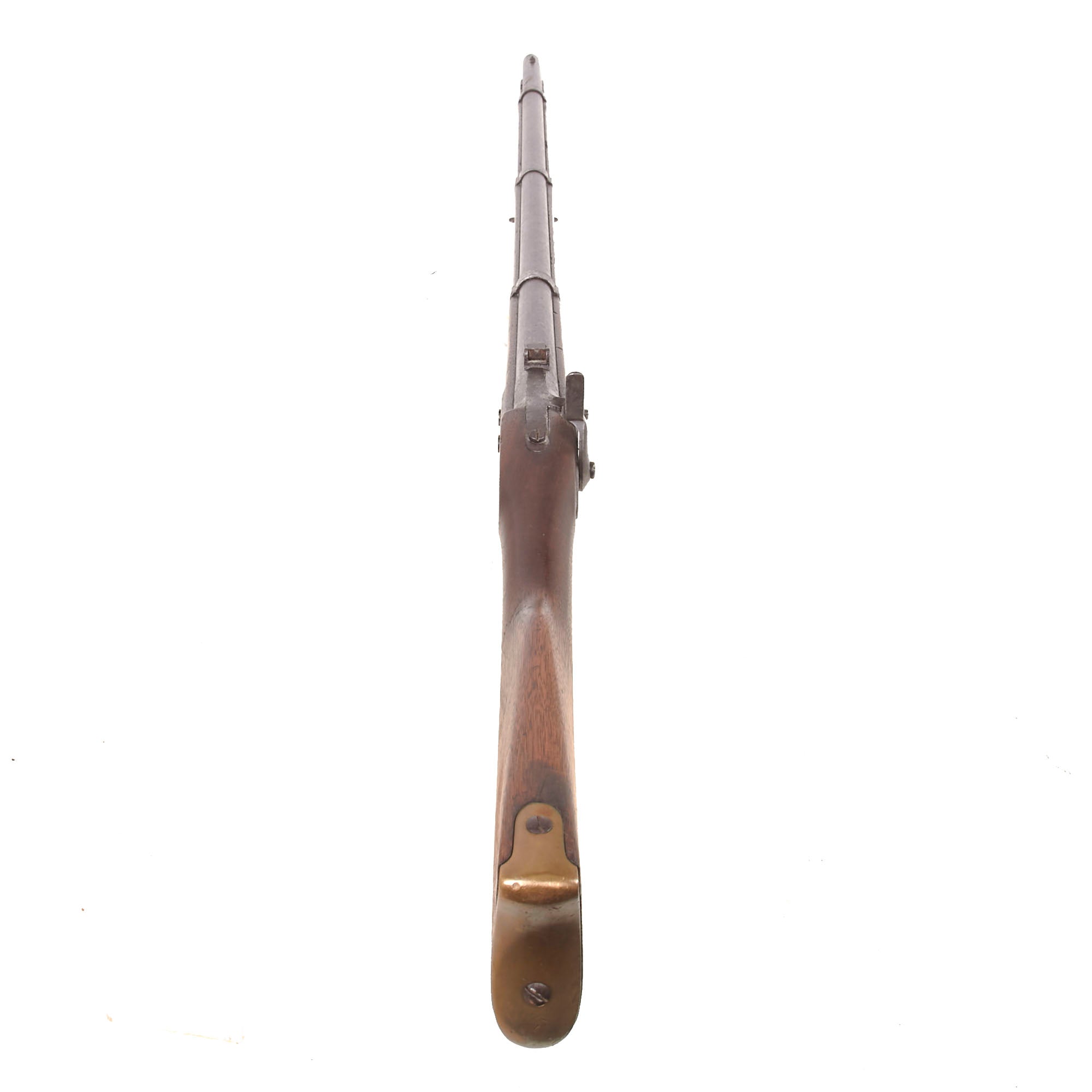 The stock is also in very nice shape, with a lovely color showing the expected wear from long use and having been through a war. We do not see any major repairs or damage, however there is definitely a lot of chipping and some slivers missing on the bottom of the fore stock along the edge of the ramrod channel. There is also a crack running from the lower lock screw to the barrel breech area, a very common place to see these. Both sling swivels are present and move easily, and the original tulip head iron ramrod without an enlarged shank is still present under the barrel, and in good shape.