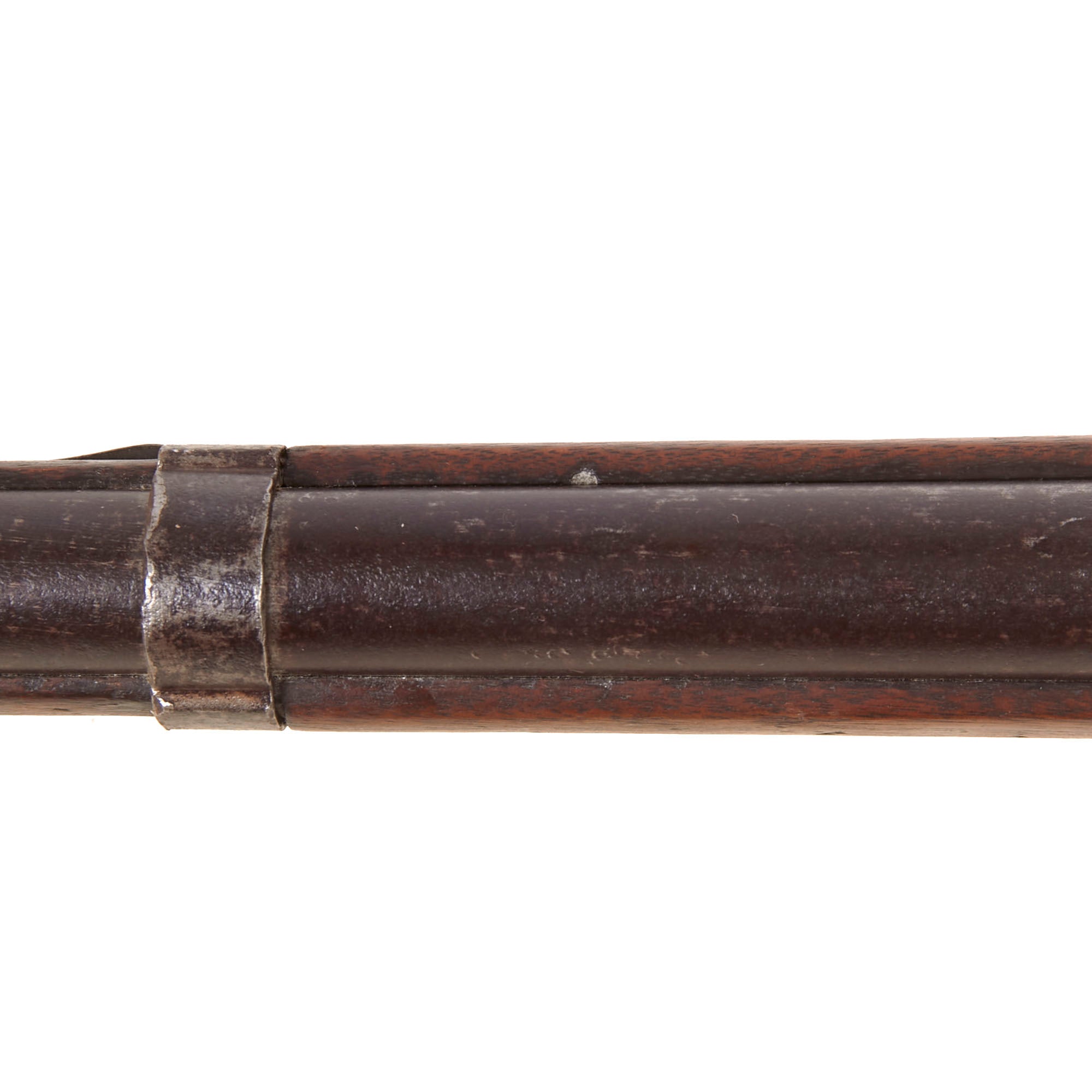 The barrel is the correct 40" in length and there are faint V / P / Eagle's Head proof marks on the breech left facet, which are correct for these rifles, especially the early ones. The bore of the barrel is quite worn, and measures out to about .597-.599". We checked with a bore light and there is no longer any trace of rifling, just past fouling and oxidation. It's fairly typical for Confederate muskets to have seen extensive use while in service.