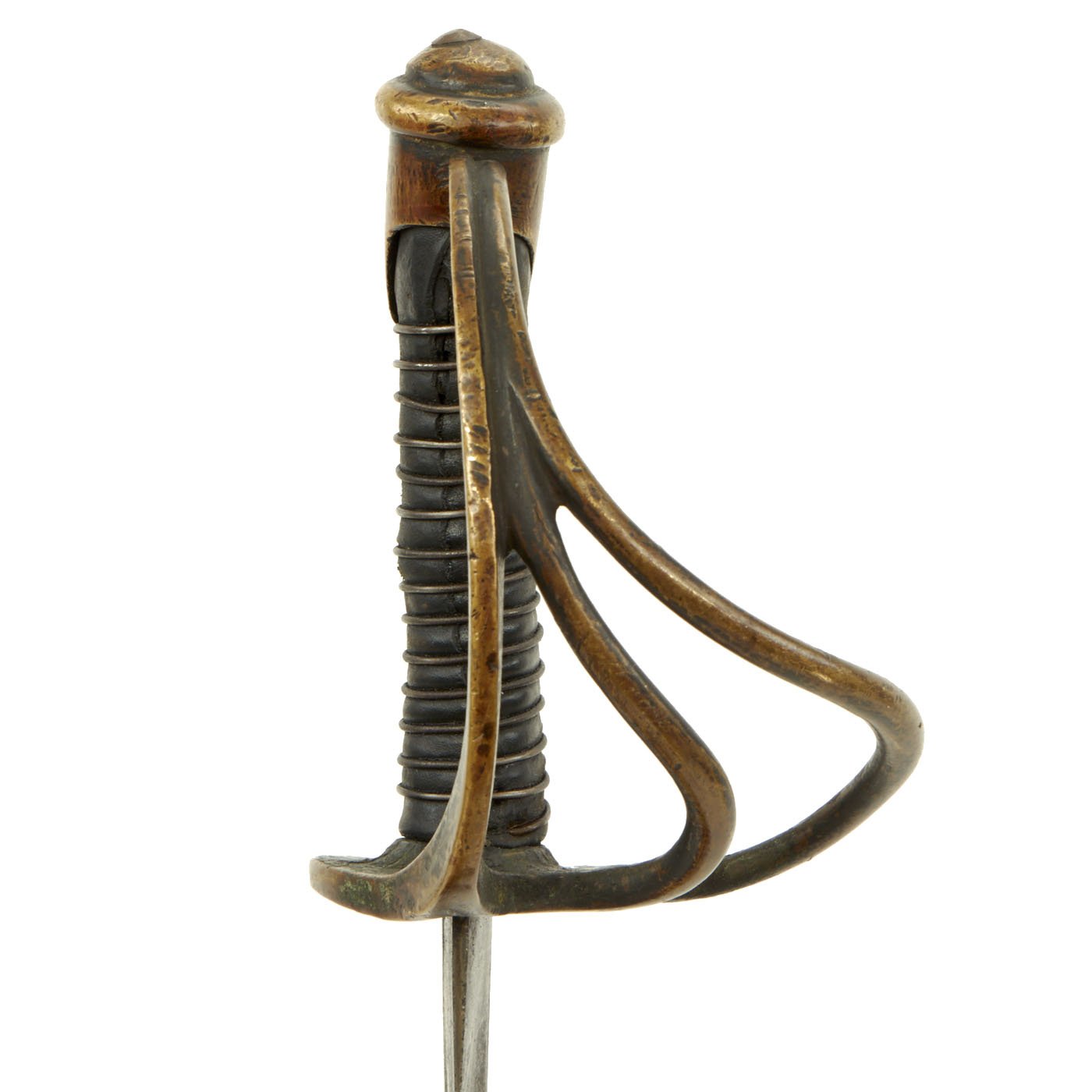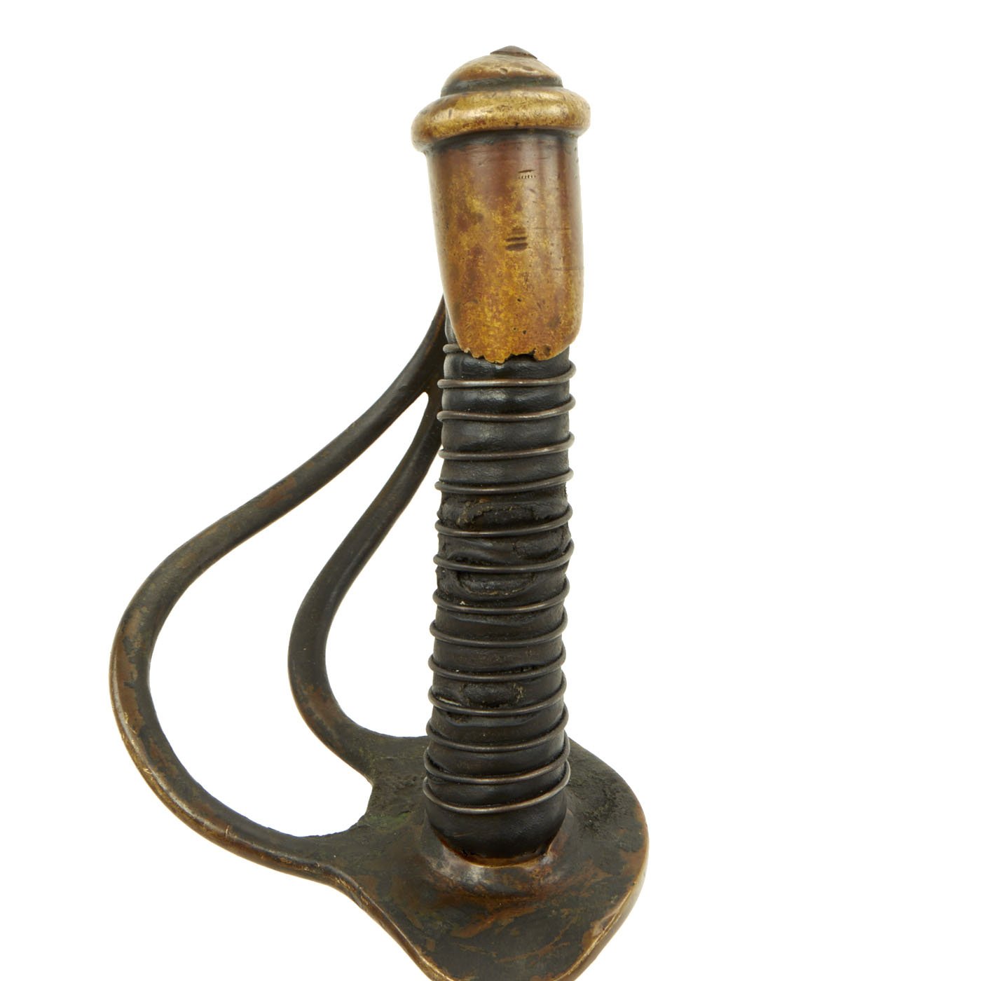 Original Item: Only One Available. This is a nice example of a Georgia-made Confederate Enlisted Man’s Cavalry Sabre, most likely made by Louis Haiman of Columbus, Georgia. The sword has typical features seen with the sabres made by his manufactory, such as long tapered unstopped fuller, curved handle, and single iron wire wrap on the handle. Of note are the forging flaws near the ricasso of the blade, one of the indicative features of a Georgia-Made Sabre. Generally, Georgian Cavalry Sabres have wooden grips wrapped in oil cloth. This particular Sabre is wrapped in leather. The leather is well worn, and matched the condition of the hilt, but may possibly be a later replacement.