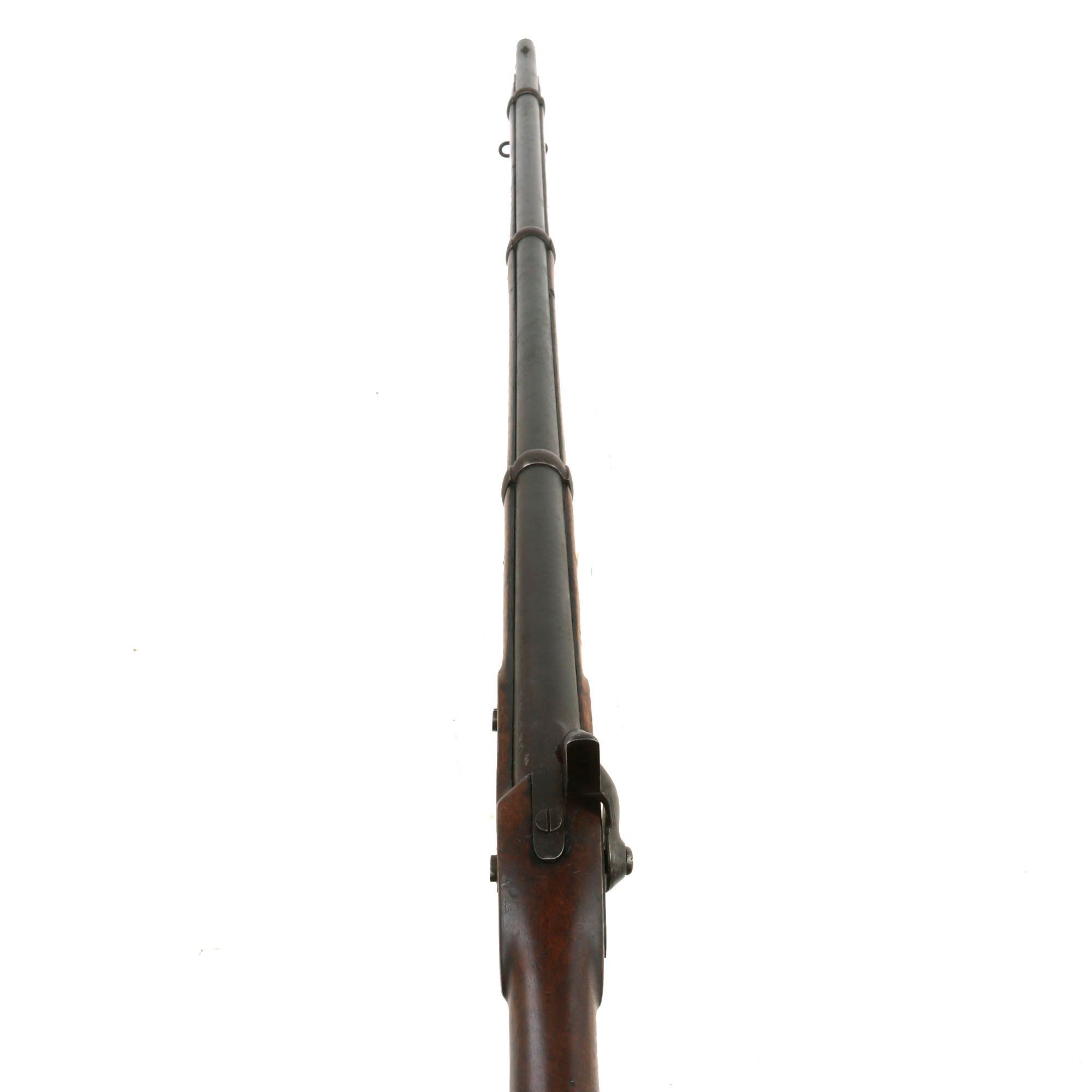 The gun is in very nice condition, with a nice stock and patinated steel metalwork. It does show signs of past pitting and powder burn, especially near the cap bolster, but also on the rest of the barre. The front sight is intact, however the rear sight is completely missing, probably removed long ago. The rifle still has both sling swivels and the original cleaning / ramrod, with intact threads on the end. The bore still shows clear three groove rifling, with the expected fouling and wear from service. The lock is fully functional, holding at half cock and firing at full.