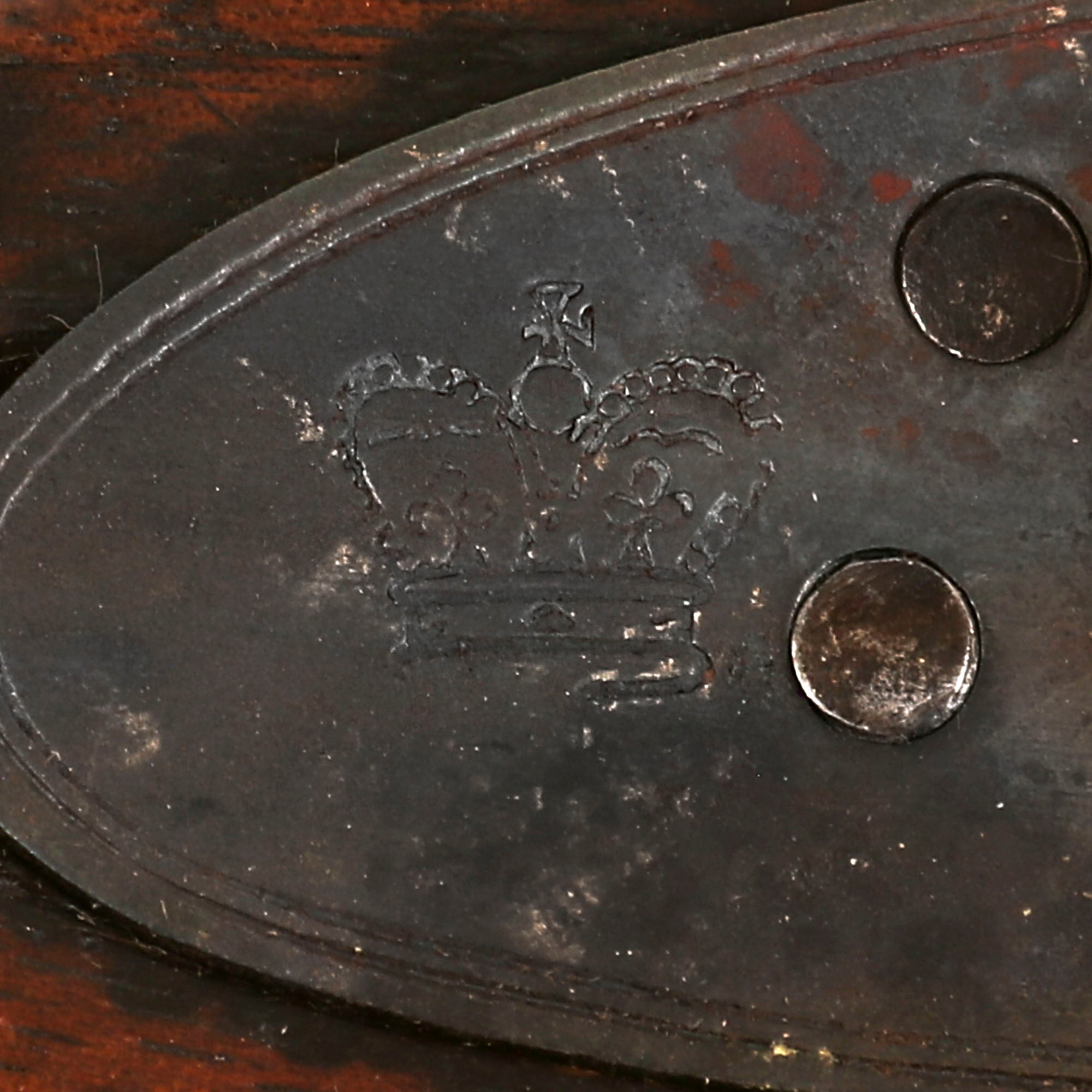 As a Confederate States of America destined weapon it should have the right hand side of the butt stamped with a roundel stating "BIRMINGHAM SMALL ARMS TRADE", however this marking is now gone due to wear. The barrel bears British Proof Marks, though they are somewhat faded. They are the correct Birmingham proof marks, including the CROWN / CROSSED SCEPTERS / BPC "proof" and CROWN / CROSSED SCEPTERS / V "viewed" marks. There is also the CROWN / BP definitive proof, and two 25 markings, indicating "25 bore" or about .571". There is also a SꞏW marking next to these, probably for the maker of the barrel.