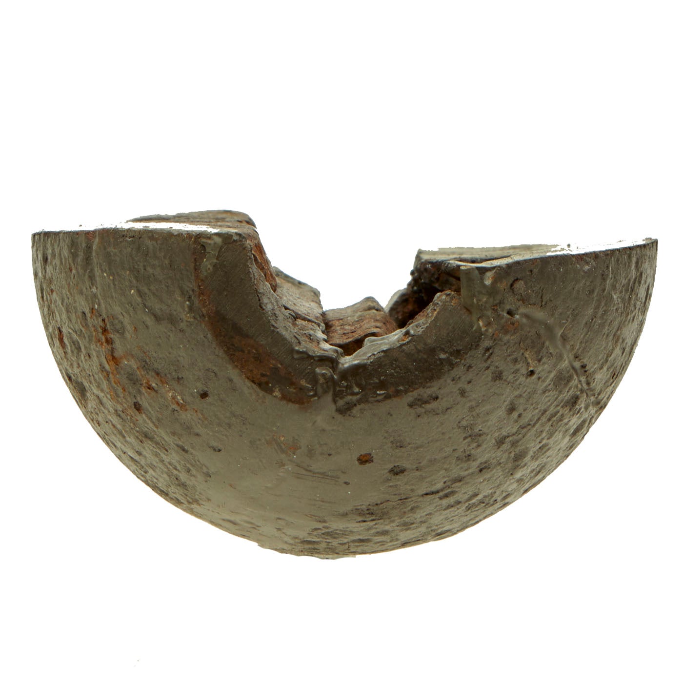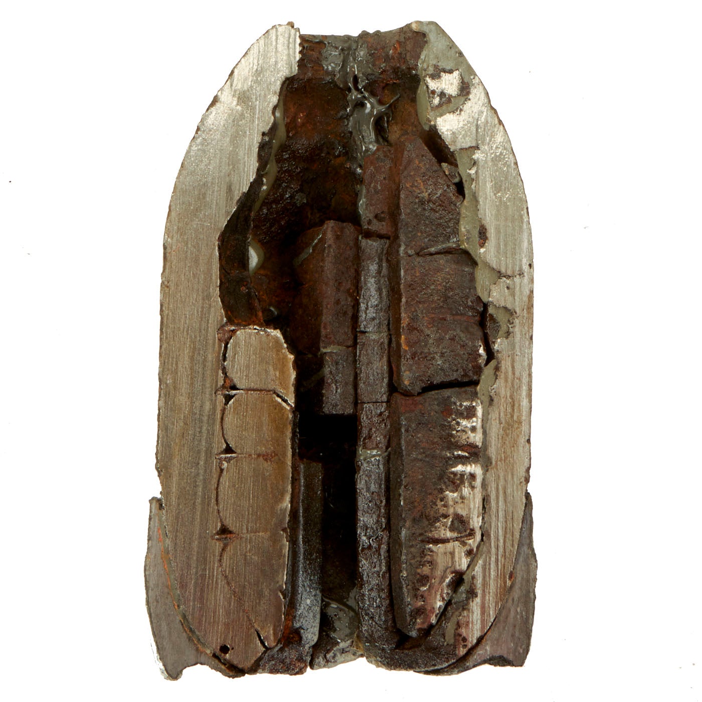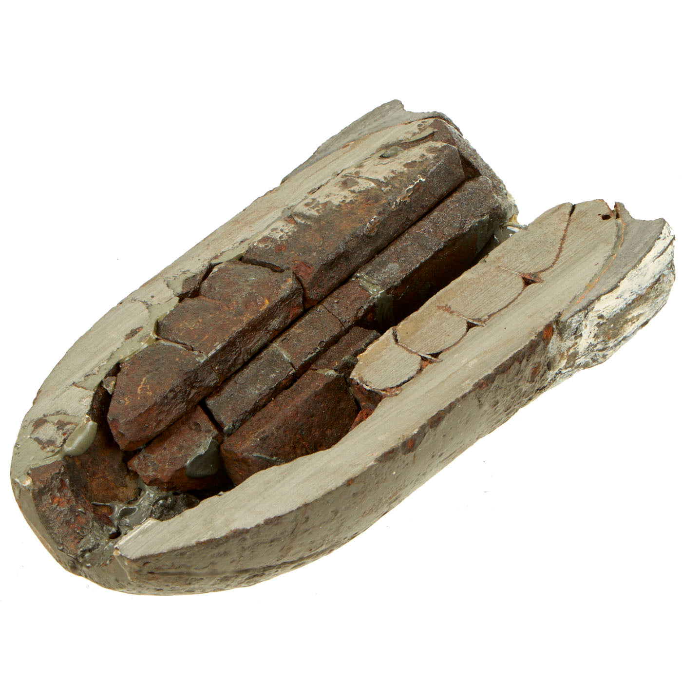 Original Item: Only One Available. Very well done cutaway display made from a Confederate rifled projectile fired from a cannon. This is a 3 ½” shell made of cast iron with lead cup sabot and stacks of wedge shaped steel case-shot. The iron surface shows moderate pitting, but is stable. Its lead cup sabot is complete and shows deep rifling of the seven grooves of the imported British Blakely rifle which fired this shell. Its steel wedge shape case shot are clearly visible. This is a wonderful excavated example of a genuine Confederate used artillery piece!