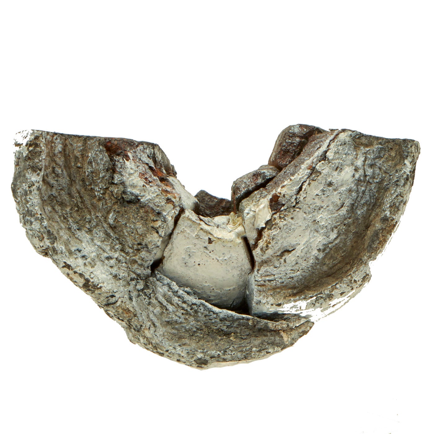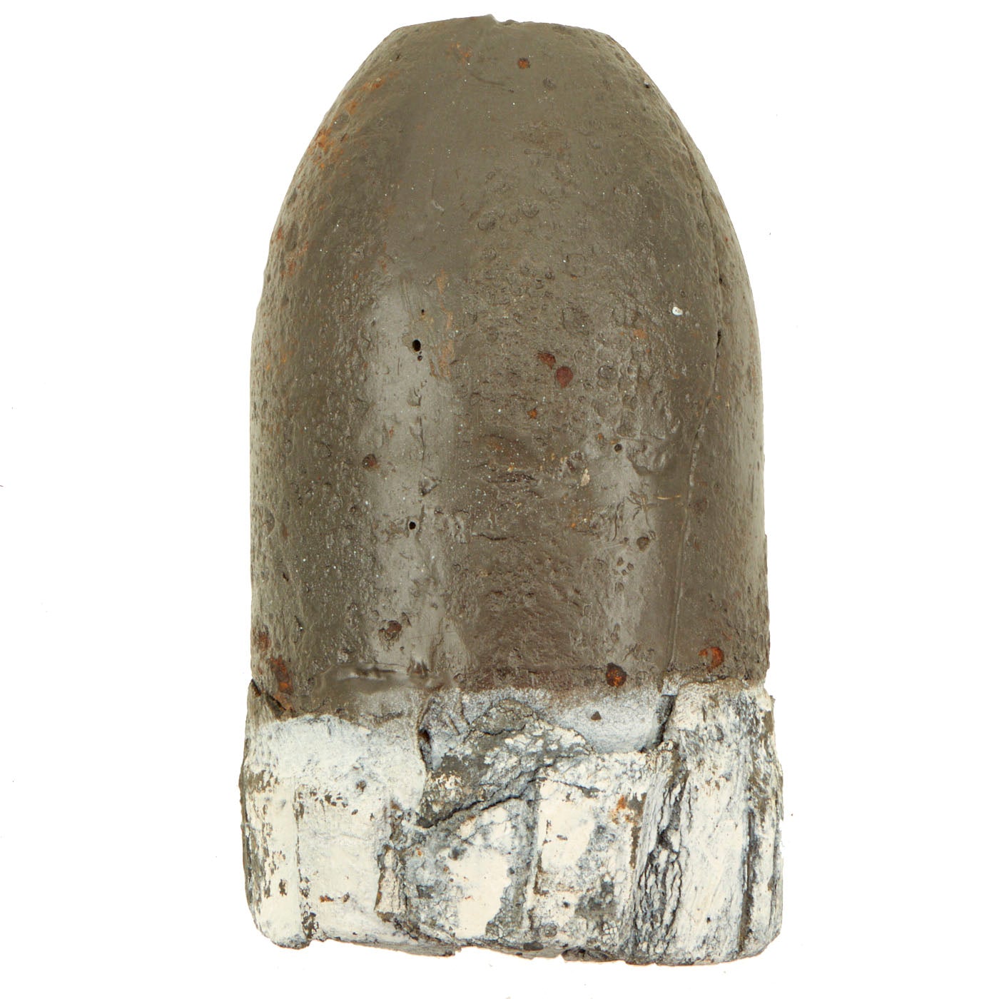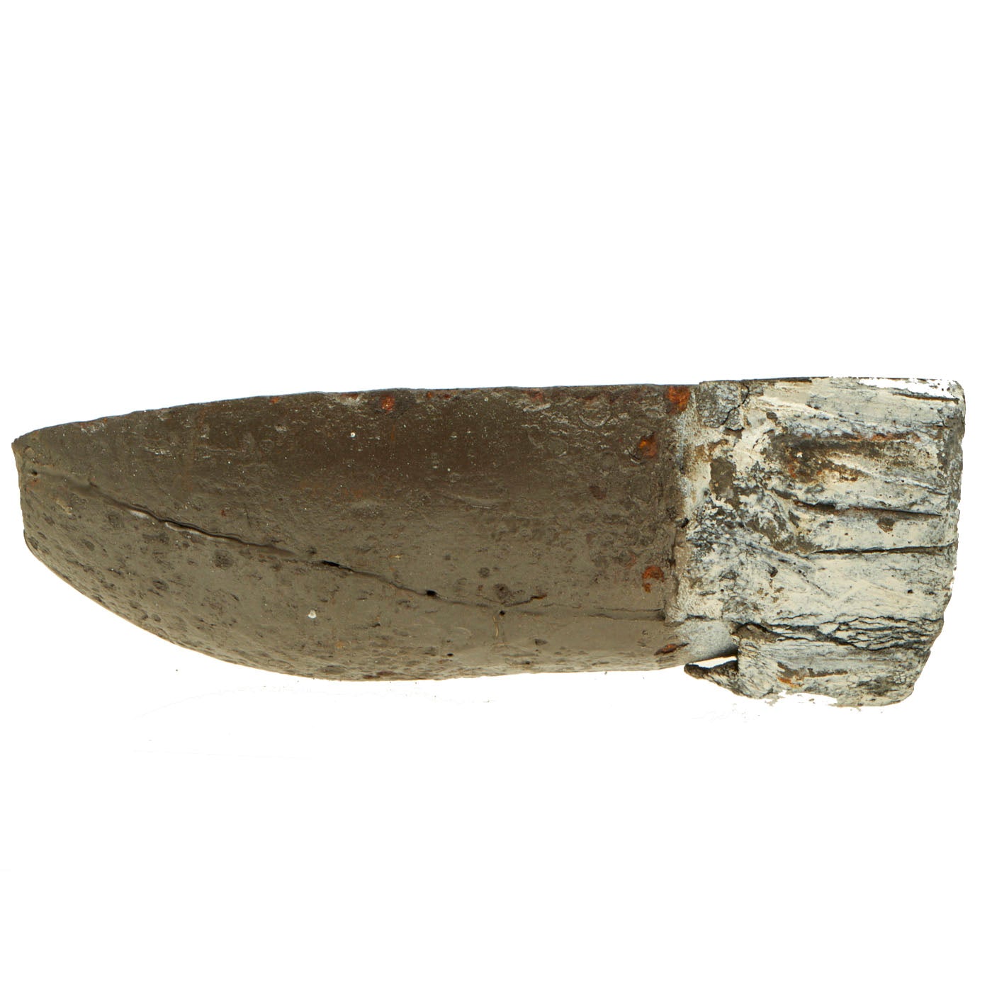 Original Item: Only One Available. Very well done cutaway display made from a Confederate rifled projectile fired from a cannon. This is a 3 ½” shell made of cast iron with lead cup sabot and stacks of wedge shaped steel case-shot. The iron surface shows moderate pitting, but is stable. Its lead cup sabot is complete and shows deep rifling of the seven grooves of the imported British Blakely rifle which fired this shell. Its steel wedge shape case shot are clearly visible. This is a wonderful excavated example of a genuine Confederate used artillery piece!