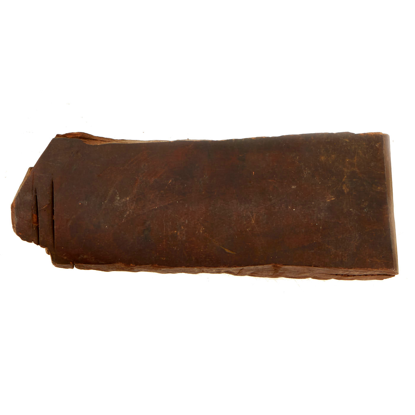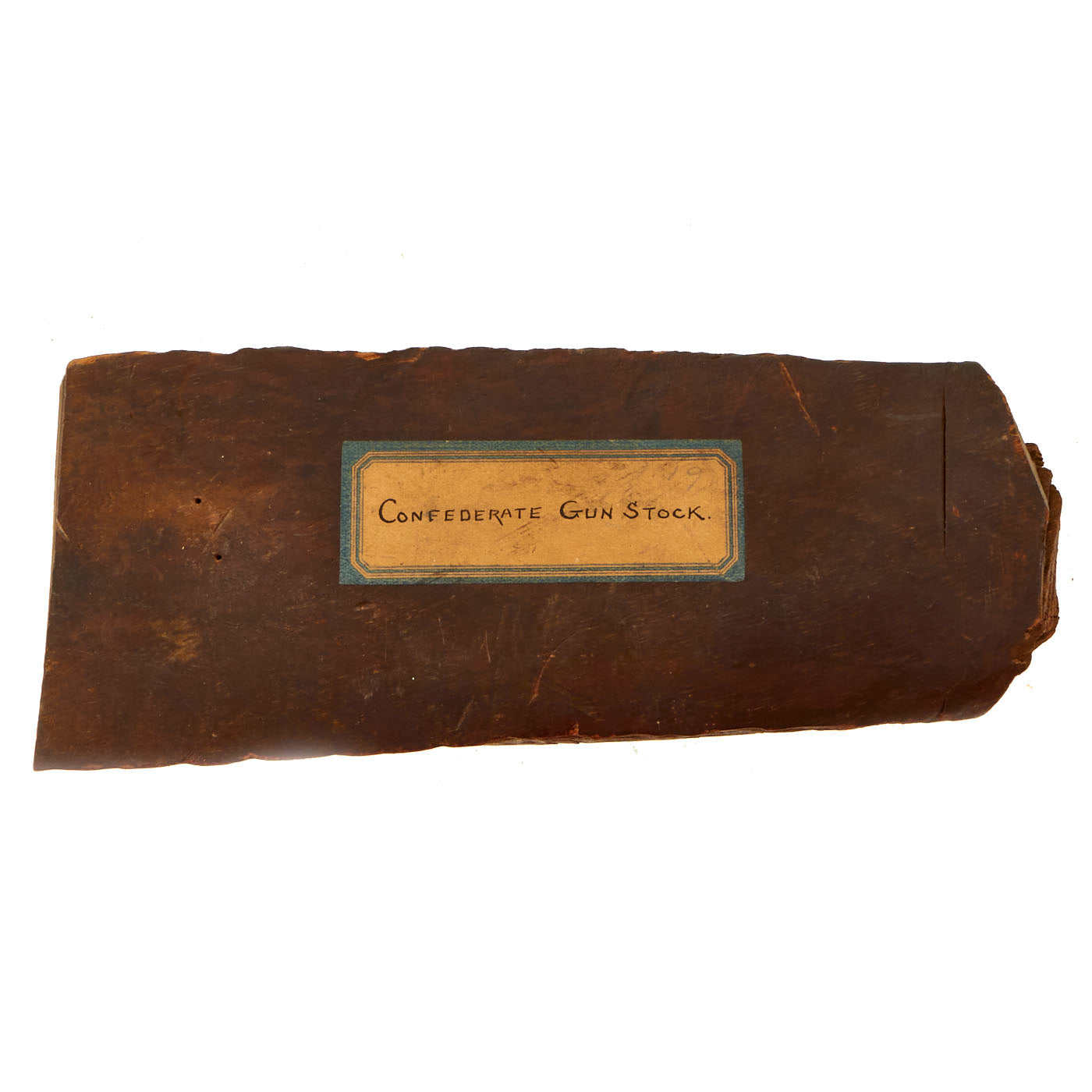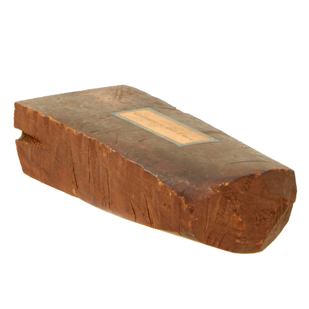 Original Item: Only One Available. Now this is a fantastic relic from the Civil War Era. This wood block is a removed section of the buttstock from a “Confederate Gun”. After careful examination of the shape, chisel marks and the angles of the screw placement for the now missing butt plate, we believe this to be a piece of a P1853 Enfield.