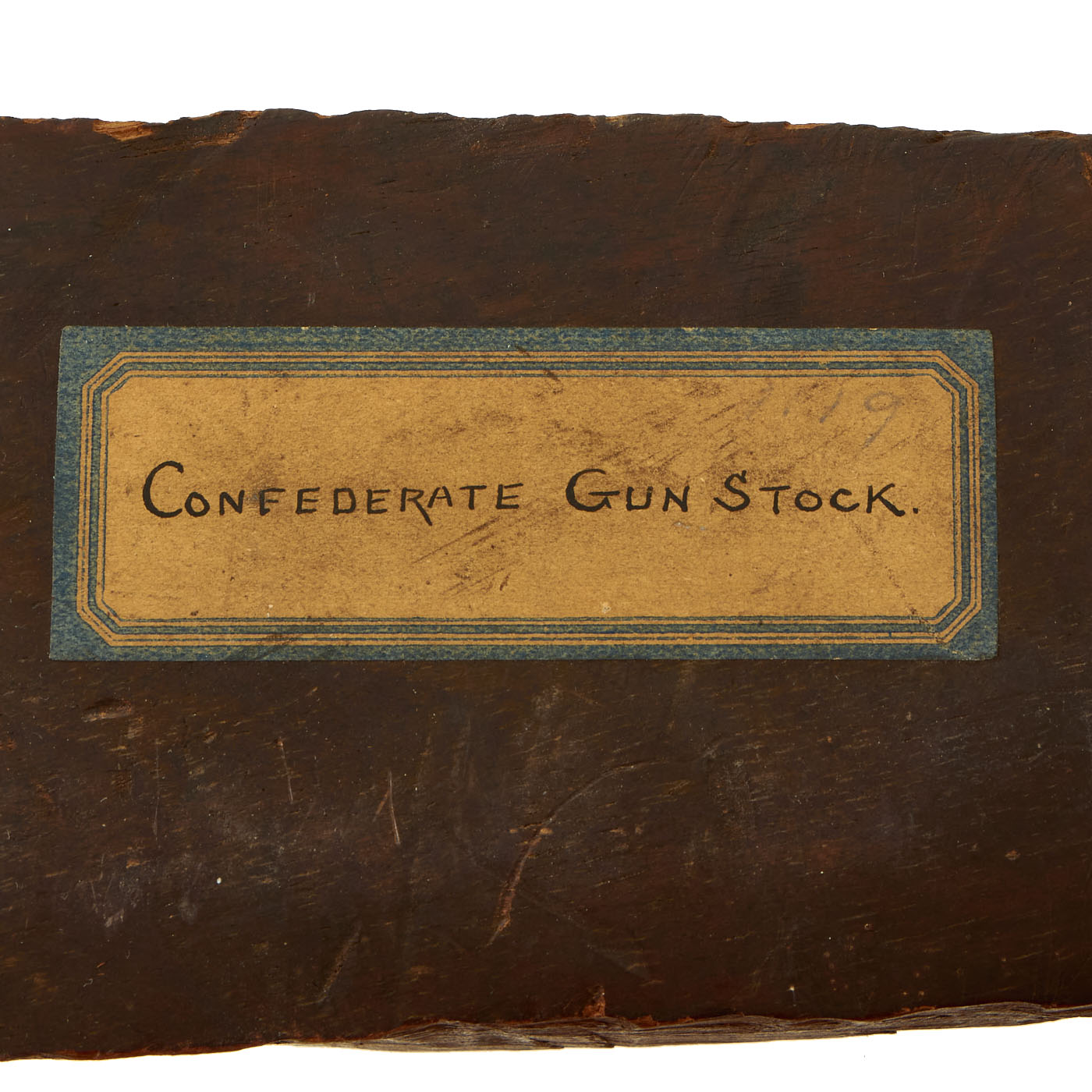 The condition is excellent, even though it does appear as being broken, this was more than likely recovered from the battlefield soon after the war ended. The wood itself was preserve quite nicely and still holds the appearance of having been recently removed. There is a small paper label present that dates to at least the turn of the century. The label still retains its original identifier information and reads as “CONFEDERATE GUN STOCK”. Now there is no way of proving this was in fact Confederate used, but we are fairly confident that the identification was correct. We believe this relic was from an old Grand Army of the Republic post, as they often had displays and small museums inside of their buildings.