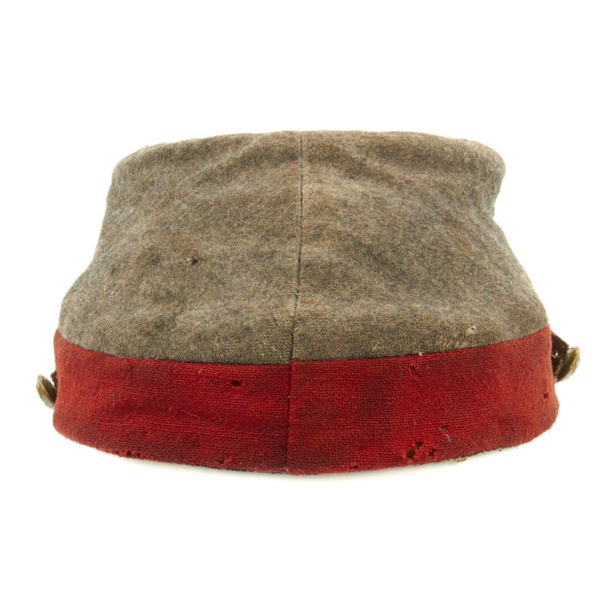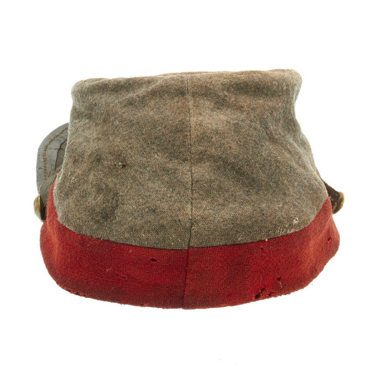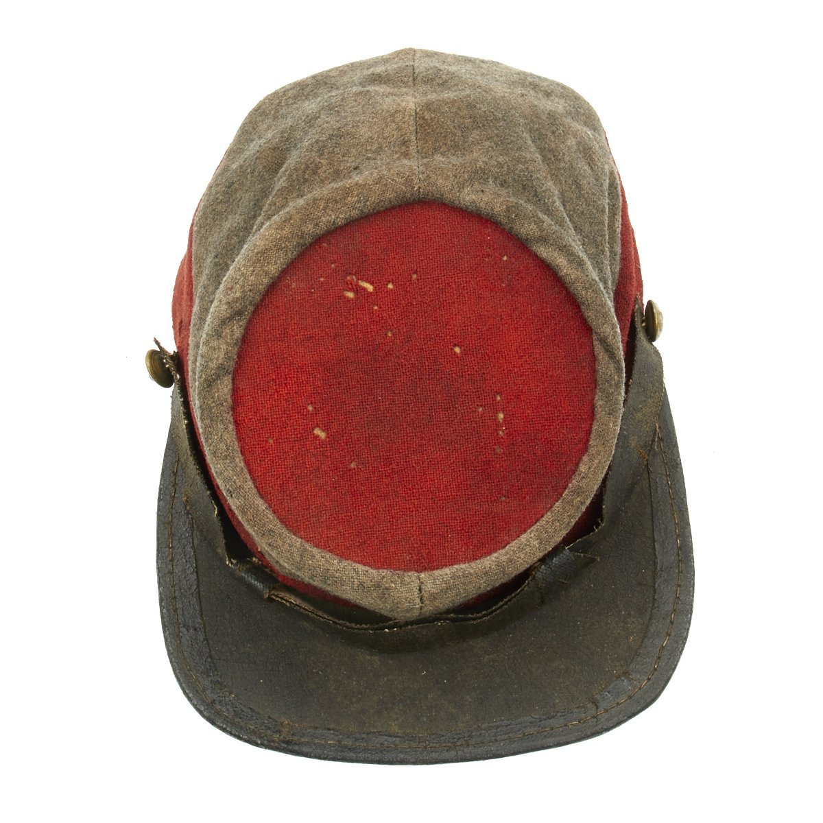 This wonderful kepi is construed from grey and red Kersey wool. During the mid-war period the largest mill in Virginia was the Crenshaw Woollen Mill in Richmond, which made "all wool goods". Another mill was the Danville Manufacturing Co. in Danville, Virginia. This firm also supplied "thousands of yards of Kersey" throughout the war. By 1863 the caps produced by the Richmond Depot had colored bands and crowns. Three existing caps at the museum of the Confederacy can be used as references. This exceptional kepi features a red band and crown with cadet grey sides.