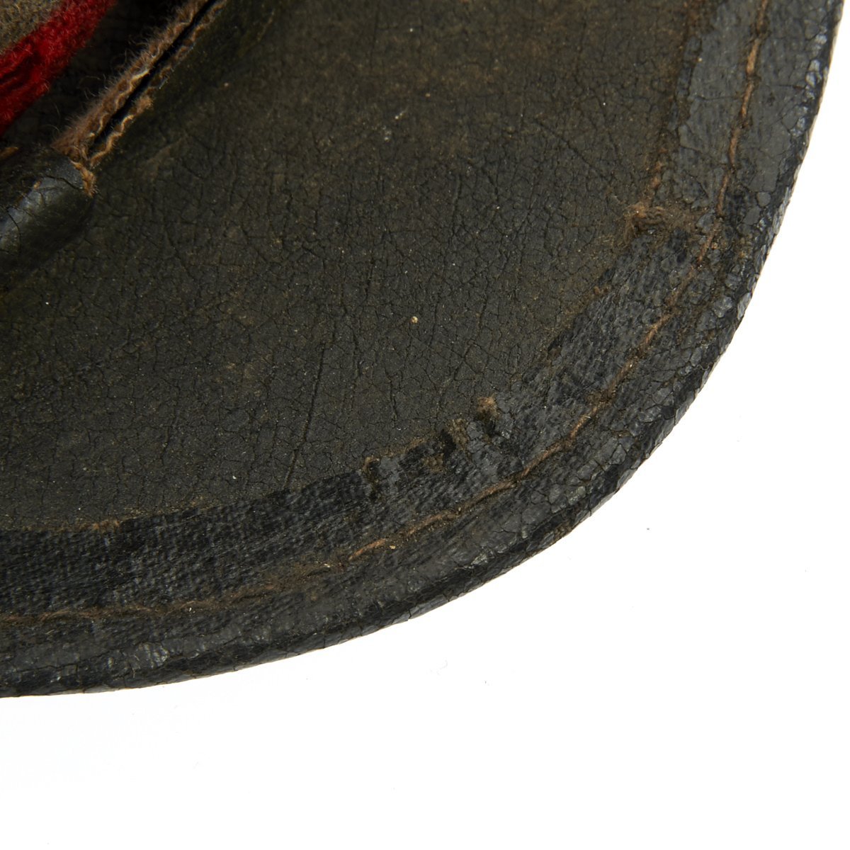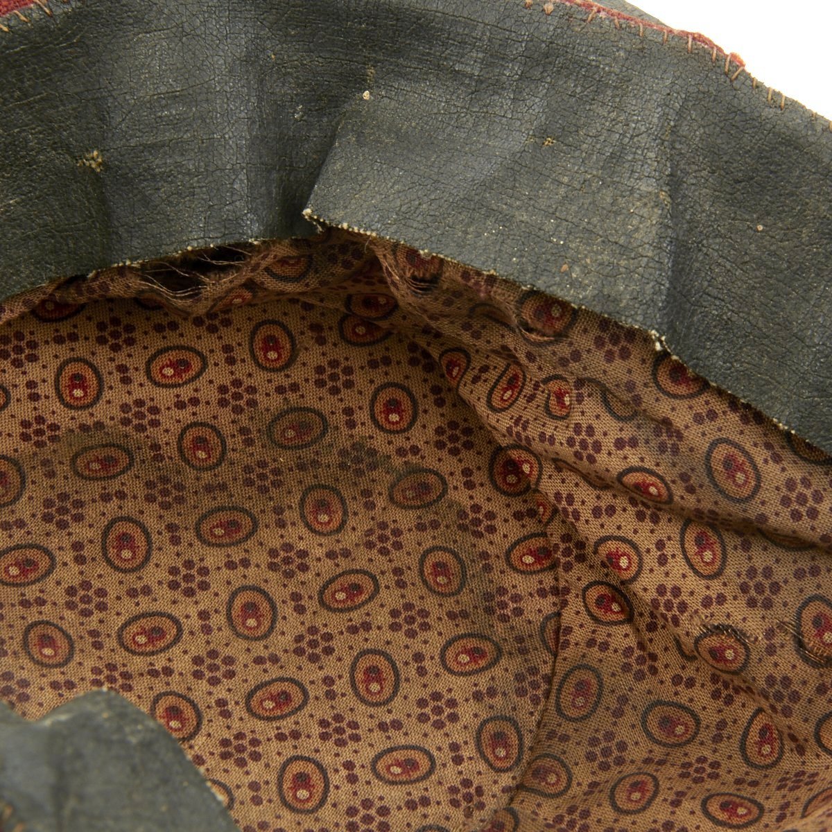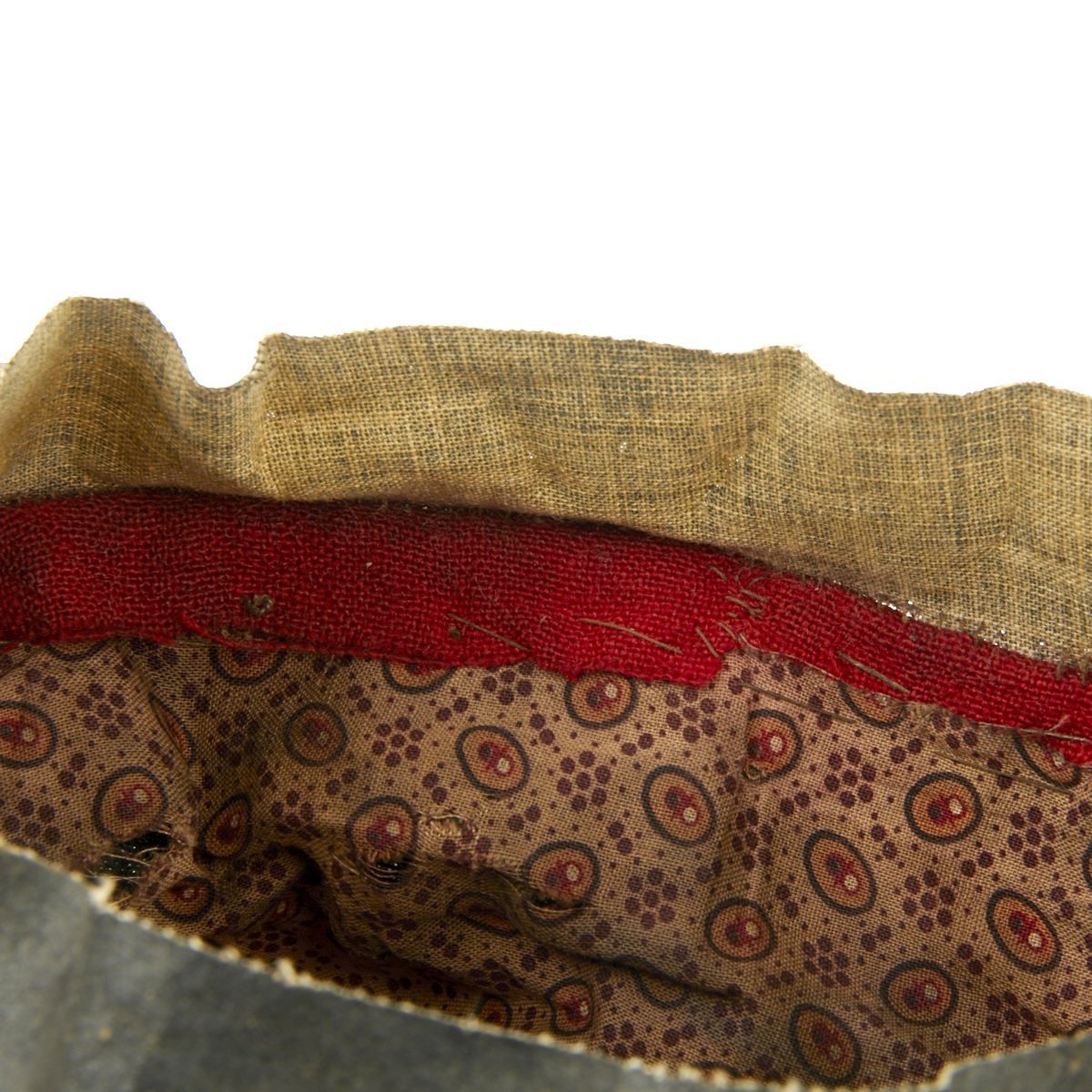 This wonderful kepi is construed from grey and red Kersey wool. During the mid-war period the largest mill in Virginia was the Crenshaw Woollen Mill in Richmond, which made "all wool goods". Another mill was the Danville Manufacturing Co. in Danville, Virginia. This firm also supplied "thousands of yards of Kersey" throughout the war. By 1863 the caps produced by the Richmond Depot had colored bands and crowns. Three existing caps at the museum of the Confederacy can be used as references. This exceptional kepi features a red band and crown with cadet grey sides.