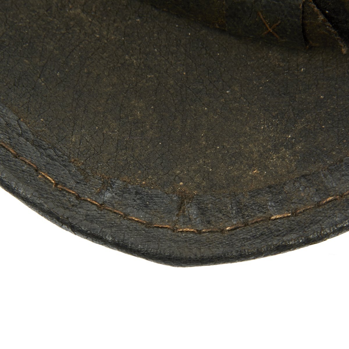 Due to the scarcity of leather by 1863, the flat visor is made from layers of thin card, which were glued together and covered in black painted cloth. The visor is bound around the edges with a thin piece of leather with stitching through the center