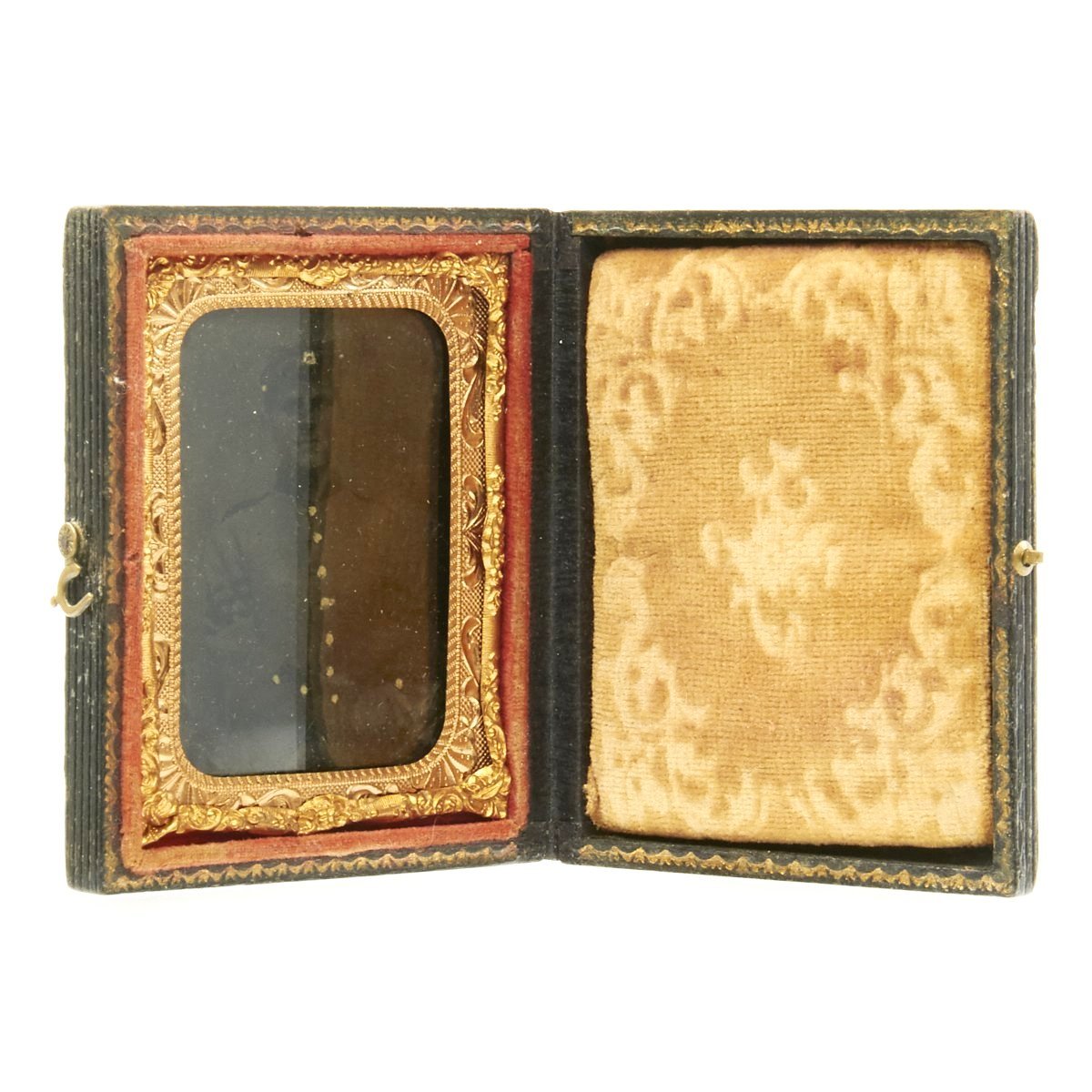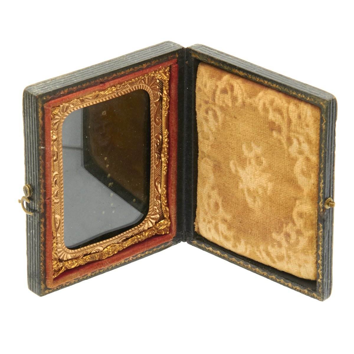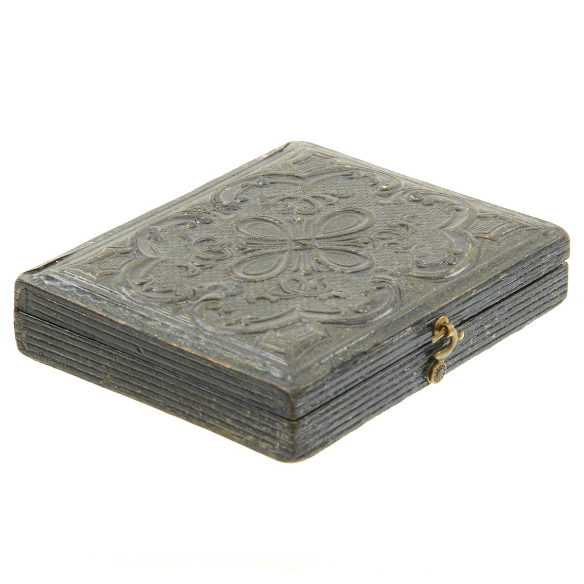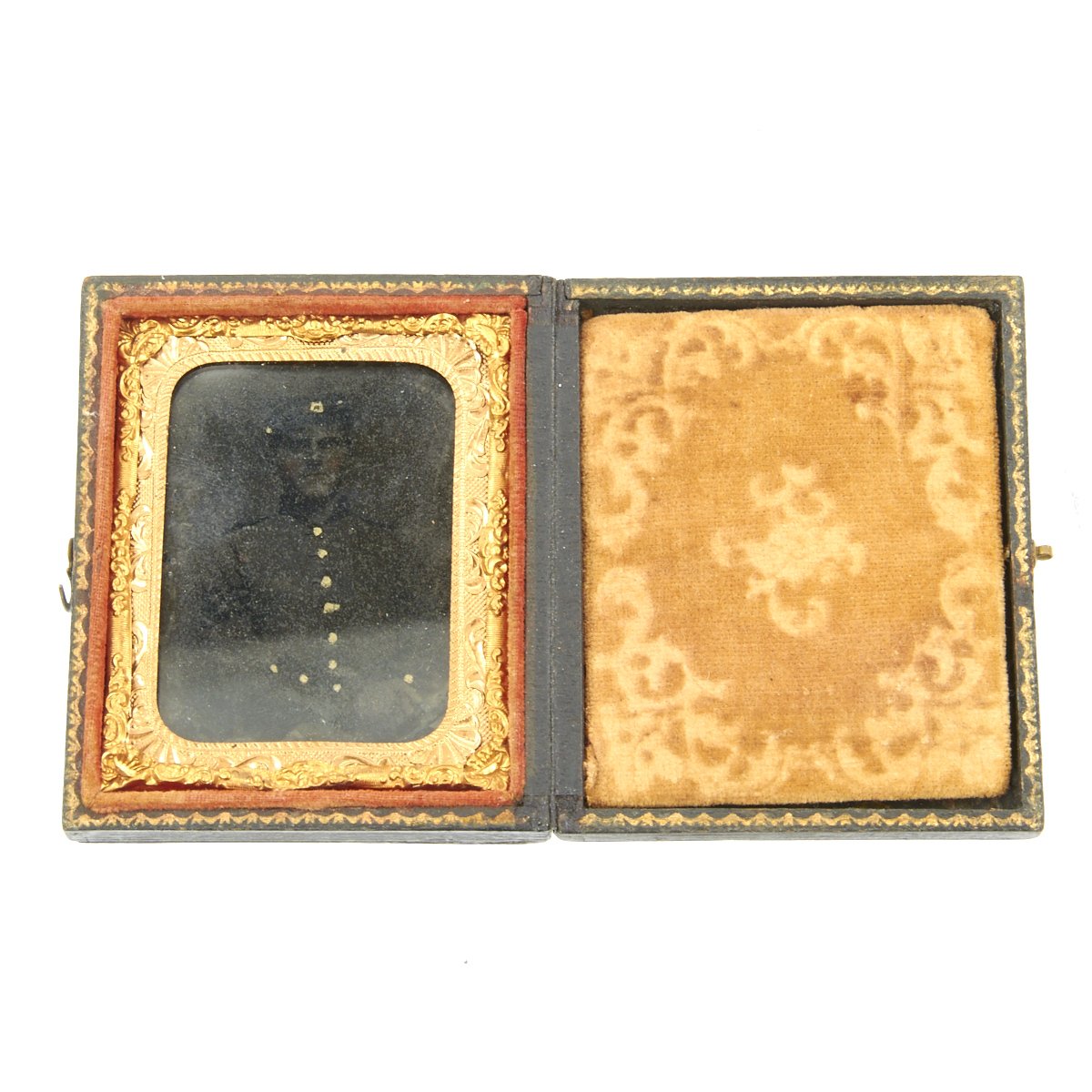 Original Item: Only One Available. Everything about this image, including its presentation, makes it a splendid memento of the Civil War. This Civil War cased "Sixth Plate" (2.75 x 3.25 inch) tin type portrait shows an unidentified solider. He wears a brass button frock coat of Confederate Army issue along with a kepi.