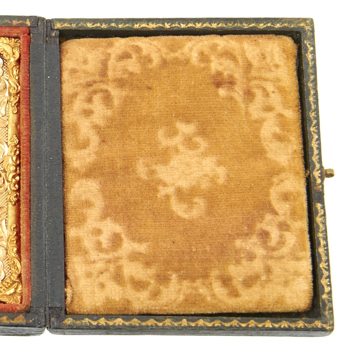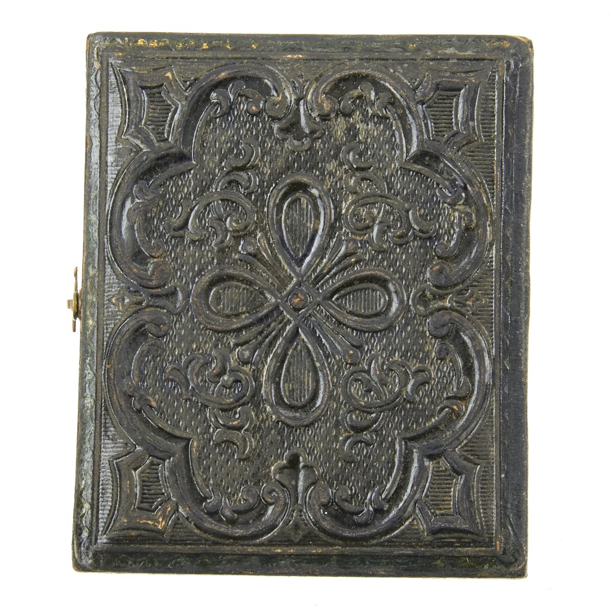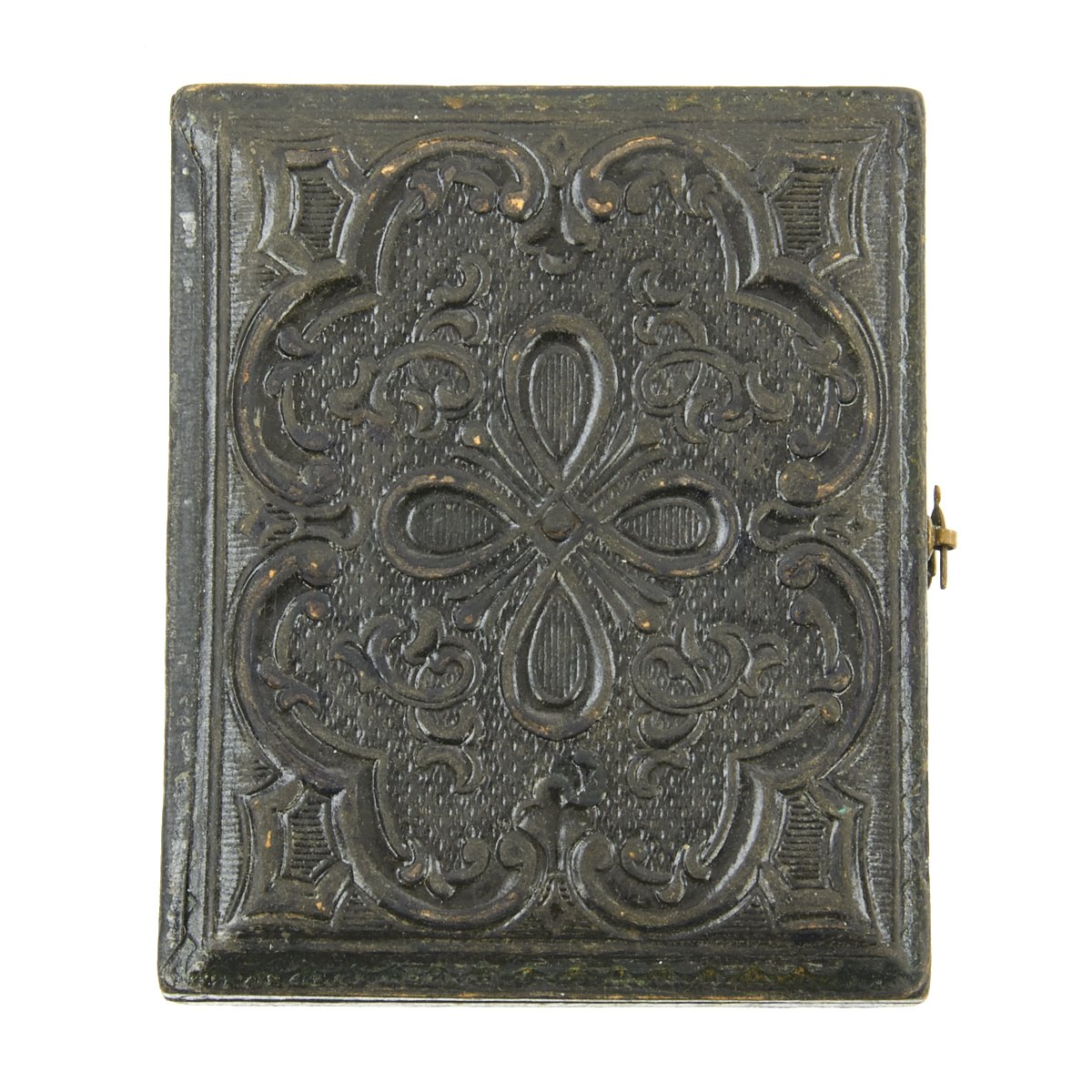 The image is behind glass held in an ornate brass mat loaded with intricate designs edging the tintype. A gutta-percha case molded front and back with decorative designs completes the piece. Interior of the case is lined in velvet type material and the case locks function but the hinge seam has long since separated.