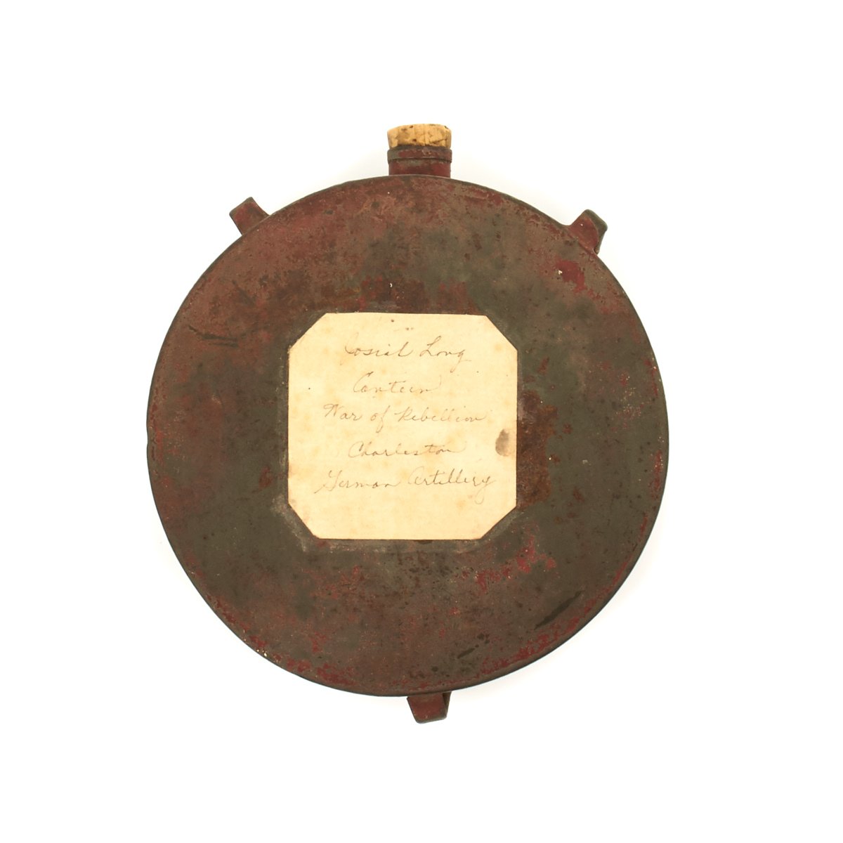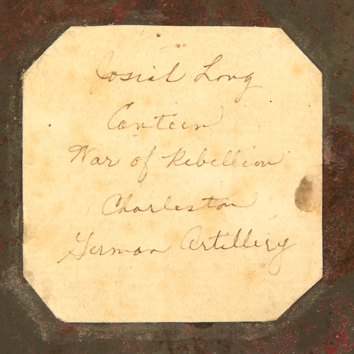 The are a faint set of initials scratched on one side reading J.H.L., which apparently stand for "PRIVATE JOSIAH H. LONG" of the Charleston German Artillery.