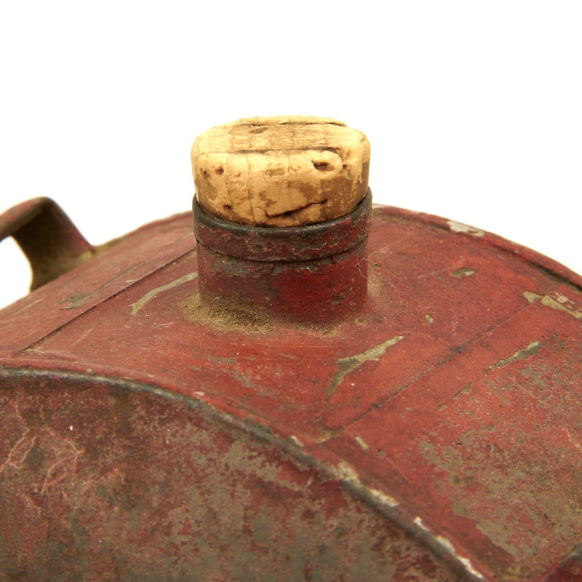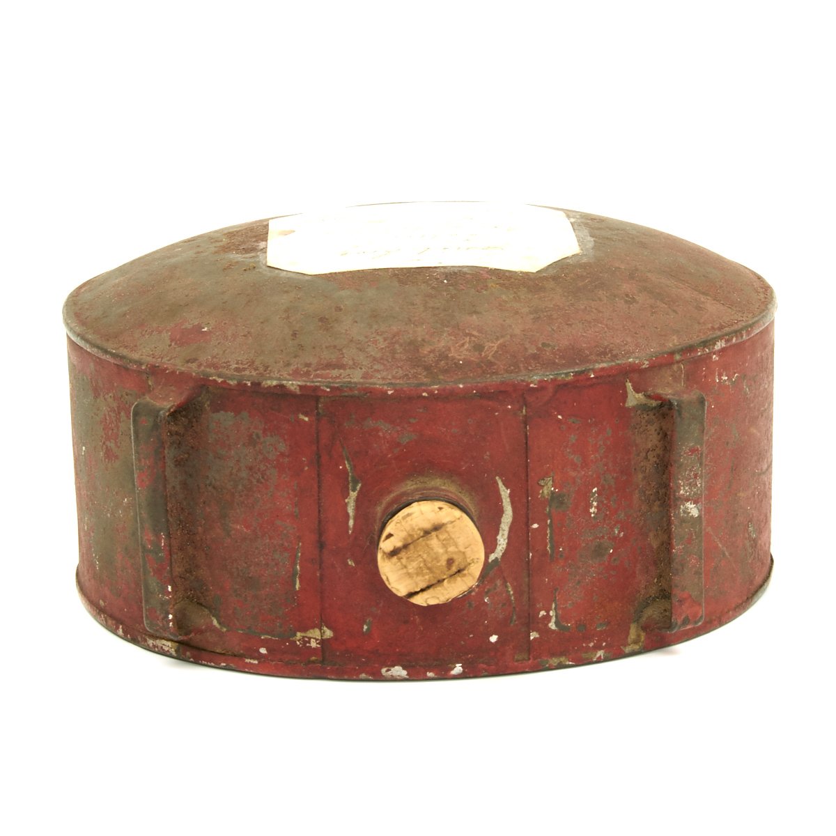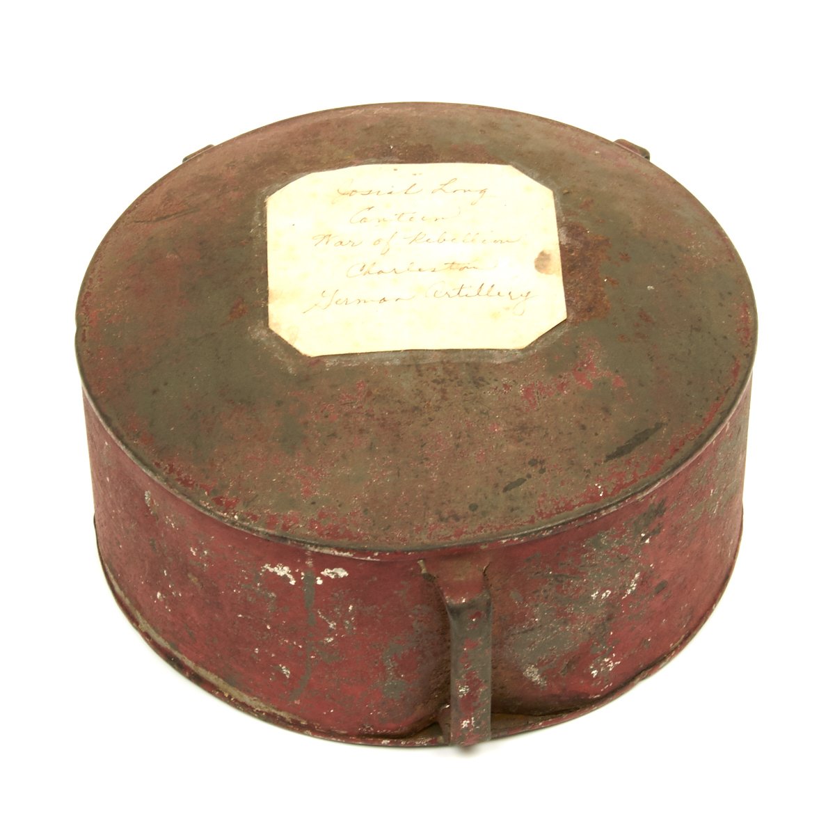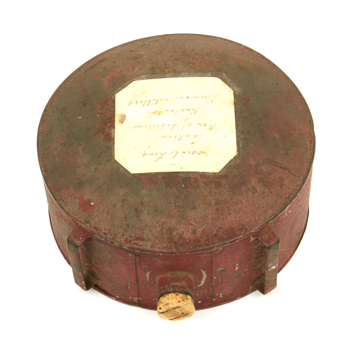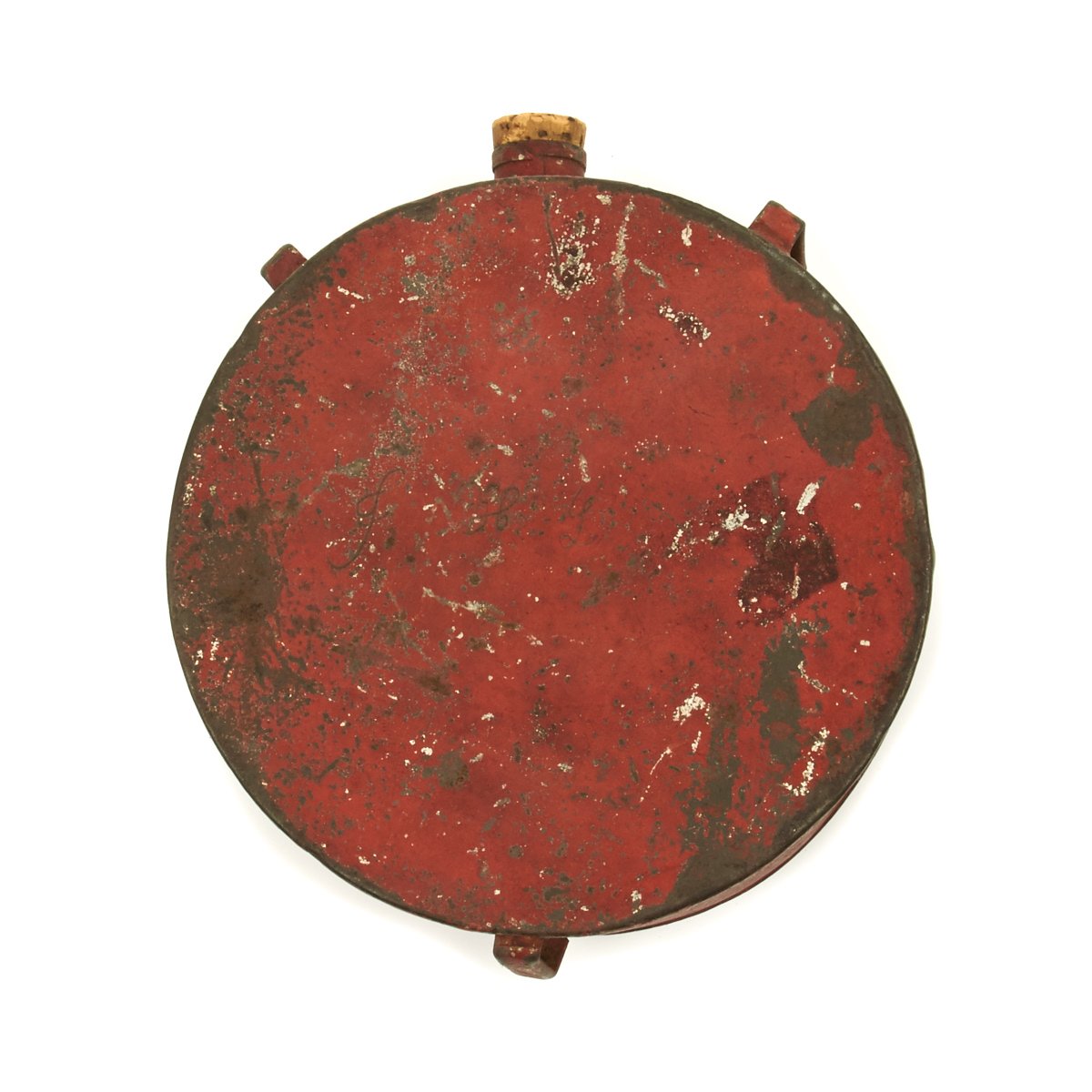 This is a red painted tin "drum" shaped canteen just 5" across. The Canteen comes with a small cork stopper which is most probably a replacement since the 1860s. All three sling loops are still intact, but the sling is sadly missing.