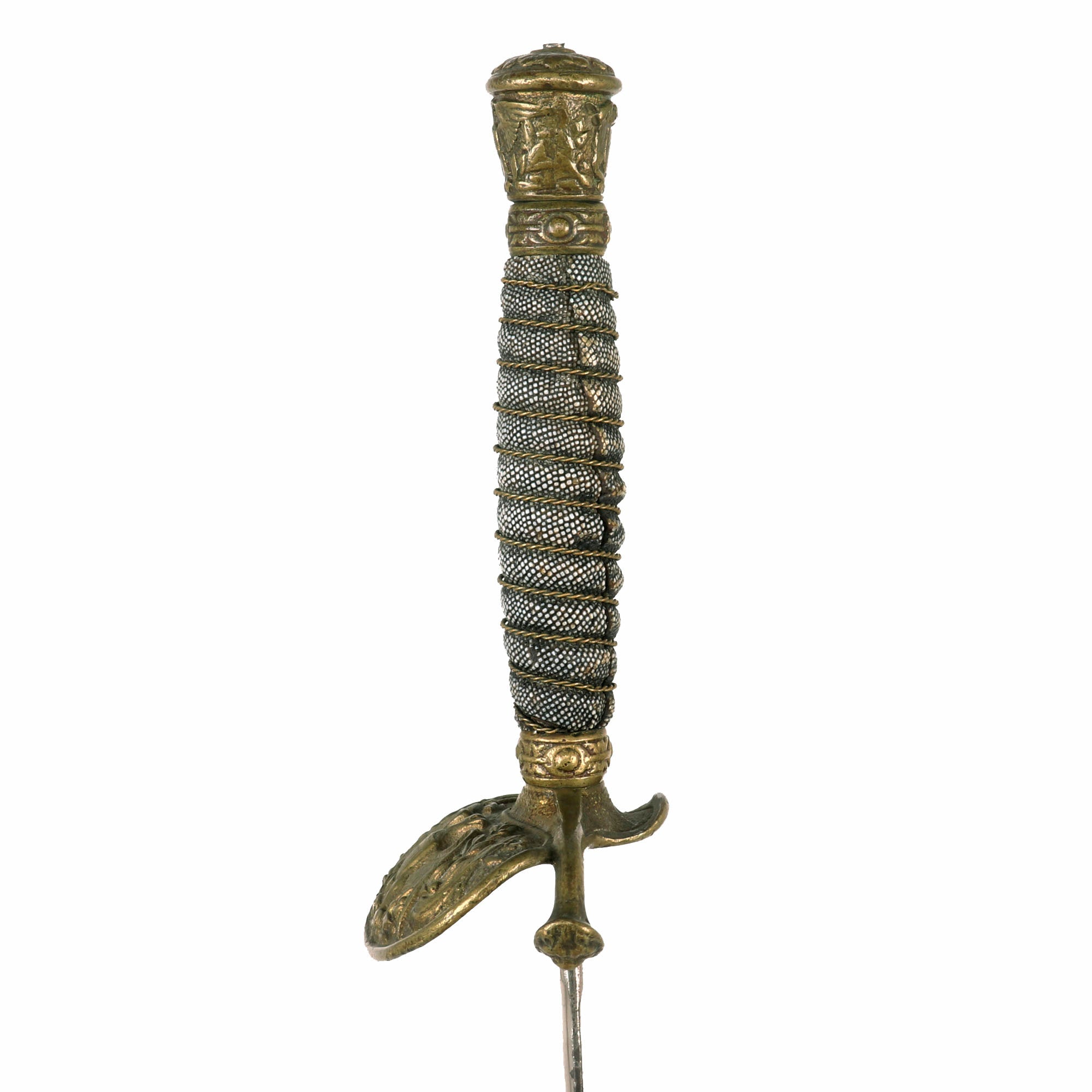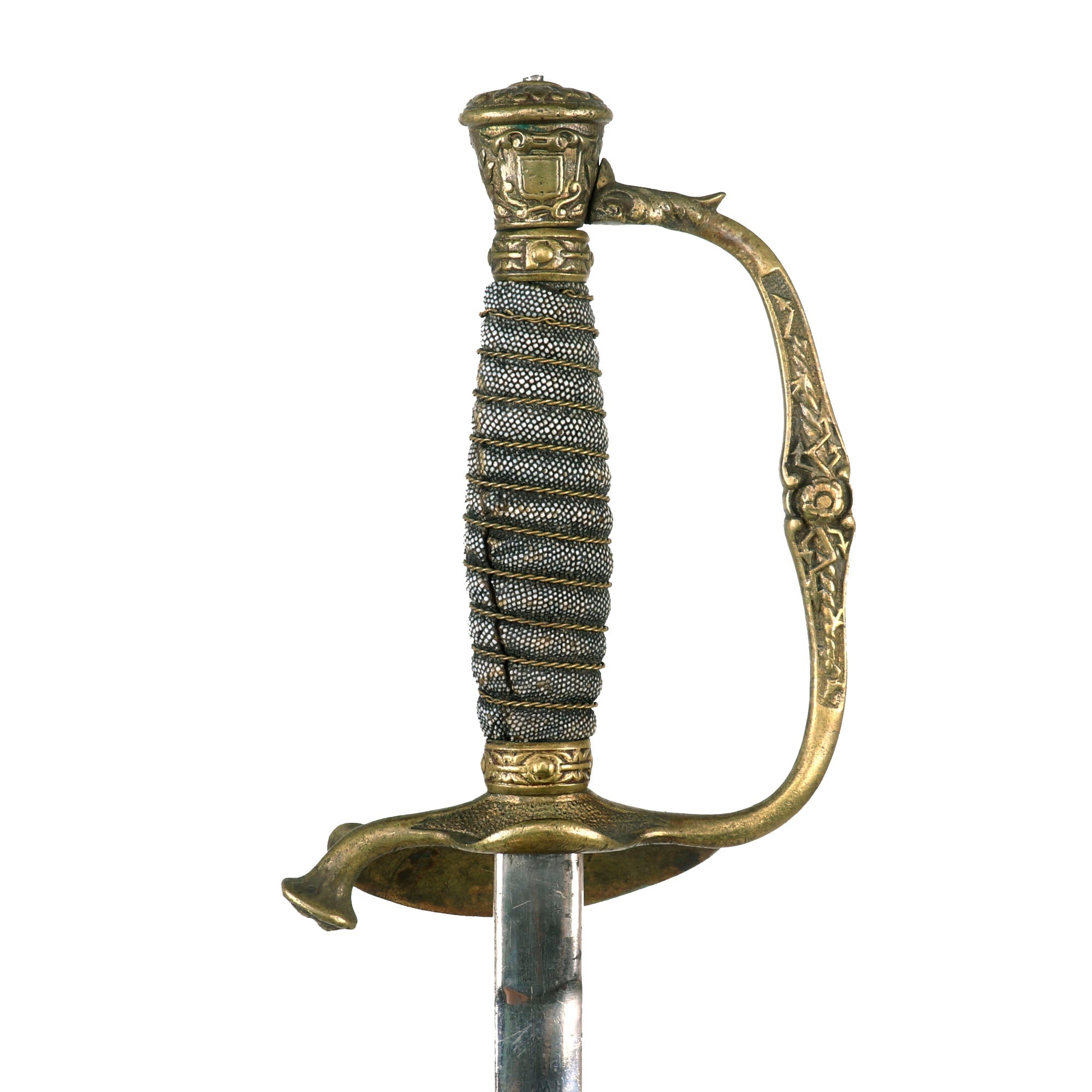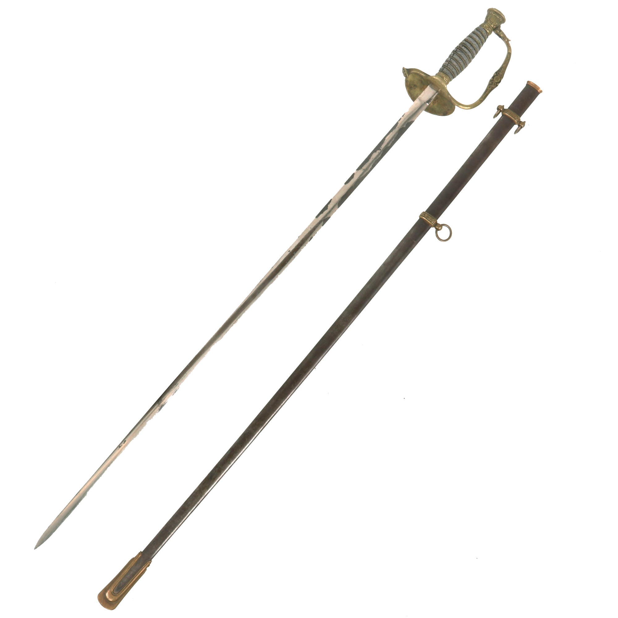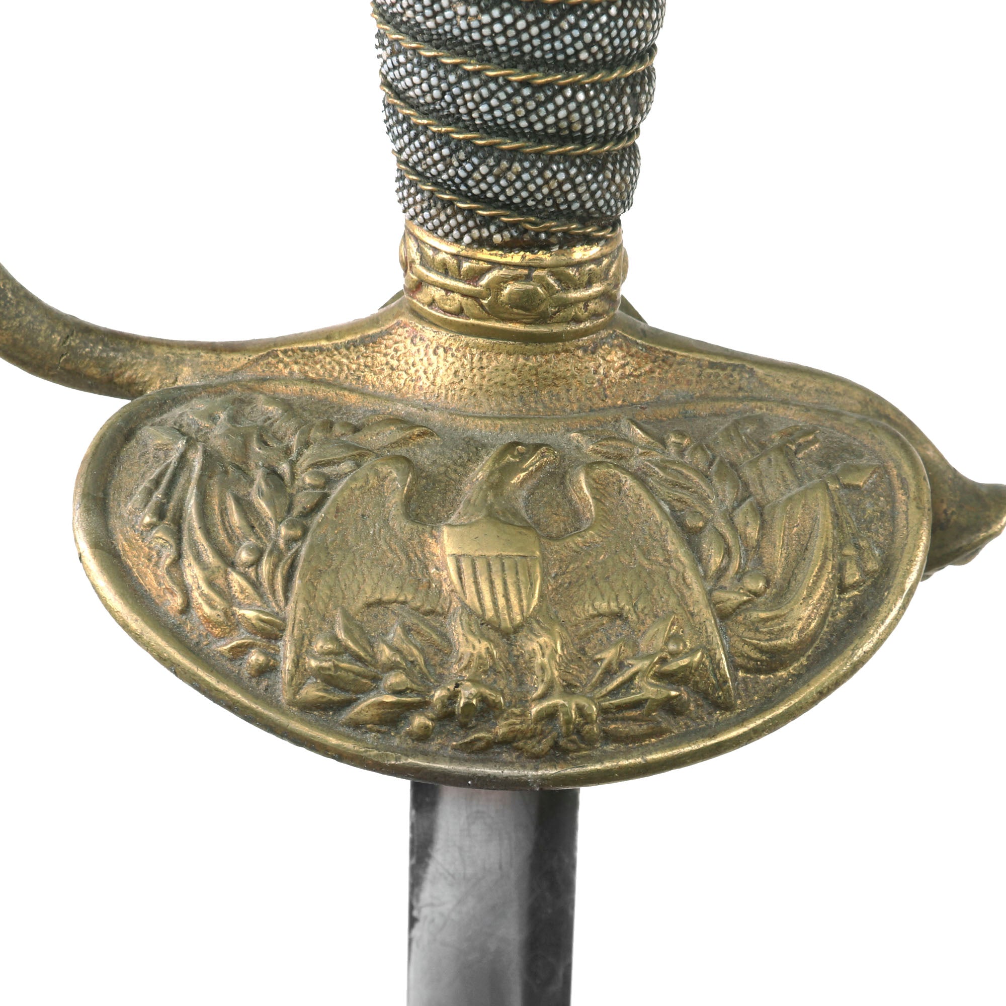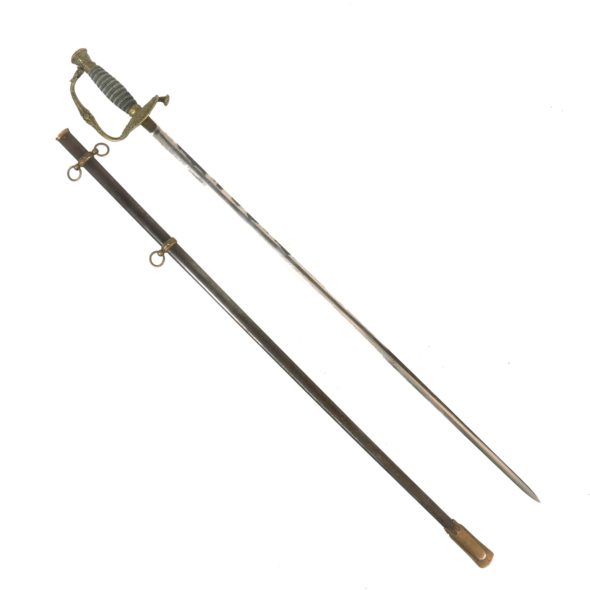 The Sword hilt and handle is brass, with the sharkskin handle having a separate brass wire wrap to mimic the wire used on the leather handled versions. Steel scabbard has a pleasing, dark gray/brown patina and is adorned with two brass mounts and a brass drag; the brass throat is still present. Both mounts exhibit a floral display. The top mount sports two rings while the lower mount has only one. The brass drag features a star on one side and crossed flags on the other. Both sword mounts and the drag are tight. Much of the plating is still present on the scabbard and there are no significant dents or damage present that we can see.