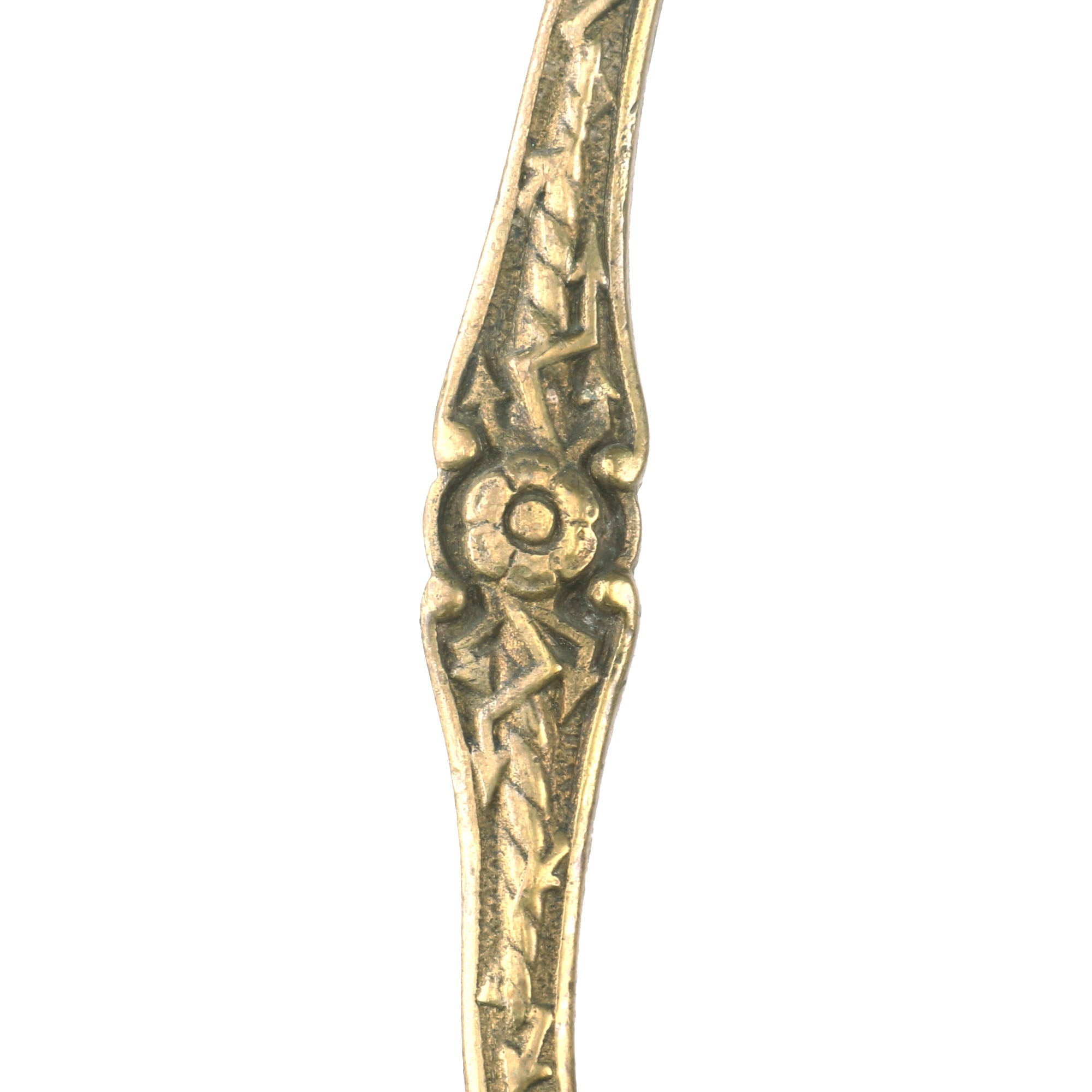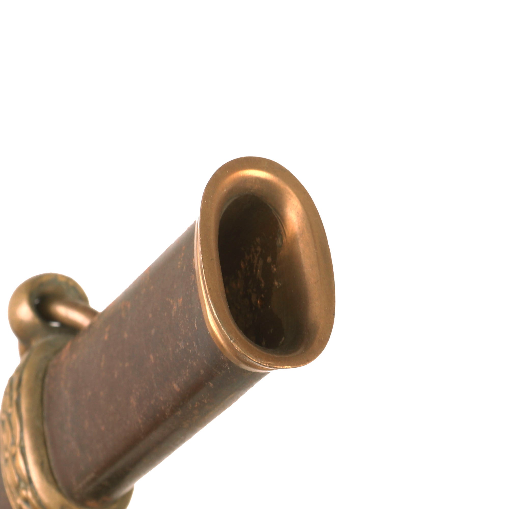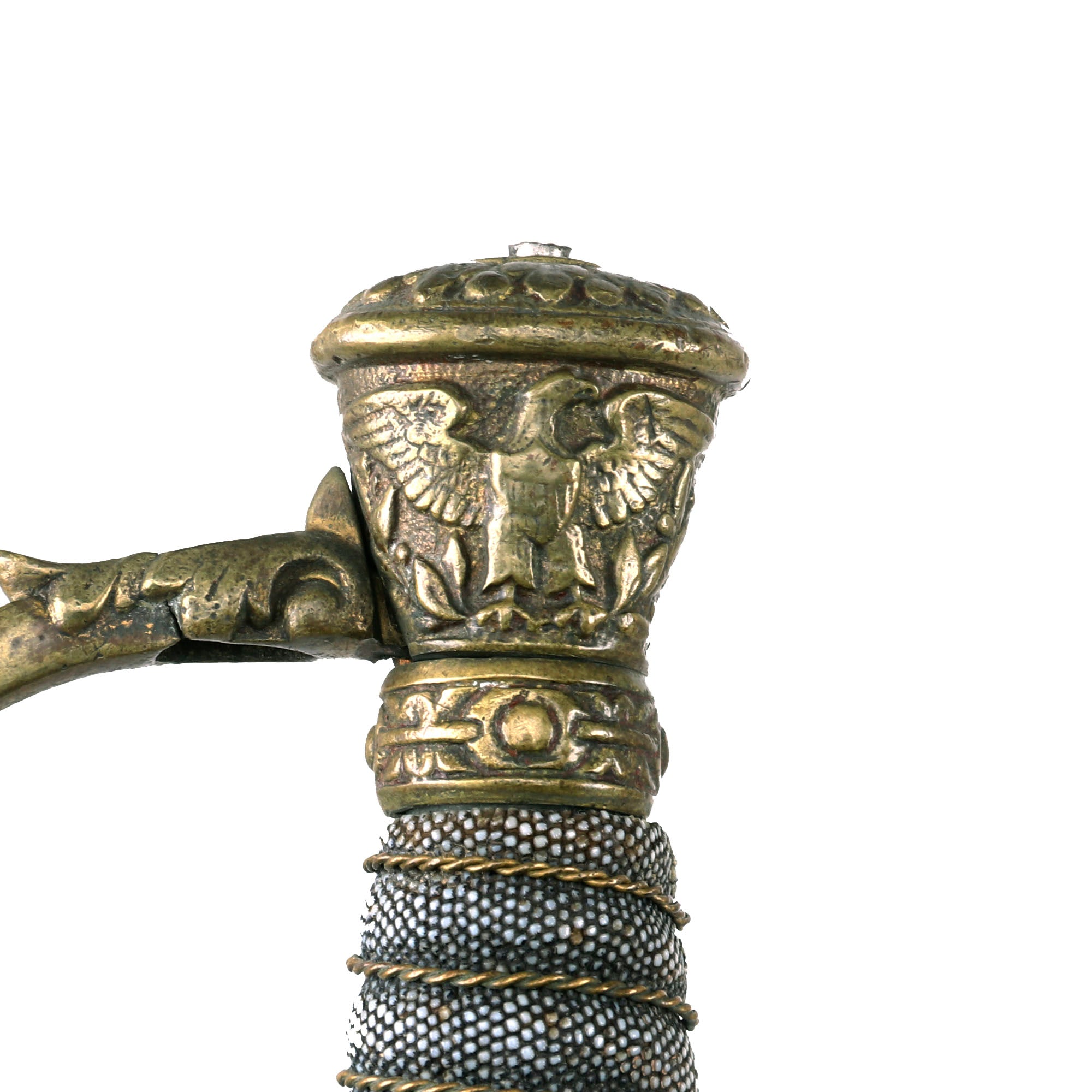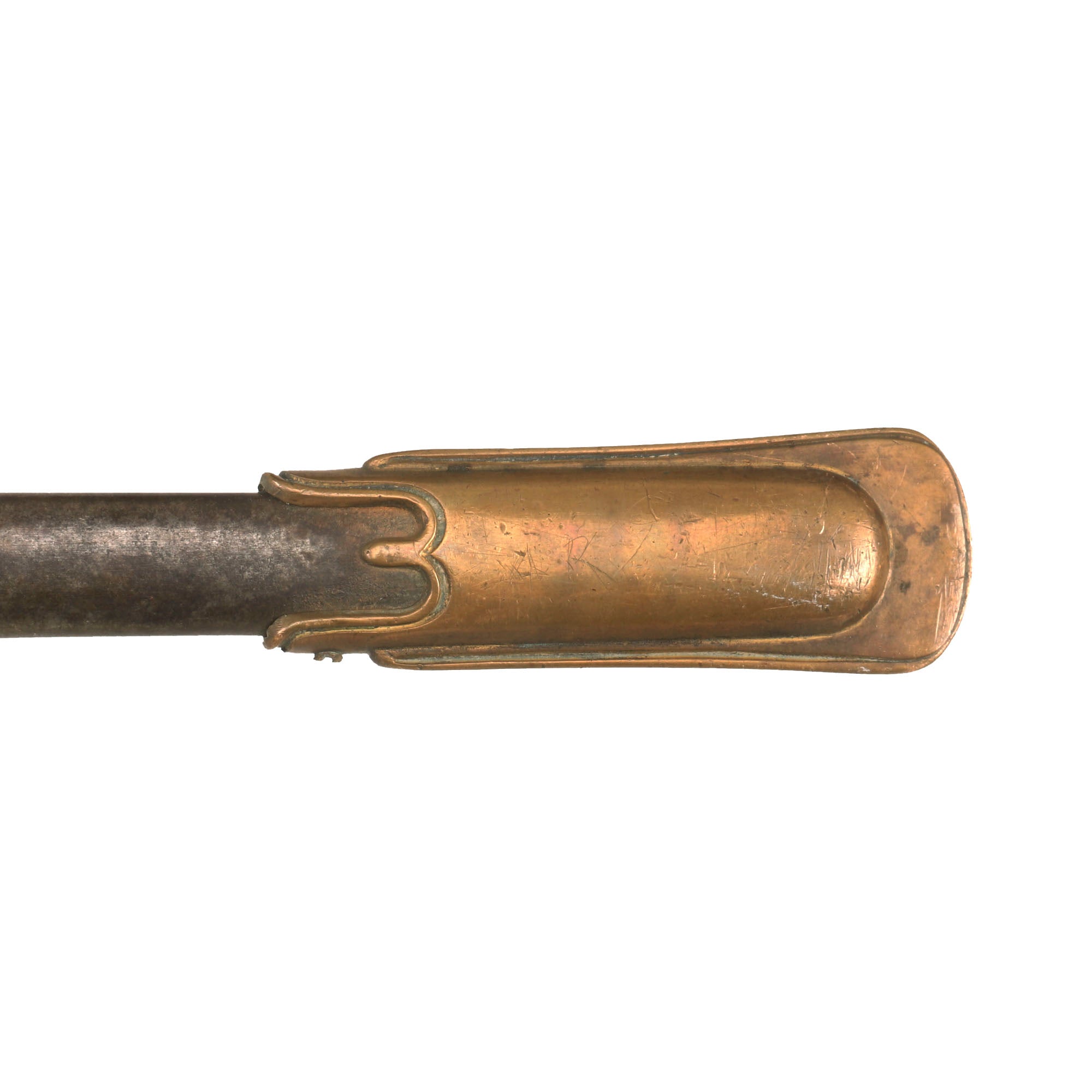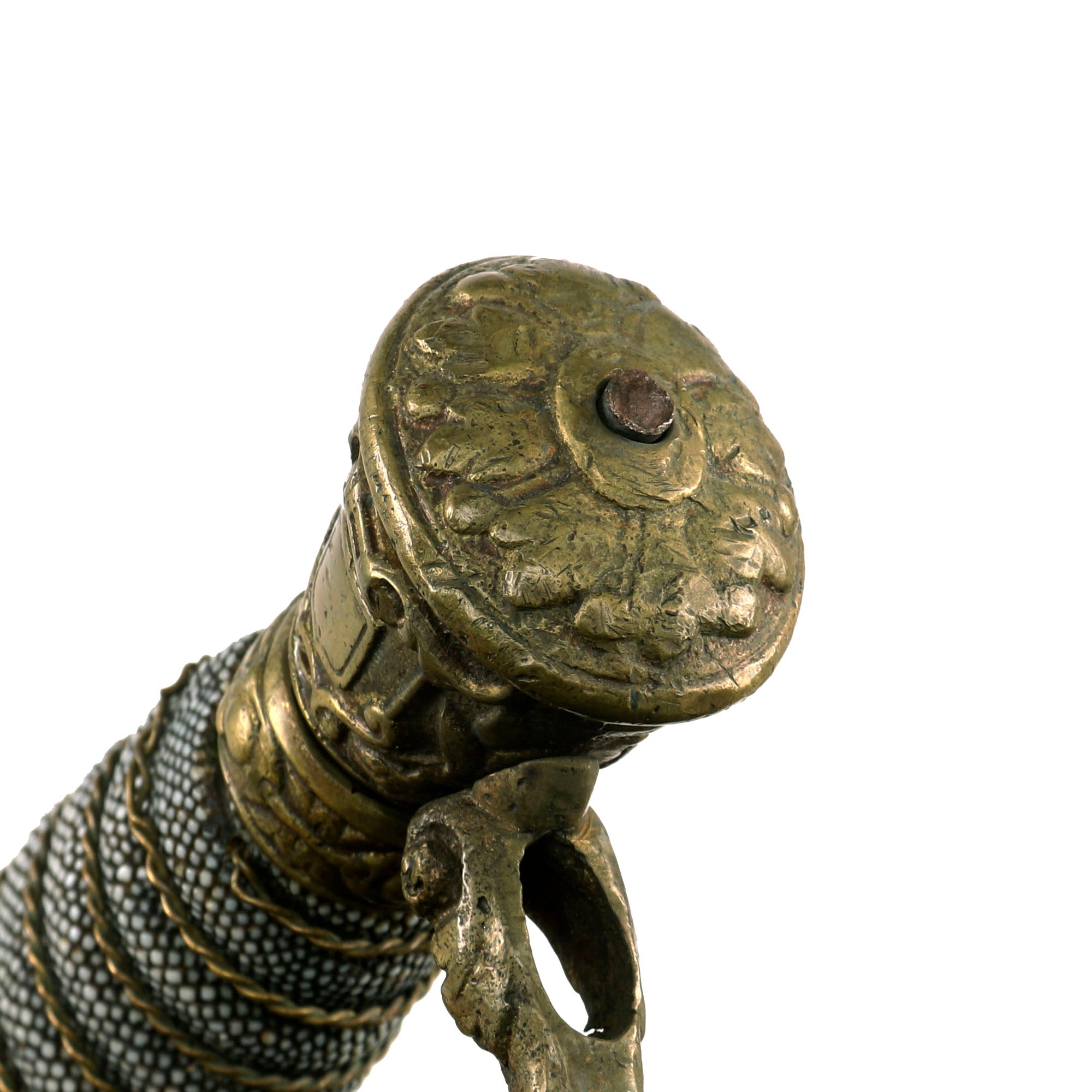 The Sword hilt and handle is brass, with the sharkskin handle having a separate brass wire wrap to mimic the wire used on the leather handled versions. Steel scabbard has a pleasing, dark gray/brown patina and is adorned with two brass mounts and a brass drag; the brass throat is still present. Both mounts exhibit a floral display. The top mount sports two rings while the lower mount has only one. The brass drag features a star on one side and crossed flags on the other. Both sword mounts and the drag are tight. Much of the plating is still present on the scabbard and there are no significant dents or damage present that we can see.