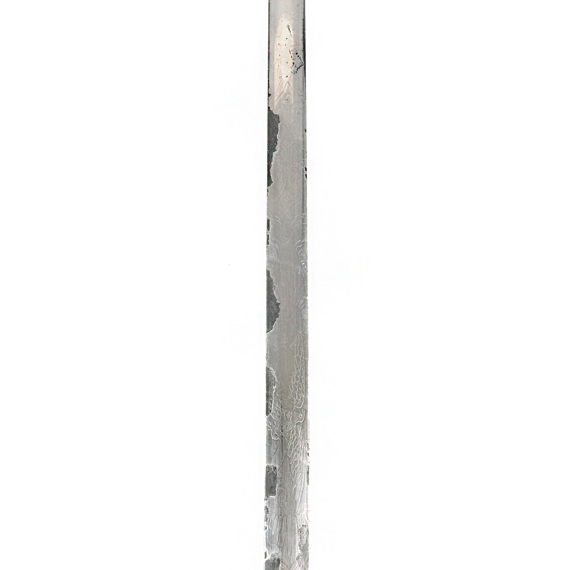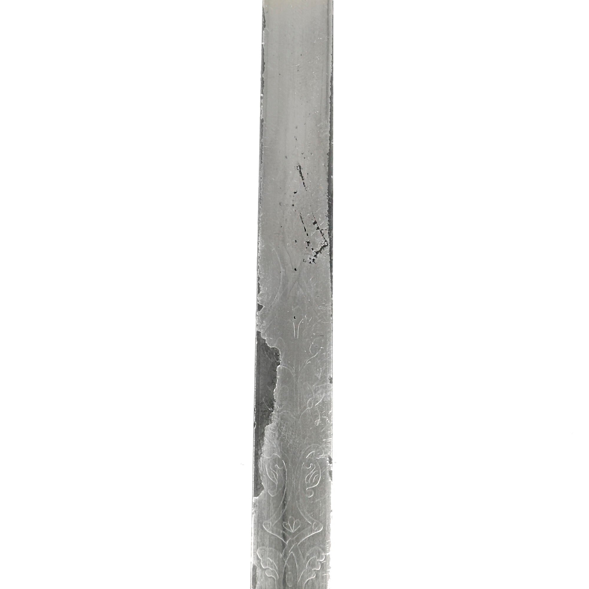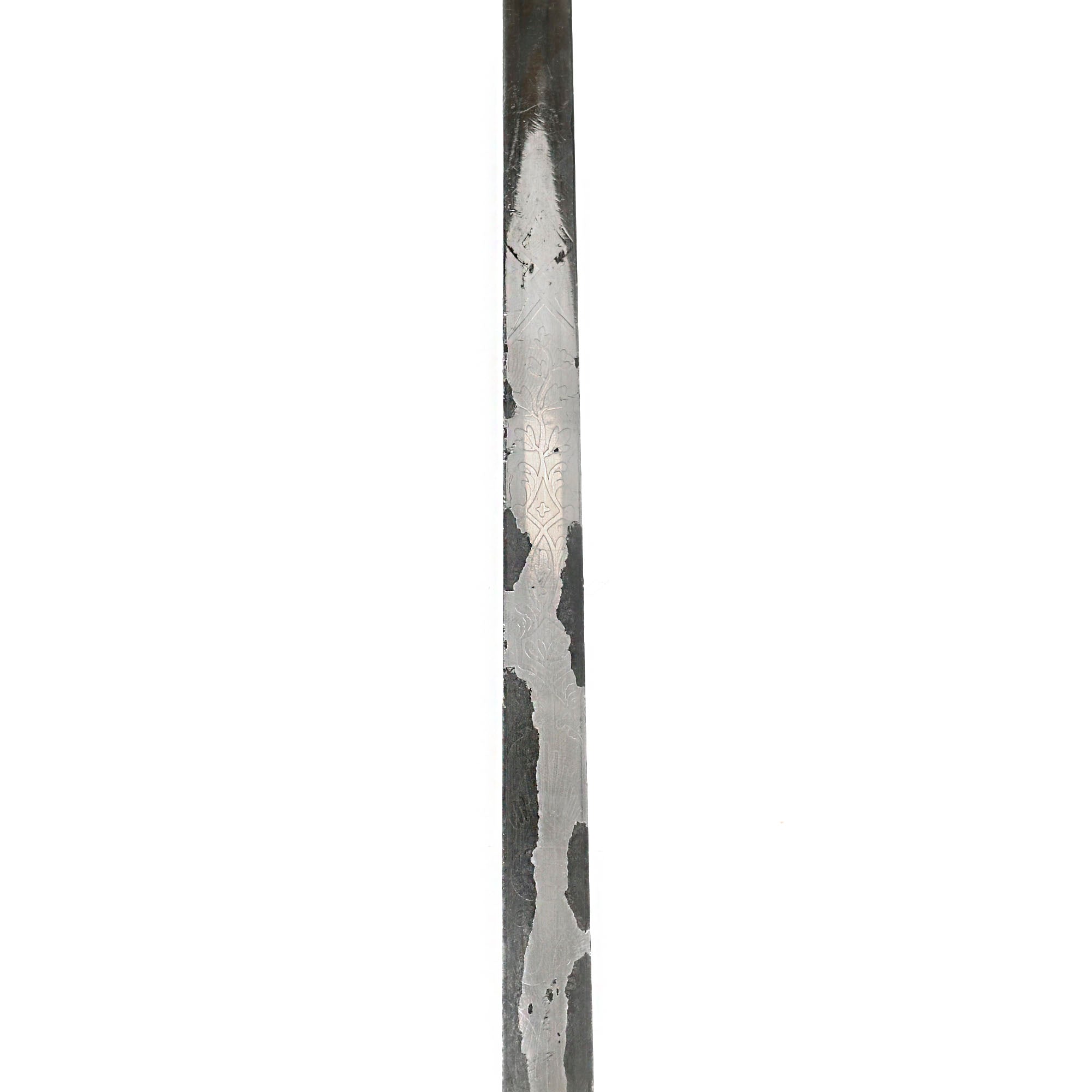This M1860 sword is an edged weapon that was designed mostly for ceremonial use. The straight, double-edged steel blade measures 30” long and features a diamond-shaped cross section. The blade is nickel-plated which appears to have been done later, as it heavily distorts the etching which depicts an eagle and military panoply of arms. A good chunk of the nickel-plating is chipped and coming off. On the ricasso it’s marked: