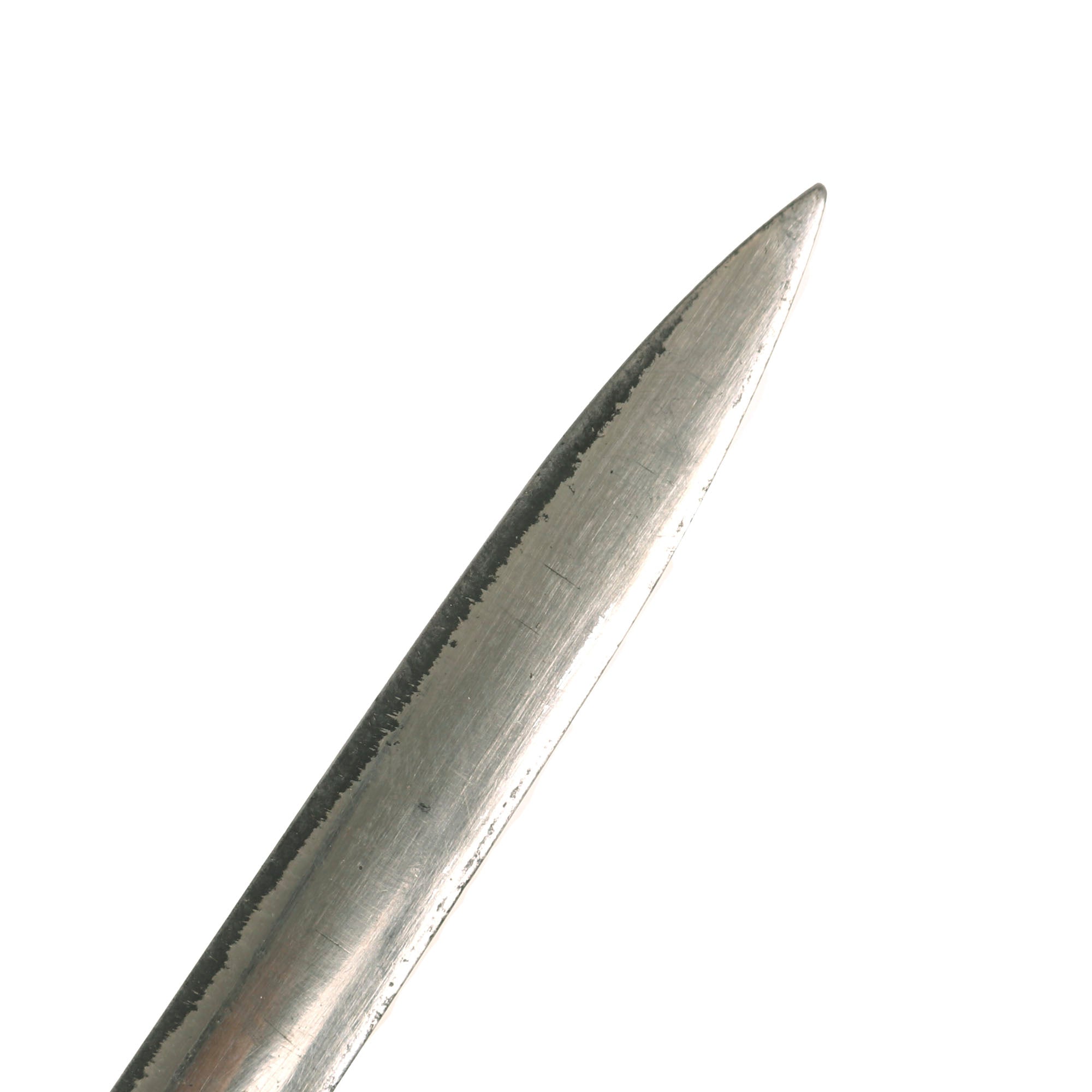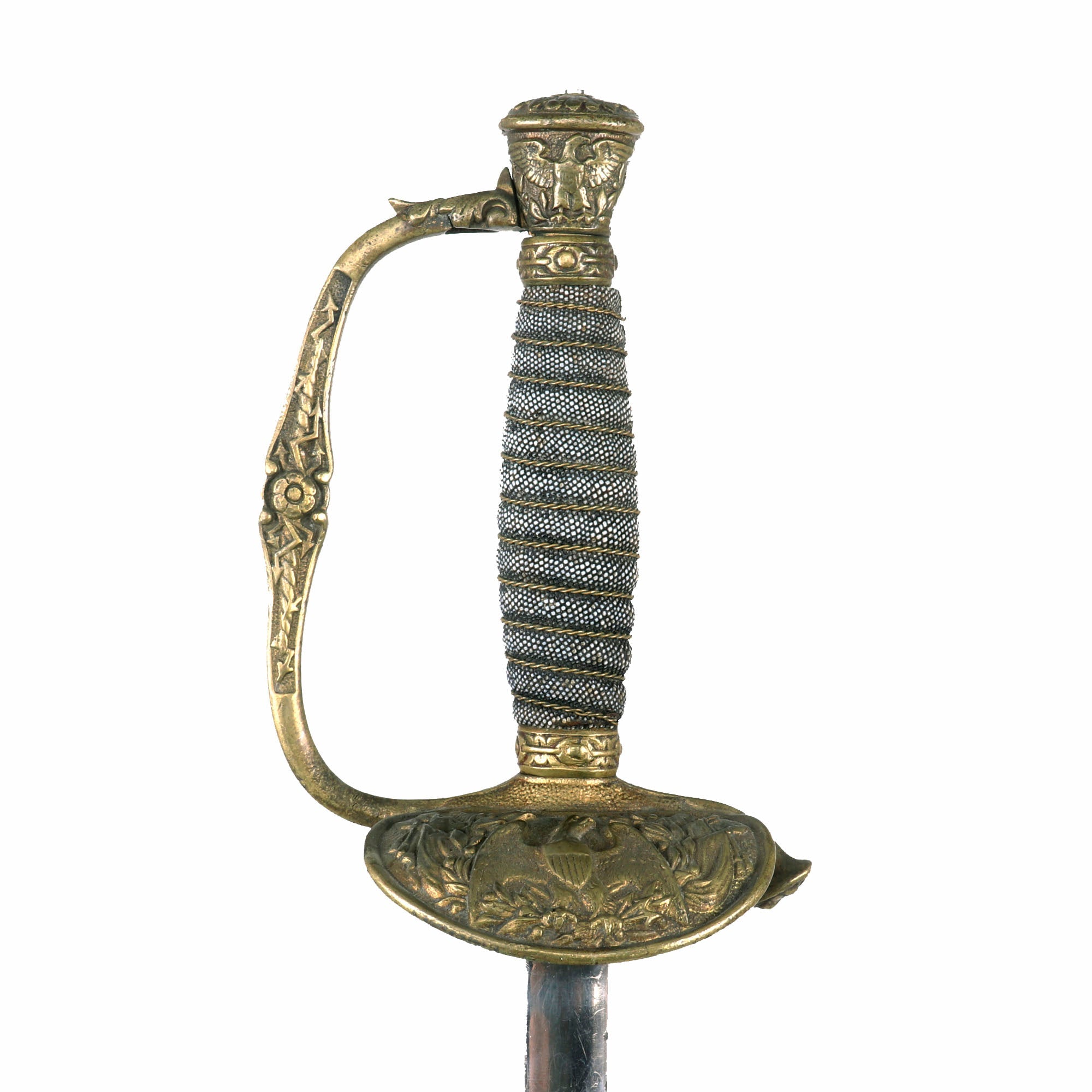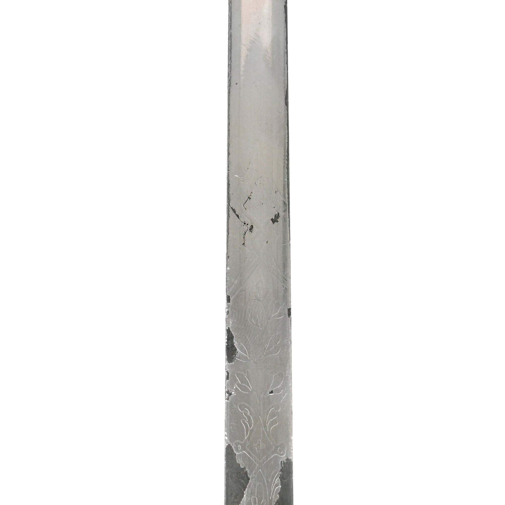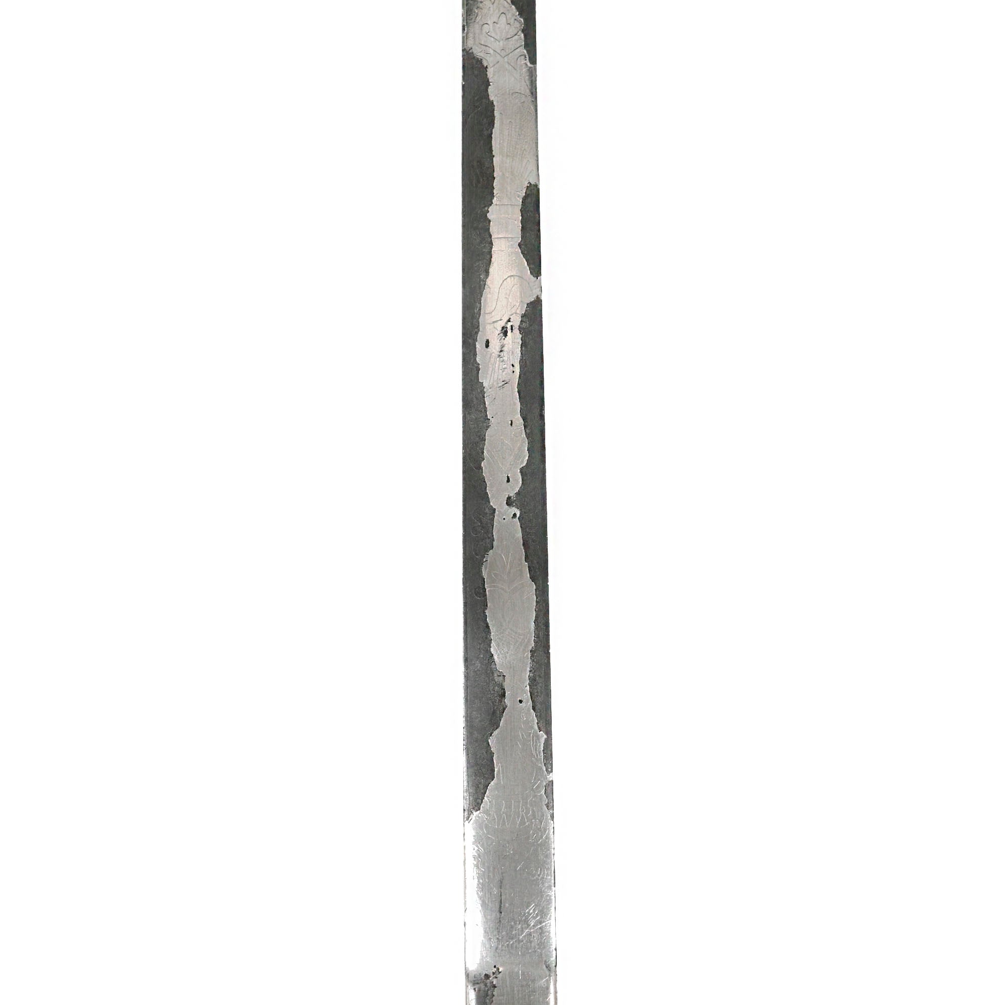 This M1860 sword is an edged weapon that was designed mostly for ceremonial use. The straight, double-edged steel blade measures 30” long and features a diamond-shaped cross section. The blade is nickel-plated which appears to have been done later, as it heavily distorts the etching which depicts an eagle and military panoply of arms. A good chunk of the nickel-plating is chipped and coming off. On the ricasso it’s marked: