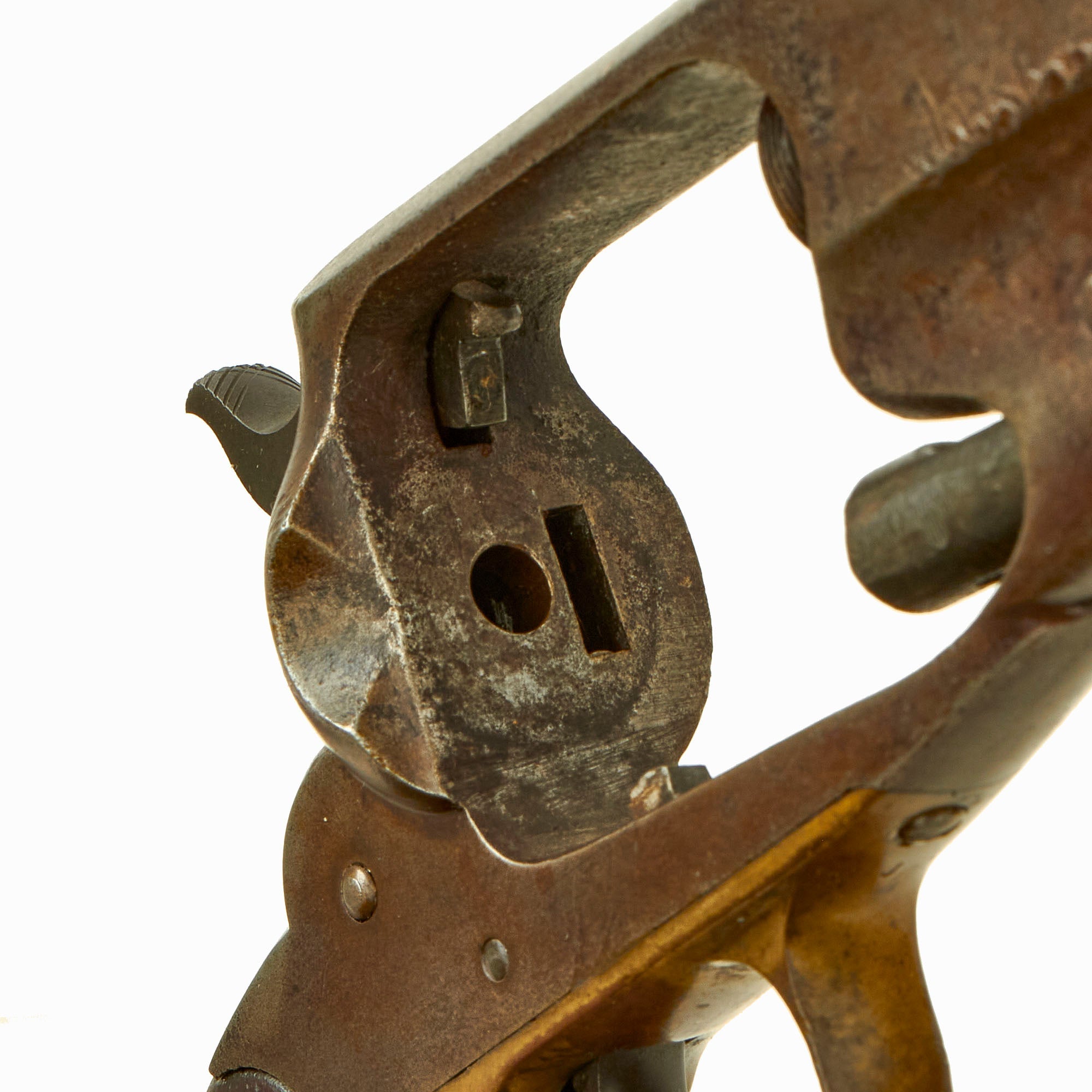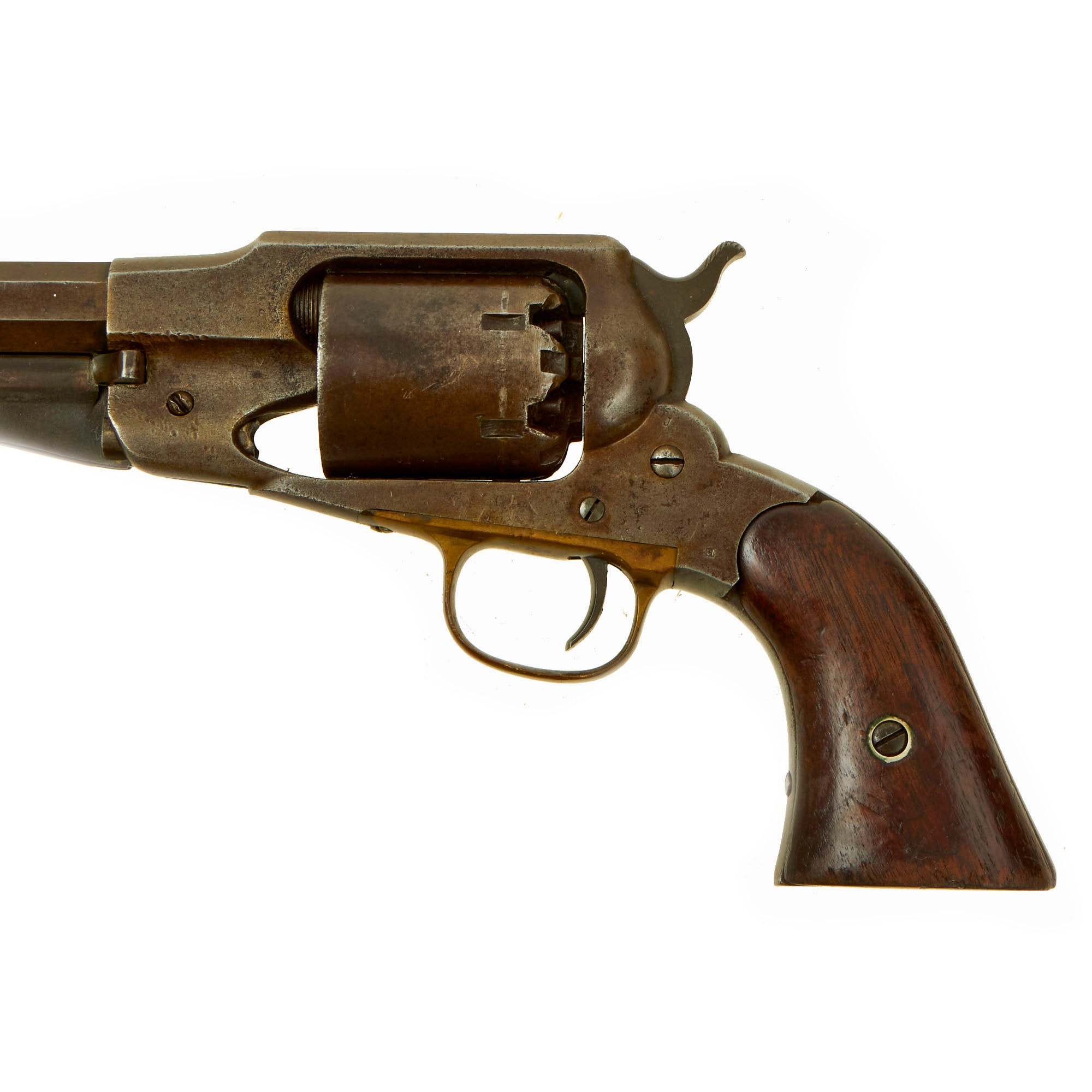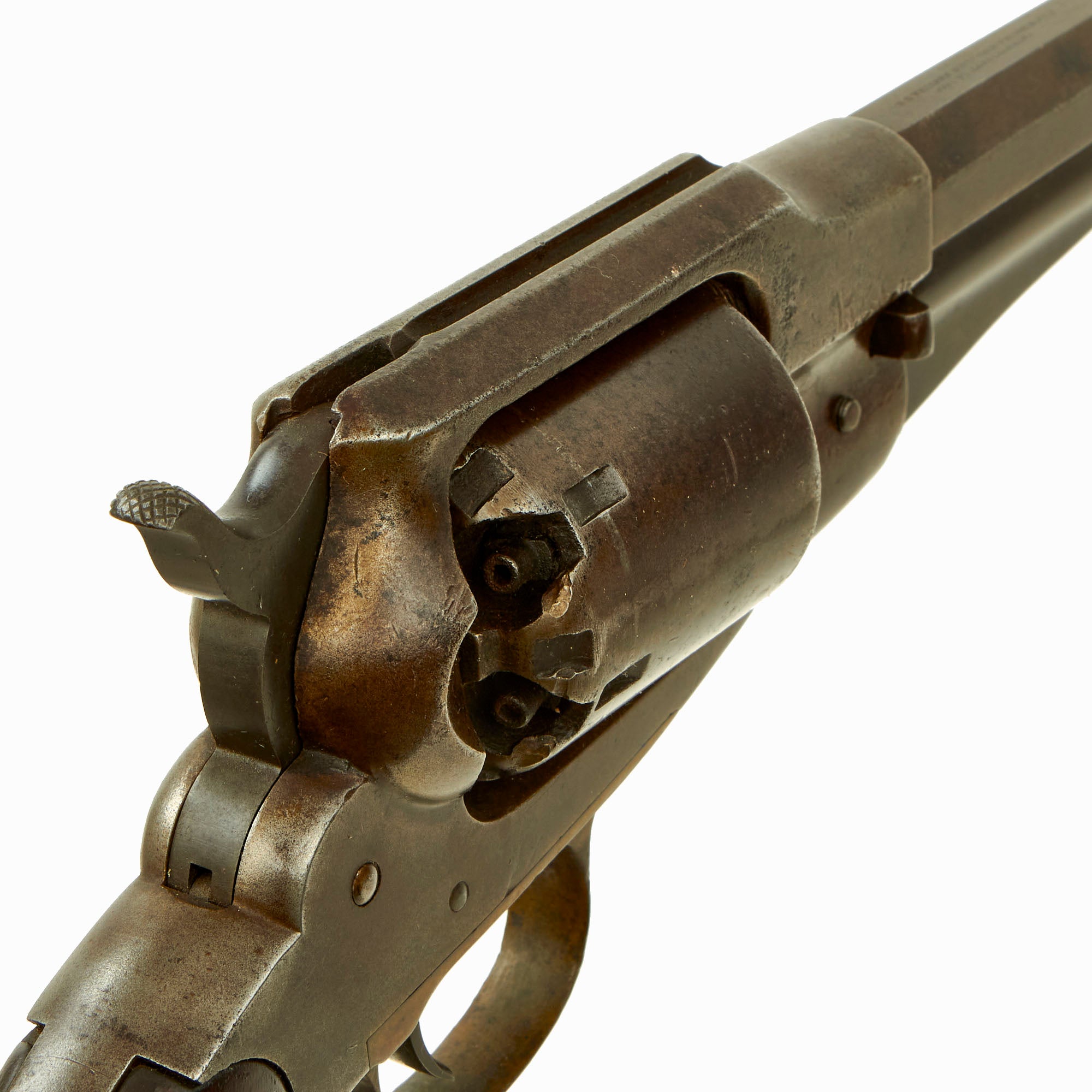 The original front sight is still intact, not replaced as many were, and the bore is in really fantastic excellent condition, showing a bright finish overall with clear lands and grooves. Original machining marks can still be seen, and there is just a tad of wear preventing this bore from being 'MINT'. Bores this good on a "New Model" Remington are exceedingly are rare, considering this is a black powder percussion revolver. It must have been cleaned properly and promptly after the last time it was used.