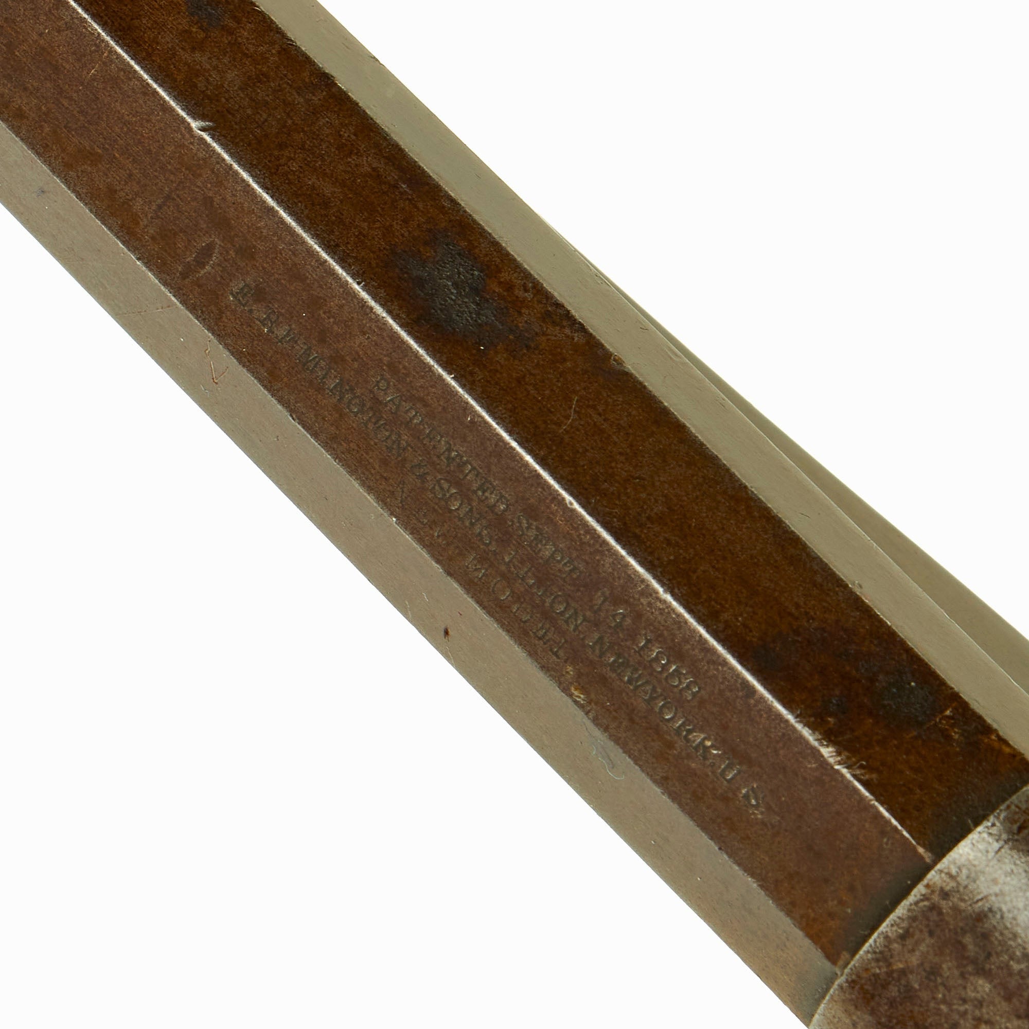 Like all New Models, it is a .44 caliber percussion, 6 shot single action revolver, with an 8-inch octagon barrel. These were often called the Model 1858 due to the patent dates, but production of this revision started in 1863, and the "New Model Army" is the correct designation from Remington. The top of the octagonal barrel still shows the original markings clearly: