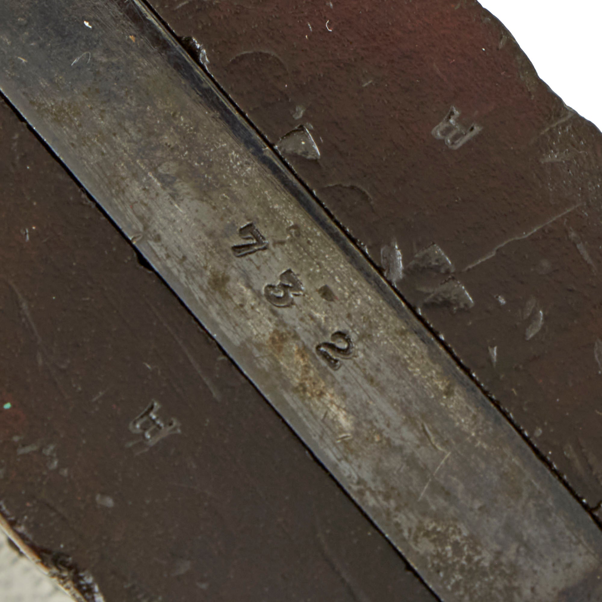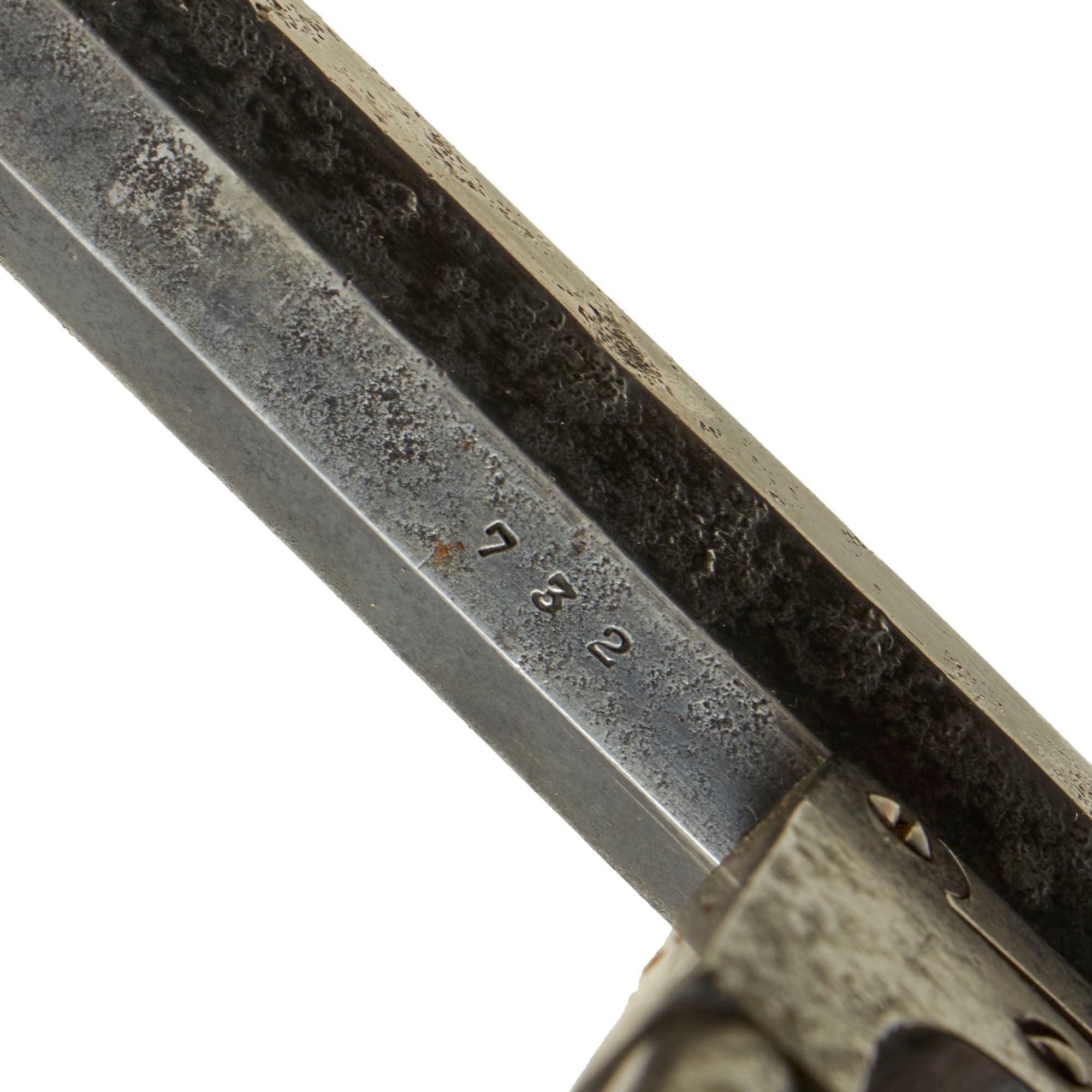 All parts of the revolver bear matching serial 732, including the left frame, bottom grip frame, barrel, cylinder, loading rammer, and even the insides of both grip scales. The left grip scale even still still has a crisp "boxed" script RPB cartouche of inspector Captain R. P. Barry, who inspected Remington, Starr, and Rogers & Spencer Revolvers from 1860 to 1865.