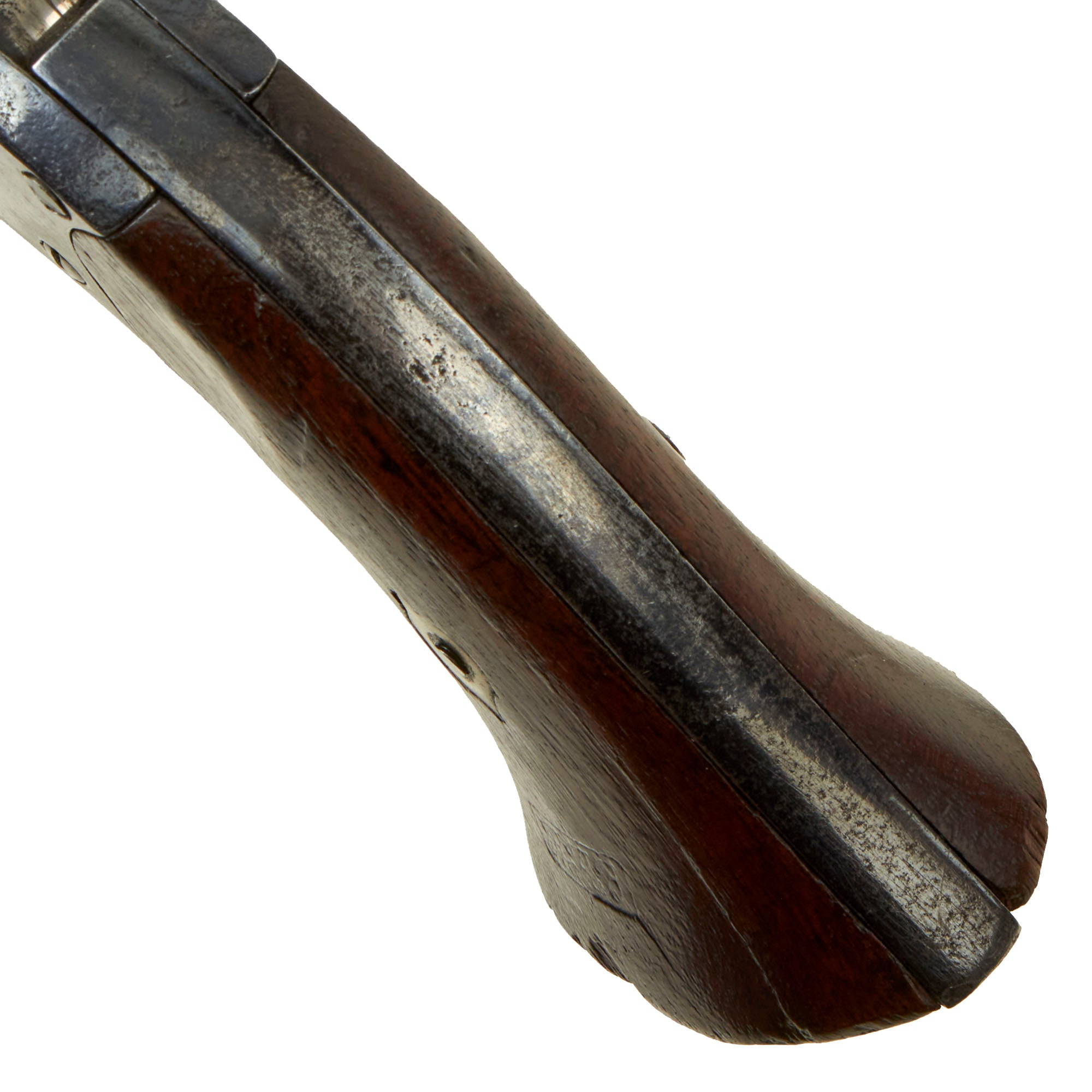 The pistol is complete, and the action is REALLY crisp and solid. It indexes correctly, the cylinder lockup is near perfect, and there is just a bit of wobble when fully cocked. We did not notice any of the usual finnicky behavior that we often see on Civil war Percussion revolvers. It can be taken down to components using the arbor pin lock, though it may need to be removed for the arbor pin to pull out. The bore is in very good condition, showing a mostly bright finish with crisp lands and grooves. There is only some scattered oxidation present, with no major wear or signs of past removed fouling.