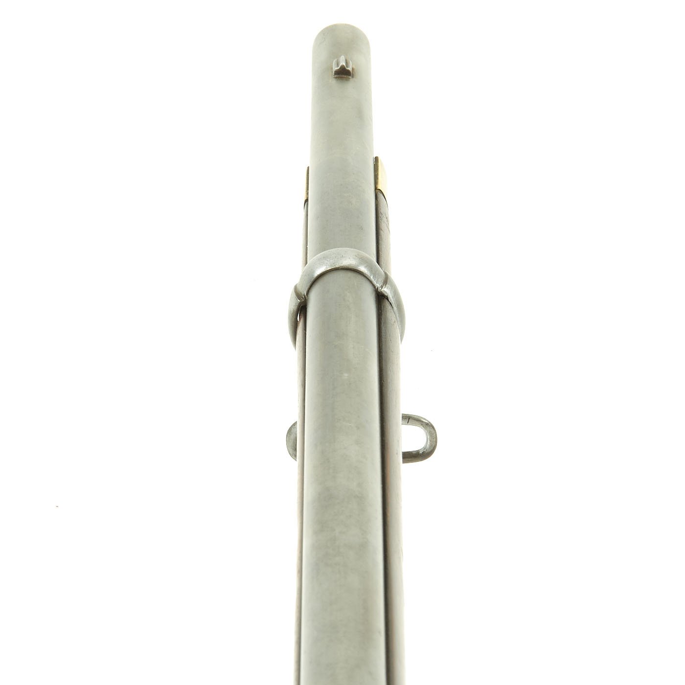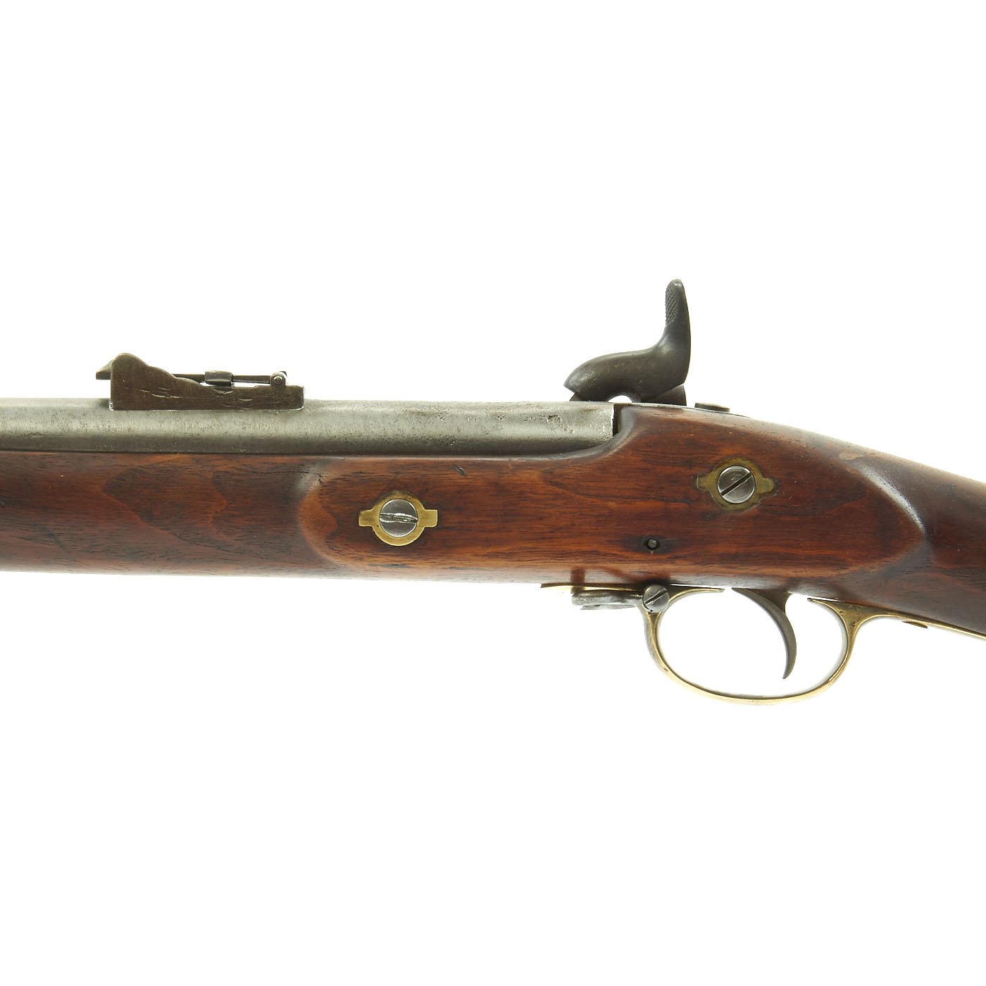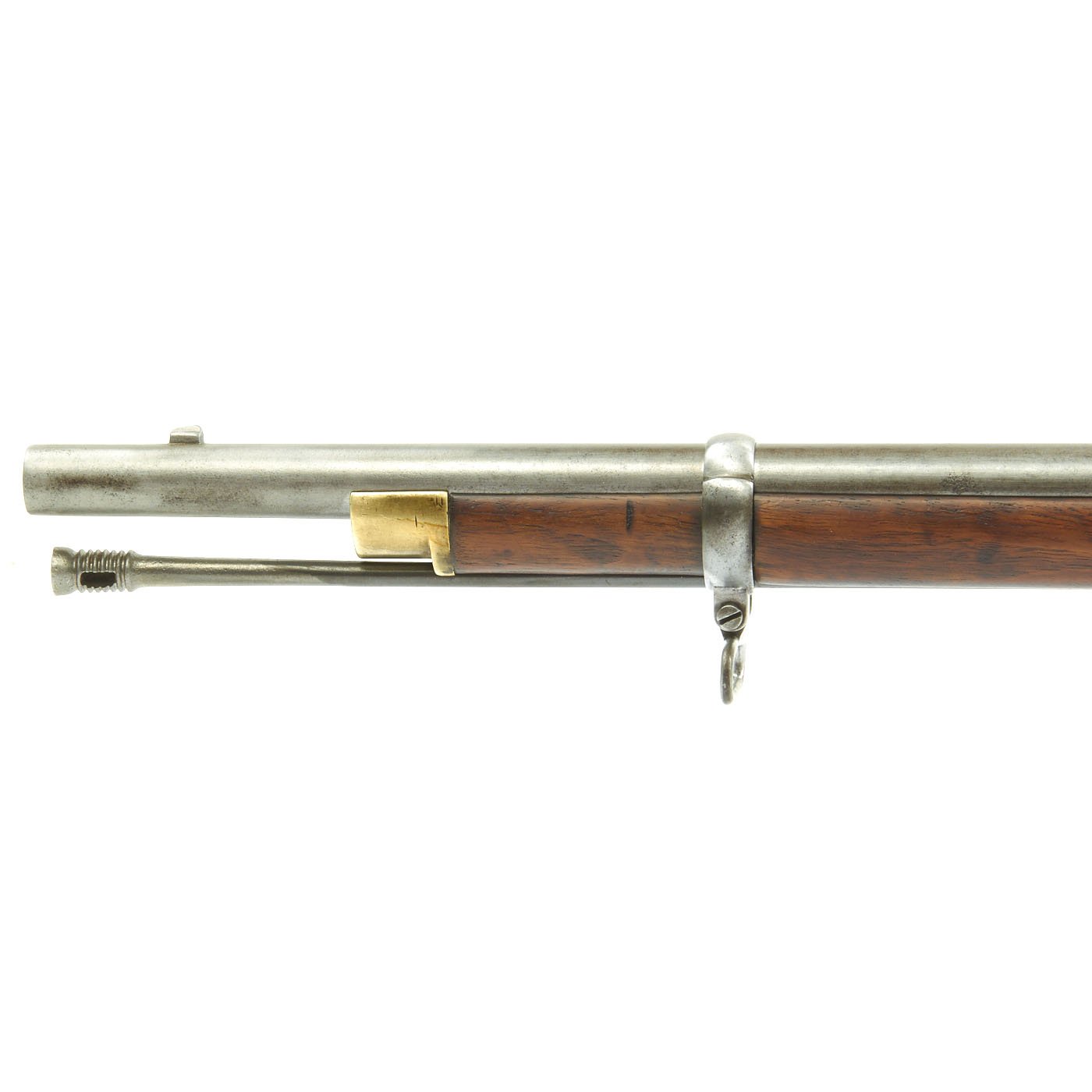 The wood is complete showing only a couple of age cracks, and has been fully restored and has a lovely color. The metalwork showing old light rust pitting overall. The sight slider is intact, as is the front sight, and the rifle still has both sling swivels and the original cleaning / ramrod. The bore is quite dark, showing little evidence of rifling, and a lot of fouling and corrosion. Lock holds correctly at half cock, firing at full cock, though the spring is a bit weak.