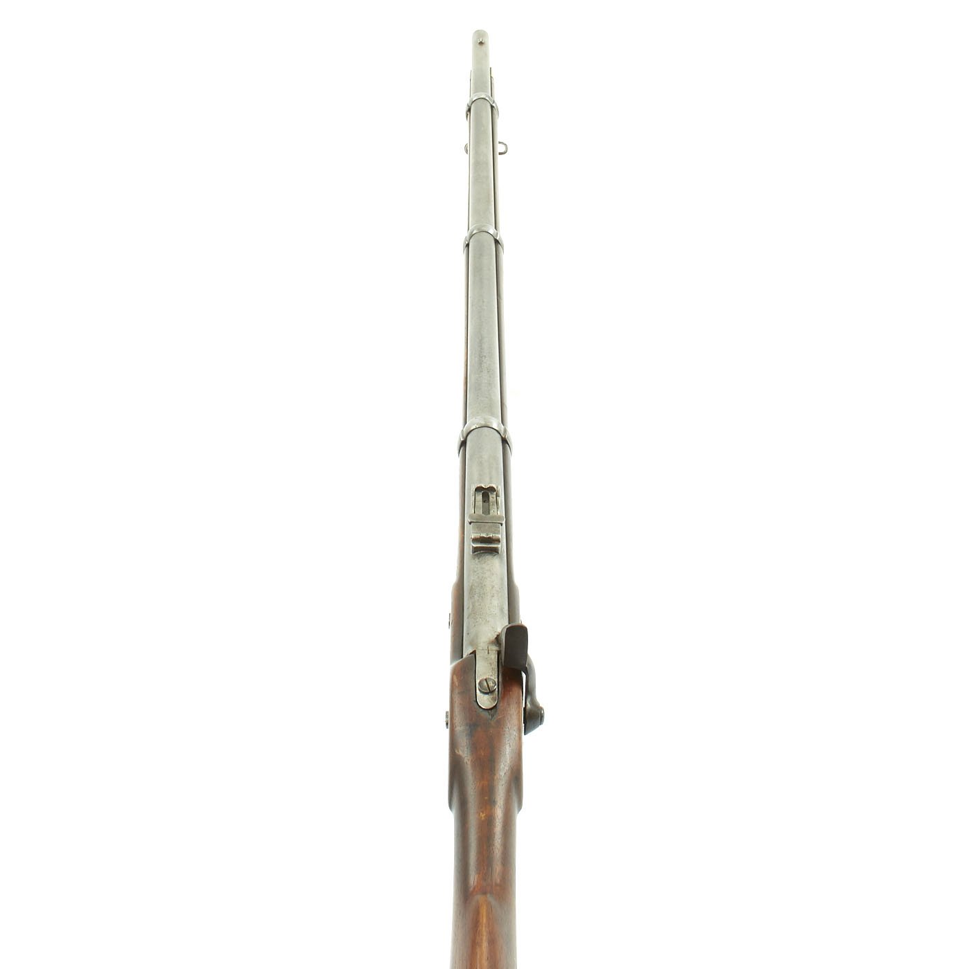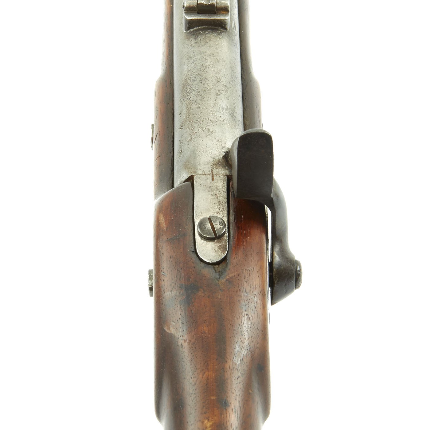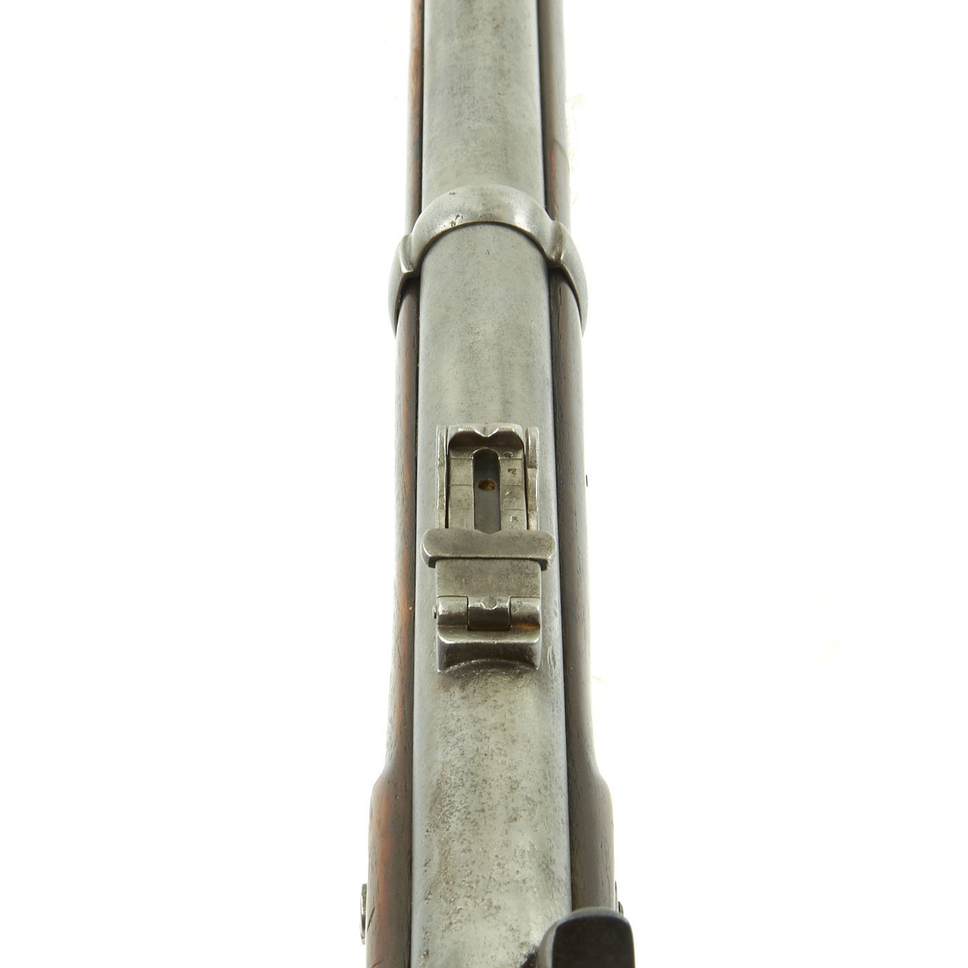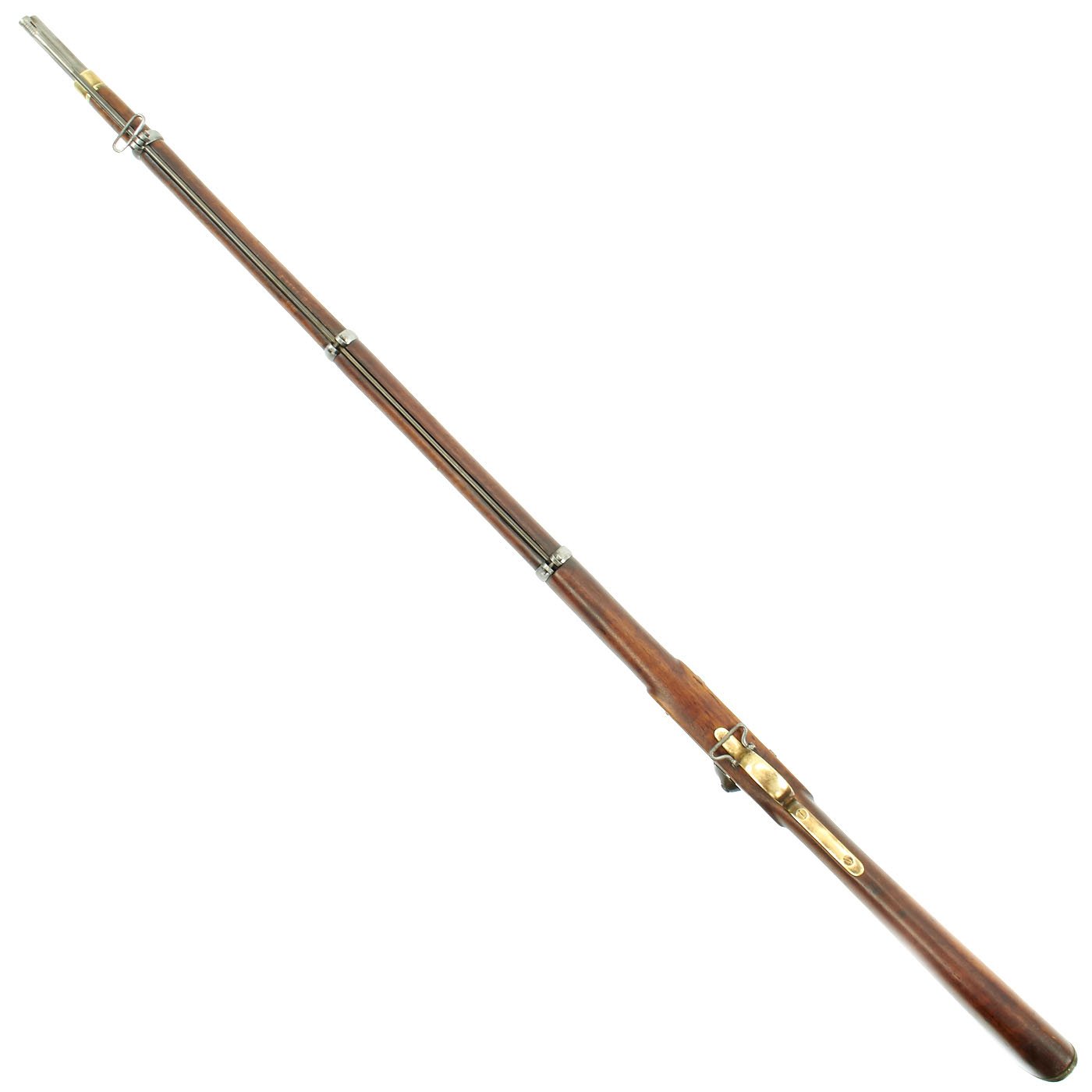 The wood is complete showing only a couple of age cracks, and has been fully restored and has a lovely color. The metalwork showing old light rust pitting overall. The sight slider is intact, as is the front sight, and the rifle still has both sling swivels and the original cleaning / ramrod. The bore is quite dark, showing little evidence of rifling, and a lot of fouling and corrosion. Lock holds correctly at half cock, firing at full cock, though the spring is a bit weak.