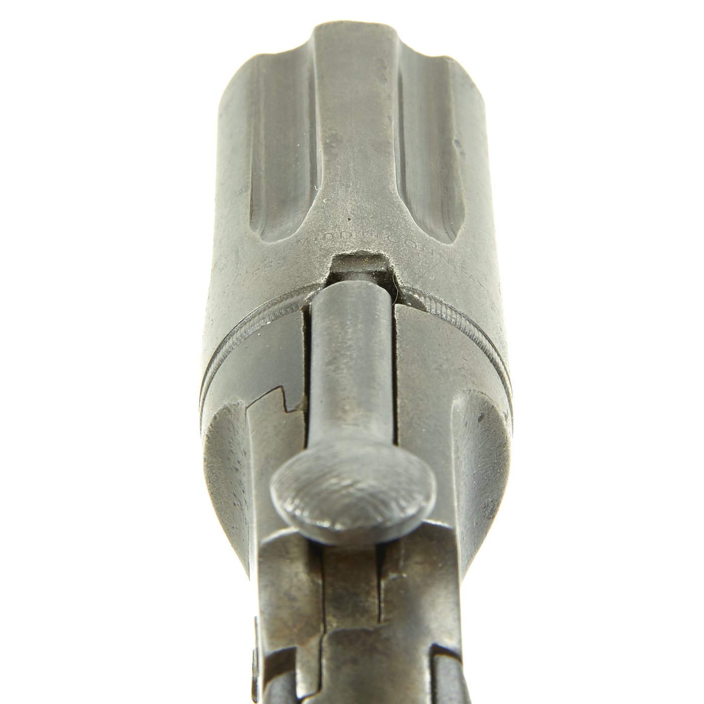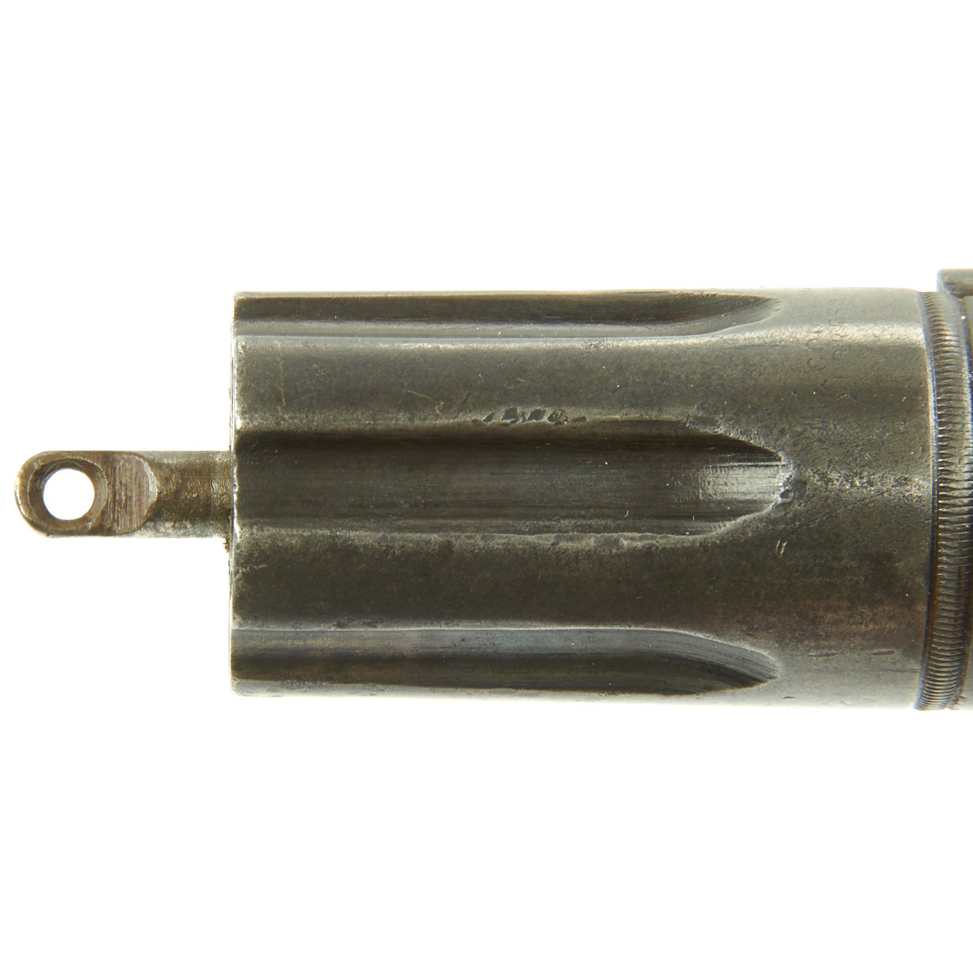 Alternatively there is a central axis pin in the center of the barrel cluster with a ring to the front. If this is set up with a trip wire attached to the ring, the weapon immediately fires all six charges simultaneously. Originally intended for game it was used as a Man Stopper too. In nice condition, the barrel cluster still showing the "1859" Patent date, but other markings, never very deeply embedded, have worn away. Even excellent examples are difficult to read.